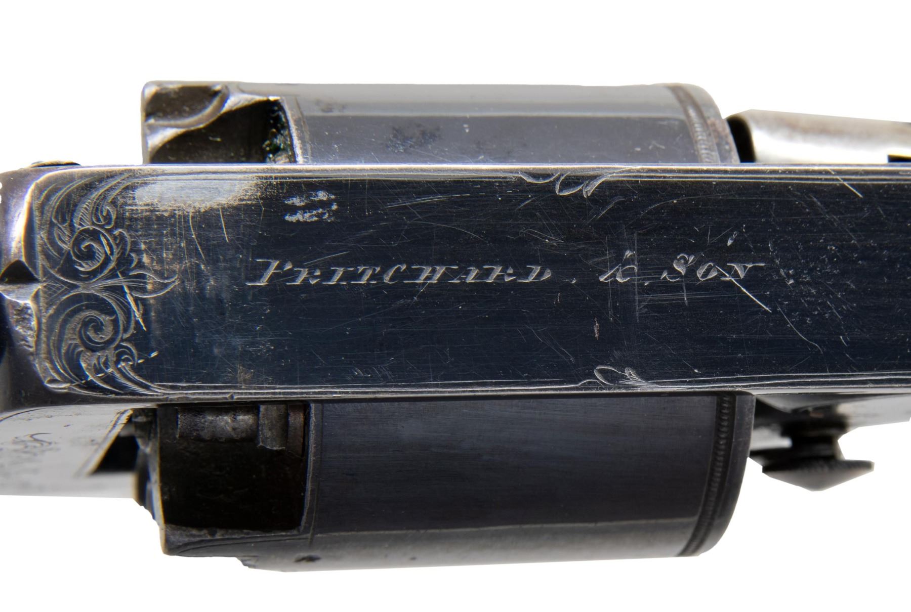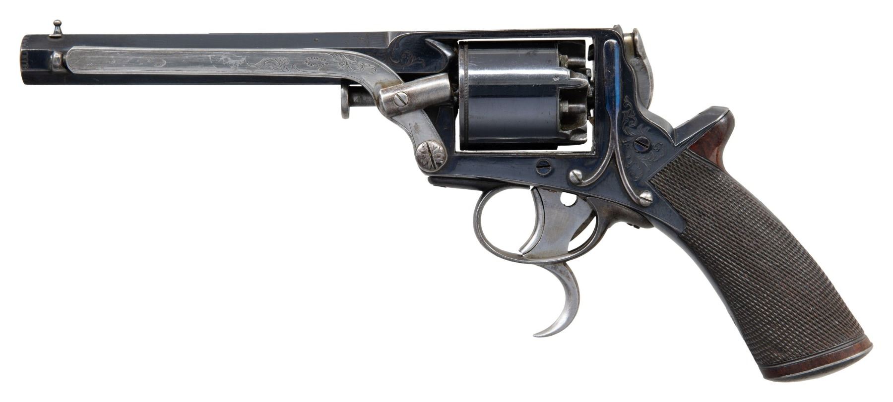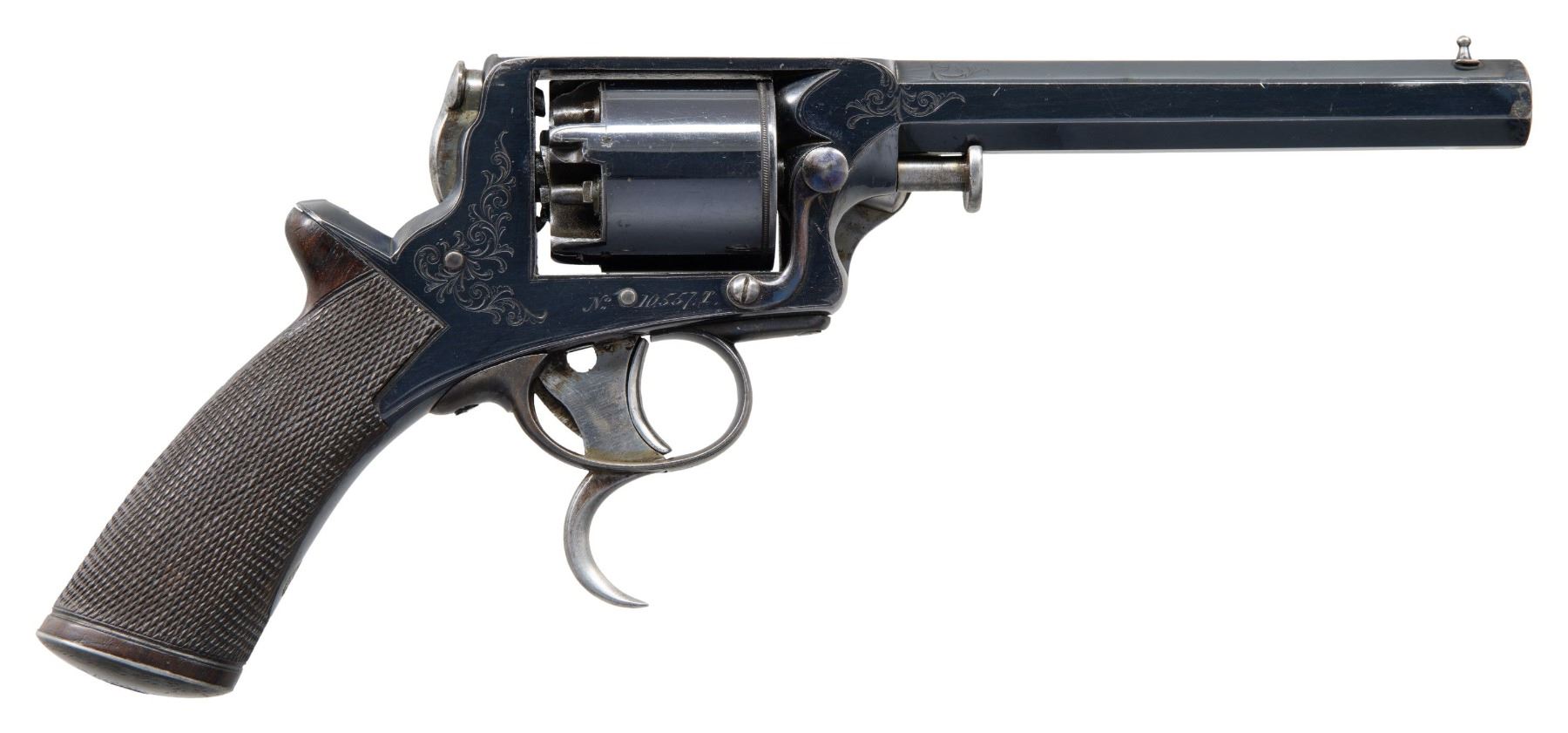 TRANTER REVOLVER. Cal. 54 bore (~.45). S# 10557 T. Standard configuration of 3rd model with no hammer spur, double action only, double trigger with spur, 6" octagonal unmarked barrel, integral notched rear sight, loading assembly marked "TRANTERS PATENT" attached to left side of frame which has scroll engraving en suite to frame, trigger guard, and butt cap, single trigger with spur. S# engraved on right side of frame "No. 10557 T", mounted with one piece checkered walnut grips. Revolver is housed in original green baize lined oak casing compartmented for revolver, bag flask, brass 54 bore 2 cavity bullet mold, green label G.D. cap tin, Tranter green label bullet tin, brass & rosewood loading tool, ebony handled screwdriver, pewter oiler, and patch tin. CONDITION: revolver is very fine overall as refinished, retaining virtually all refinished bright blue finish on barrel, cylinder & frame. Casing is very good overall with Arabic text label, accouterments are good. Revolver is mechanically fine, good dark rifled bore with light pitting. PROVENANCE: Rock Island Auction, lot 1389, 8-8-2016; Estate Collection of John "Jack" Dhooghe. (01-28223/JS). ANTIQUE. $3,000-5,000.