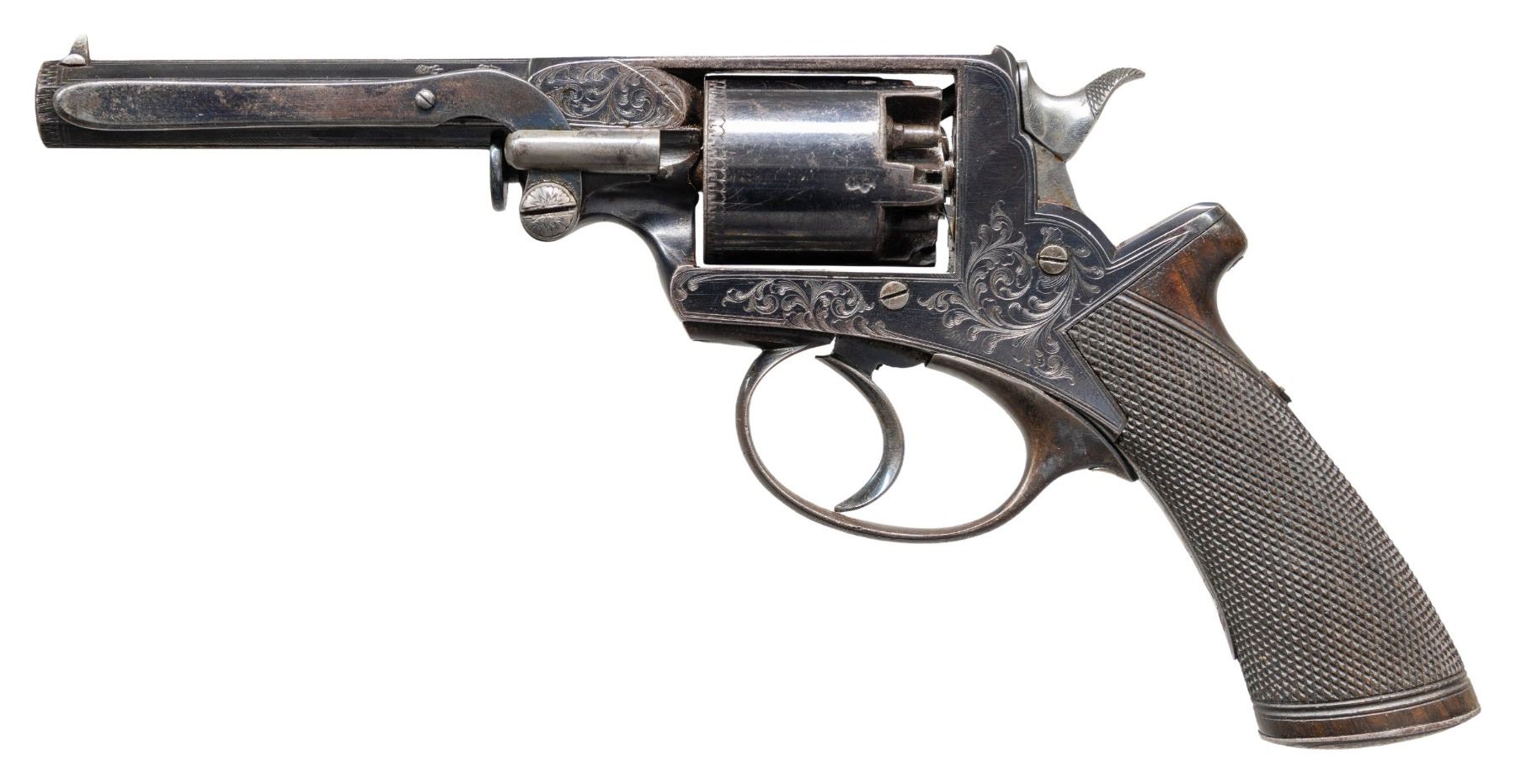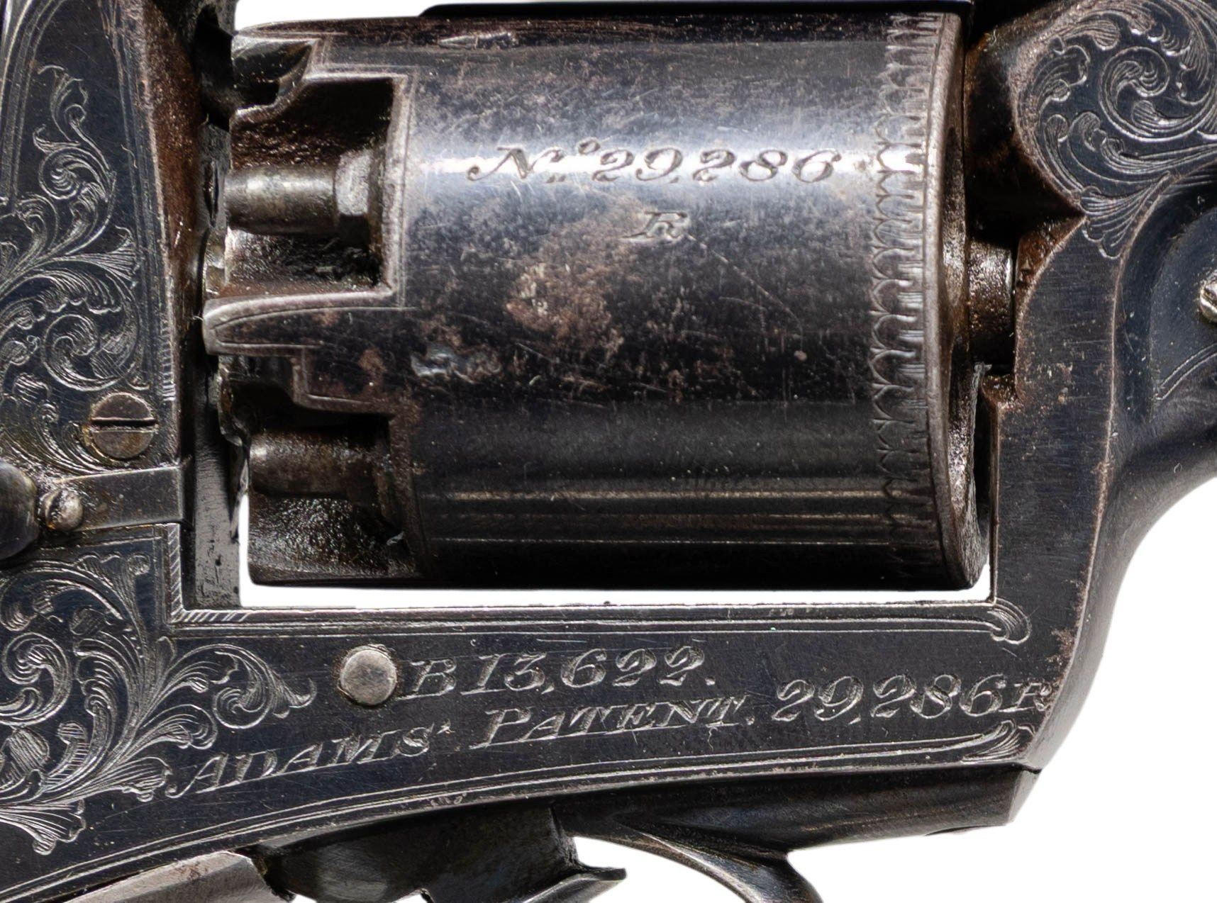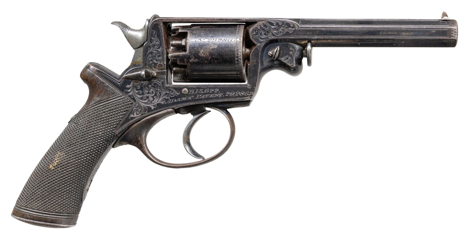 REVOLVER WITH CASE & ACCESSORIES. Cal. 34. S# 29286R. Bbl. 4 3/8". Adams' Patent double action revolver mfg. by Robert Adams (as per the "R" S# prefix). Top strap of the frame and bbl. are engraved with the retailer "OWEN POWELL. 59, HIGH ST, T SHEFFIELD". Right side of the frame is engraved "B13,622./ ADAMS' PATENT. 29,286R". Upper left quarter flat of the octagonal bbl. is marked with a British Crown/GP and Crown/V proofs, which are repeated around the circumference of the cyl. Sides of frame feature engraved double line borders with areas of foliate scroll engraving, which extends to the trigger guard bow, grip strap, grip tang, and oval pommel cap. Double line border engraving extends to each facet of the octagonal bbl., terminating in a band of decorative engraving at the muzzle. Loading lever, grip, and pommel screw heads are engraved with foliate motifs. Metal components exhibit a high polish blue finish overall, save for on the hammer, which is polished in-the-white. Frame is mounted with a 1-piece checkered wood wrap around grip. Dovetailed blade front sight with integral frame V-notch rear sight. Left side of frame/bbl. features a Kerr's patent loading lever. Matching S# "29286R" is present on the frame and cyl. Frame, cyl., trigger guard, loading lever, rear grip tang, and grip are matching via the assembly # "742". UNATTACHED ACCESSORIES: contemporary wood case featuring a brown felt lining and containing a brass C&JW Hawksley powder flask, nickel oiler, an unmarked 2-cell brass bullet mold, unmarked wood and brass cleaning rod, as well as a cloth percussion cap pouch. One side of the pouch exhibits a label denoting mfg. by Eley Bros., with an label on the obverse side that appears to read "Made exprefsly for/ ADAMS'/ PATENT REVOLVER.". CONDITION: frame/bbl. retains the majority of its original blue finish, exhibiting some areas of pitting on the sides and on the interior of the frame, most notably around the top strap. Trigger guard has mostly faded to a mottled gray/brown appearance, with some areas of mild surface oxidation. Hammer retains a bright appearance, exhibiting some spots of age related discoloration. Bore is relatively bright, exhibiting scattered spots and patches of mild to moderate pitting, while retaining good 3-groove rifling throughout. Action is out of time, with the hammer not holding when cocked and the trigger not resetting when pulled. Grip shows some superficial marks and impressions from handling and storage, but otherwise remains very good overall. Display case is very good overall. (01-28661/MLW). ANTIQUE. $2,000-3,000.