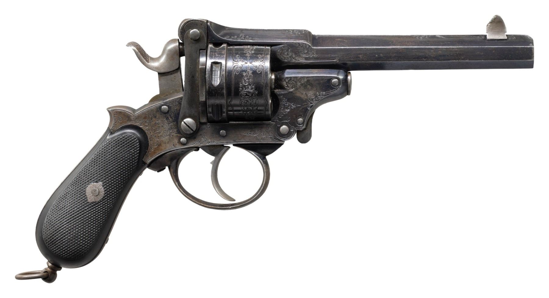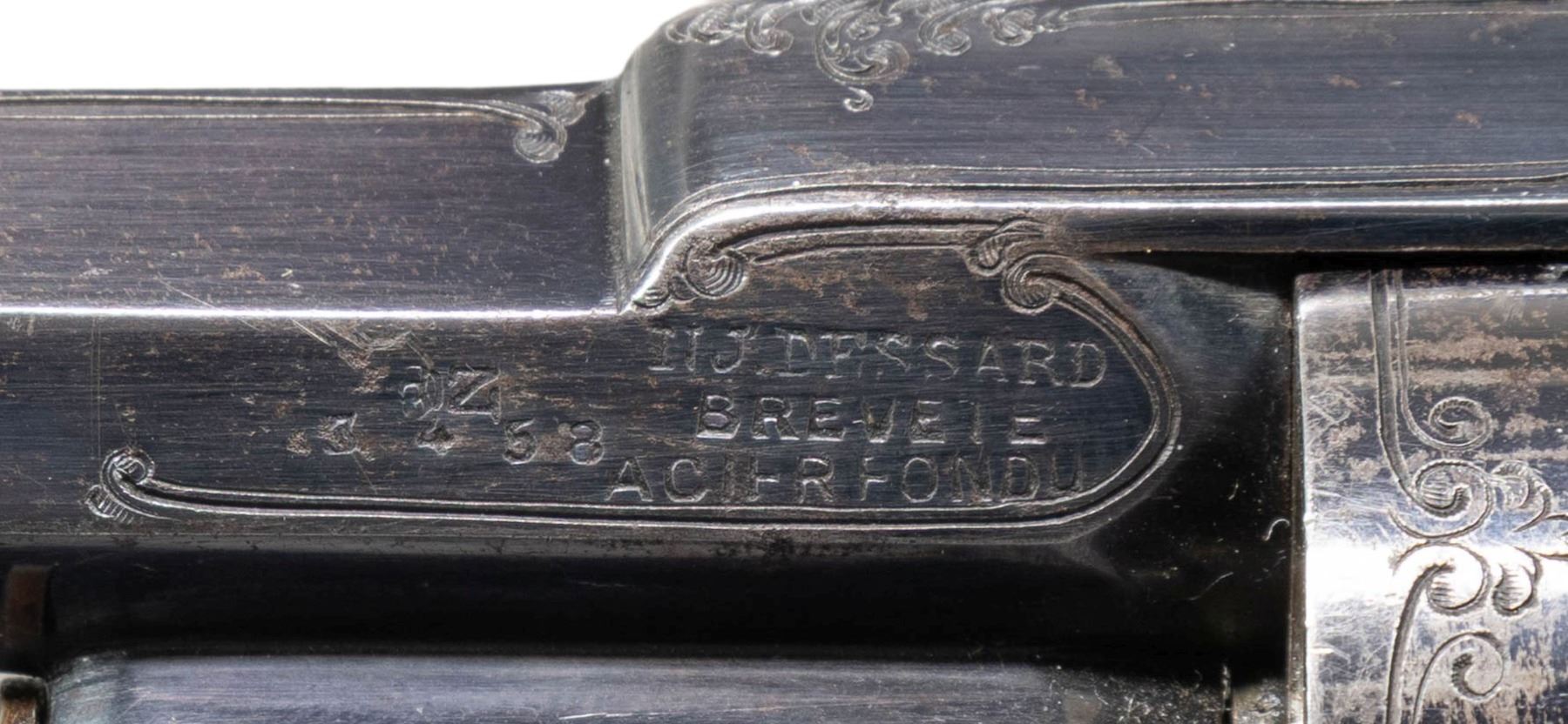 ACTION TOP BREAK REVOLVER. Cal. 9mm Rimfire. S# 3458. Bbl. 5". NJ. Dessard patent double action revolver. Left side of the bbl. is marked with a Crown/N proof (also present on side of cyl.) above "3458", followed by "NJ. DESSARD/ BREVETE" above "ACIER FONDU" (French: "CAST STEEL"). Front face of cyl. is stamped with a Crown/S proof, with a Belgian "E/ LG/ *" Liege proof marked on the side. Left side of frame is marked "LB" beneath the grip panel, with "+ B7" marked on the right. Sides of frame and top strap of the bbl. exhibit finely executed scrollwork breaking off in small sections along a double line border, which extends around the circumference of the rebated cyl. Grip straps and trigger guard bow feature interwoven line type engraving, with small sections of scrollwork. Frame, cyl., and bbl. exhibit a high polish blue finish, save for on the hammer, trigger, and several small parts, which are in-the-white. Frame features a distinct contour usually found on pinfire revolvers of the era, and is mounted with 2-piece checkered black hard rubber grips, featuring a lanyard swivel and loop on the butt. Interior of grips are hand etched with an arrow and "/", with the left panel also exhibiting a lightly etched "WK". Top strap of bbl. features a pointed rib. Dovetailed blade front sight with deeply grooved U-notch rear sight on rear of the top break bbl. CONDITION: metal components retain large amounts of their original high polish blue finish, showing light to mild edge wear, with areas of wear (predominately on the grip straps, trigger guard, as well as on the right side of the frame and bbl.) that are fading to pleasing gray and brown patinas. In-the-white parts show some scattered spots of age related discoloration. Bore is bright, exhibiting scattered spots of moderate pitting, while retaining good rifling throughout. Proper manual mechanics in SA and DA modes. Grips show light to mild smoothing, as well as some superficial marks from handling and storage, but otherwise remain sound. A very attractive example of a Dessard patent revolver. (01-28563/MLW). ANTIQUE. $1,200-1,800.