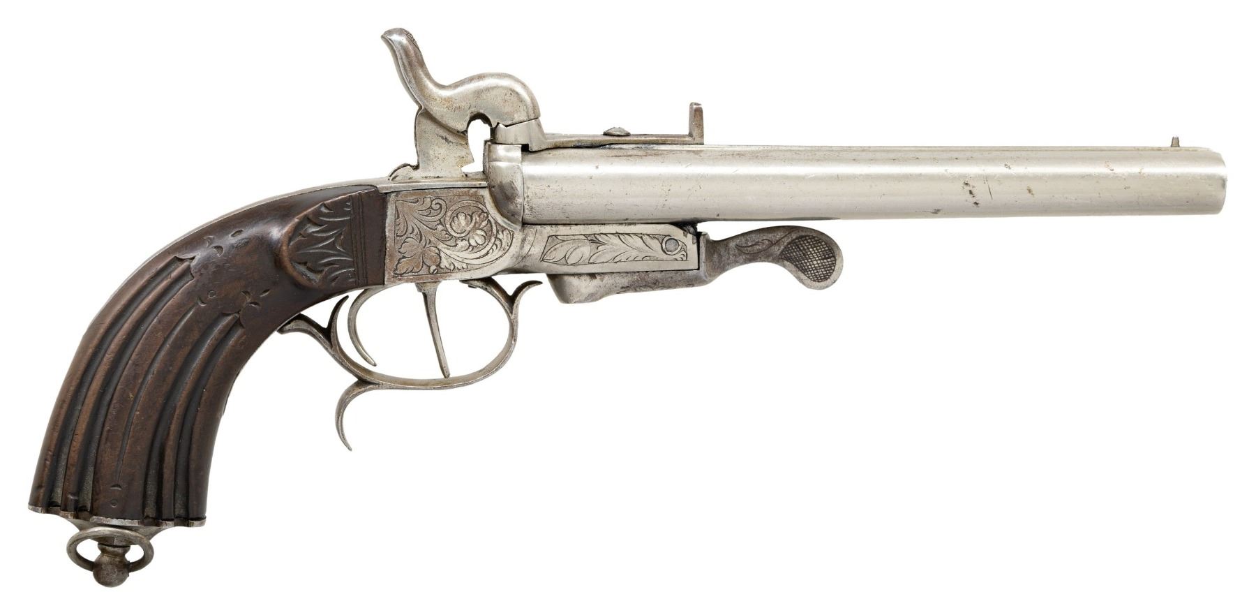 Cal. 15mm Pinfire. S# 167. Bbl. 7 5/8". SxS break action pinfire howdah pistol produced in Belgium by an unknown mfg. Rear face of bbls. and left side of frame exhibit Belgian proofing. Sides of the frame feature panels of foliate scrollwork, with decorative intertwining line and foliate motifs engraved on the rear grip strap, trigger guard bow, and bbl. lever. Metal components exhibit a nickel plated finish overall. 1-piece grooved wood grip with faceted pommel terminating in a lanyard stud and ring. Cone style front sight with V-notch rear sight. Dual triggers consisting of 1 straight and 1 curved trigger, with 1-piece trigger guard fingering a finger curl at the rear of the bow. CONDITION: metal components retain good to large amounts of their nickel plated finish, showing areas of wear and flaking that show through to a gray patina. Mirror bores, exhibiting a few dings and a couple of small spots of light pitting, while retaining strong rifling throughout. Proper manual mechanics. Grip shows scattered superficial handling marks, as well as flaking to its varnish finish, with an apparent repaired chip present at the rear of the upper frame tang. PROVENANCE: From the Buckstix Collection. (01-28598/MLW). ANTIQUE. $800-1,200.