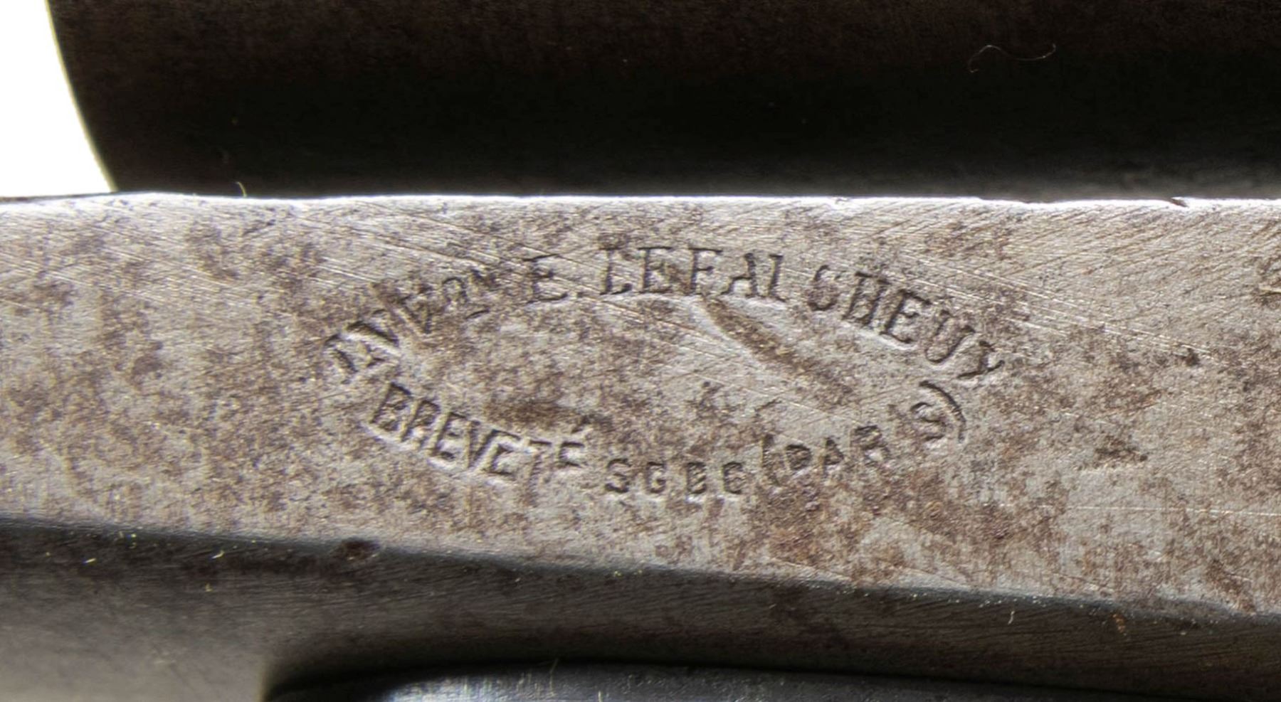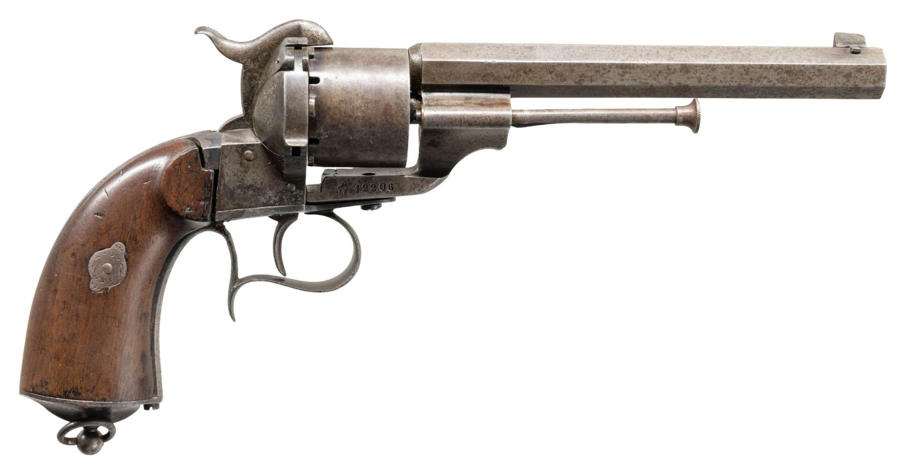 Cal. 9mm Pinfire. S# 12206. Bbl. 6 3/8". Single action pinfire revolver mfg. by Eugene Lefaucheux. Left side of the frame appears to be marked "IN VON E. LEFAUCHEUX/ BREVETE SGDG (PAB S)". Right side of the frame is marked with a "broken revolver" above "LF" (Lefaucheux workshop logo) followed by the S#. Frame is mounted with 2-piece plain wood grips, featuring a faceted butt with a lanyard swivel and ring. Dovetailed blade front sight with notched rear sight on hammer. Matching assembly # "52" or "520" is present on the frame, loading gate, cyl., and bbl. CONDITION: metal components retain scant traces of their original blue finish with the balance having faded to a mottled gray patina, exhibiting scattered spots of light pitting and age related discoloration. Near mirror bore, exhibiting light to mild pitting and oxidation around the muzzle area. Proper manual mechanics, although the hammer spring is weak and the hammer does not always lock in the rearward position. Grips show scattered marks and impressions from handling and storage, but otherwise remain sound. PROVENANCE: Estate Collection of Nicholas Apergis. (01-27454/MLW). ANTIQUE. $700-1,000.