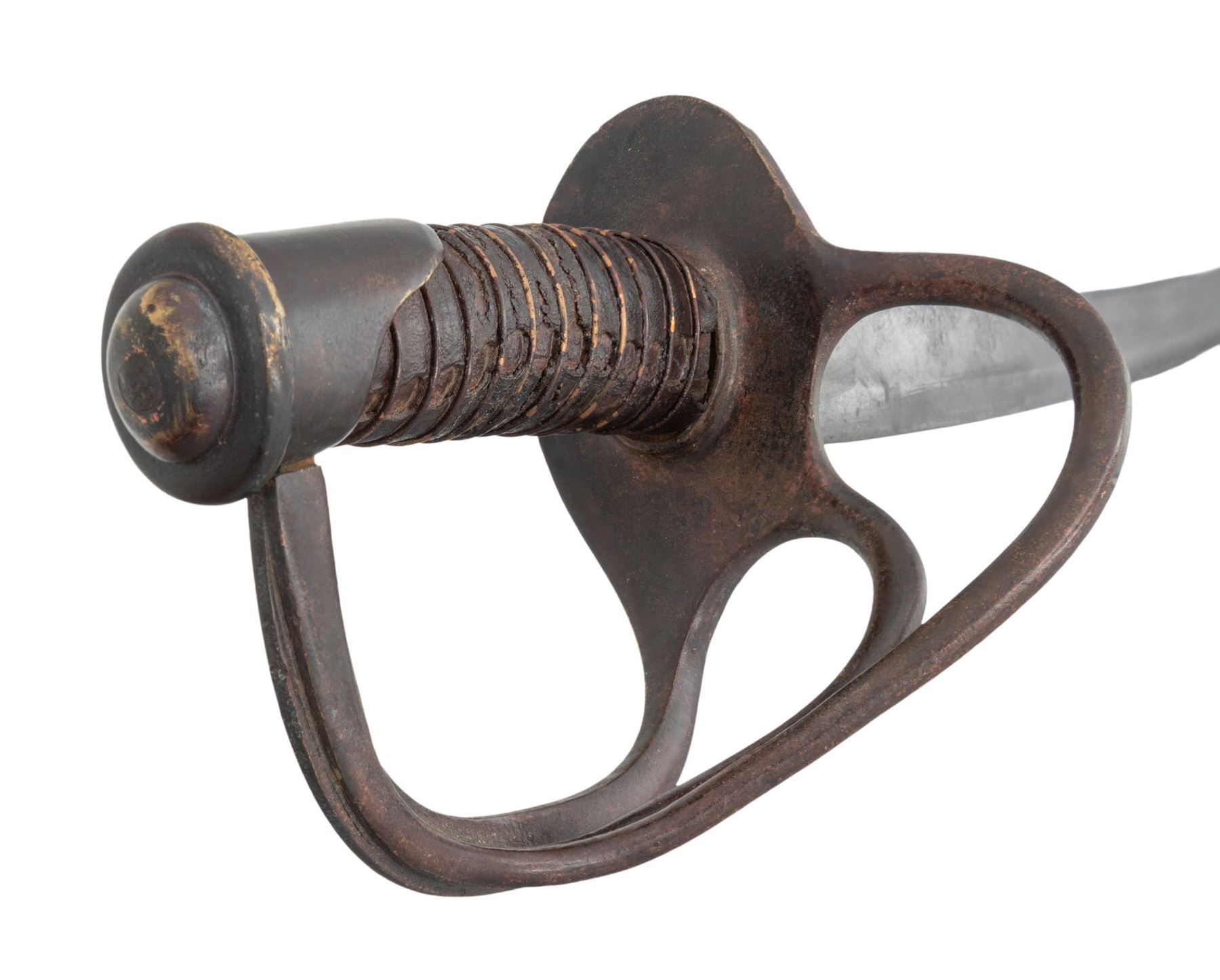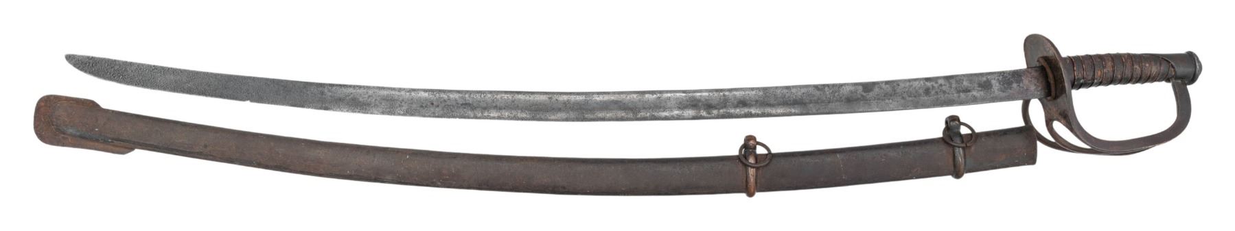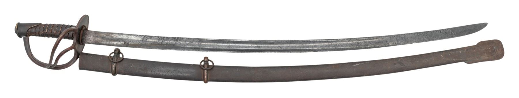 This classical Confederate Cavalry saber measures 42 1/4" overall with a plain 34 1/2" blade featuring a single unstopped fuller. Coppery brass hilt with a standard two branch guard leading to a crudely formed phygian cap pommel. Leather grip with single copper wire wrap. Iron scabbard with a crude lap seam on lower edge. The scabbard features brass loops with iron suspension rings and an exaggerated iron drag. CONDITION: blade has a mottled gray patina with evidence of light pitting and a few small nicks to the edge. Hilt has a dark patina. Grip leather is about 70% and noticeably shrunk. Wire is complete. Scabbard has an oxidized finish and the loops have a dark mustard patina. (02-26066/BF). NON-GUN. $2,000-2,500.