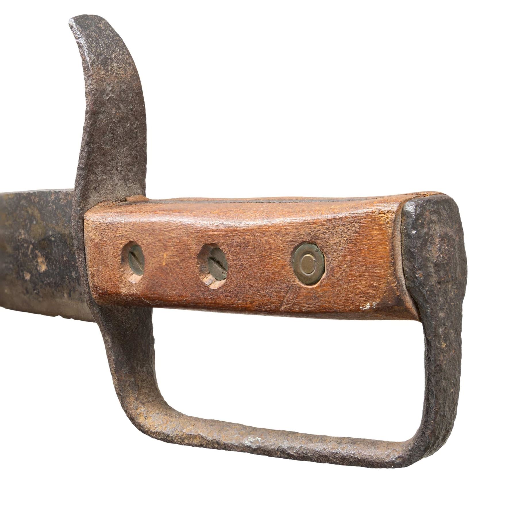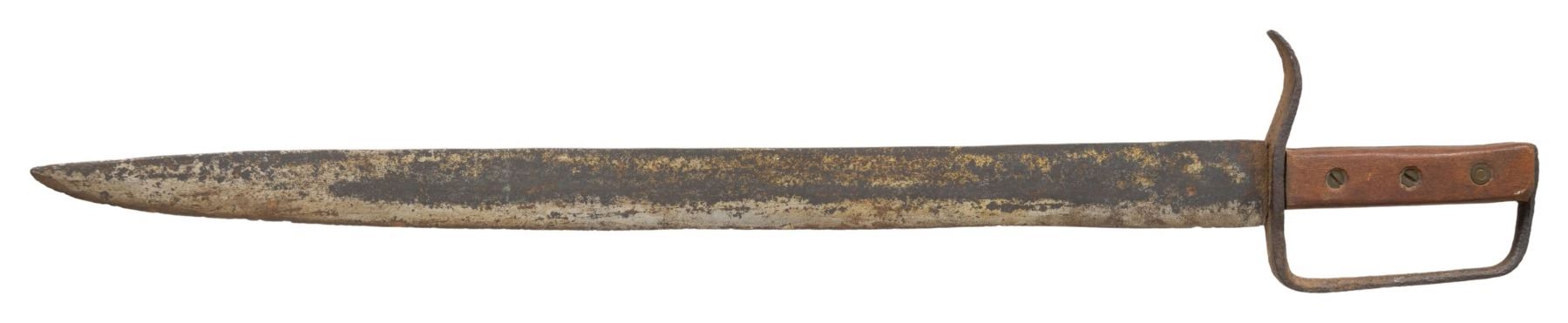 27.75" overall, 22.5" spearpoint with slight clip blade, .25" thick at ricasso, full tang, replaced wood slab grips. CONDITION: good overall, blade has grinding, sharpening, pitting, guard is heavily pitted, wood grips are newer additions retained by 3 brass screws & ferrules. PROVENANCE: ex-Tommy Knox collection. NON-GUN. (02-25897/JS). $800-1,200.