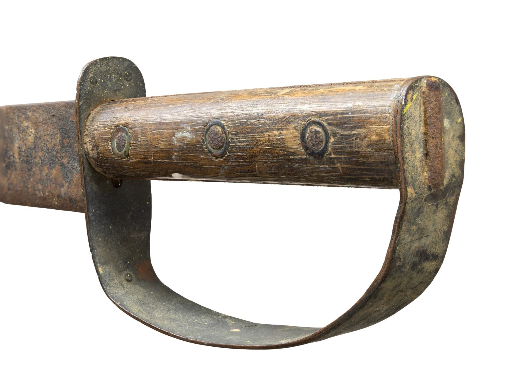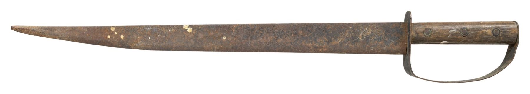 28.5" overall, 22" tapered blade, .20" thick at ricasso, riveted 2-layer brass D-guard, full tang, iron pin & brass washer attached wood slab handle. CONDITION: good overall, "as found" iron patina, point in bent & curled, scattered paint spatter. PROVENANCE: found in Texas flea market, ex-Tommy Knox collection. (02-25898/JS). NON-GUN. $1,000-2,000.