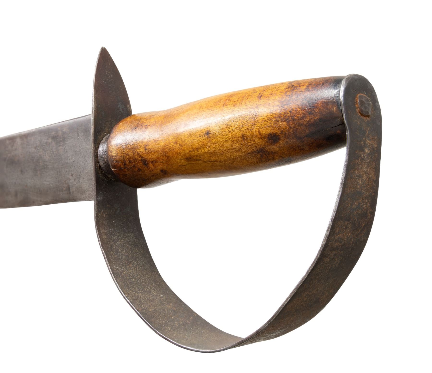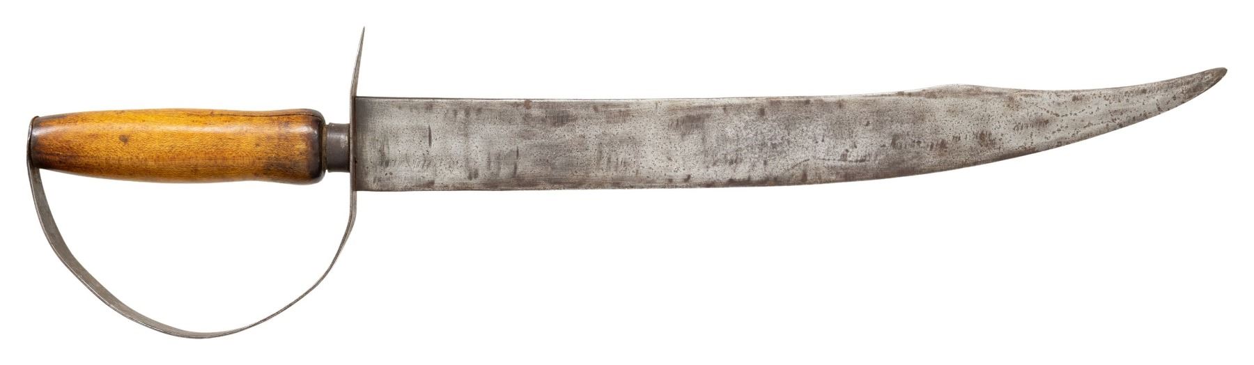 19.5" overall, 14.25" clip point blade, 4" sharpened clip, .22" thick, 1.5" wide, tool handle with iron ferrule, thin tapered sheet iron guard. CONDITION: very good overall, "as found", iron patina, forging flaws, light pitting. PROVENANCE: Bob Alispones estate collection. (02-26041/JS). NON-GUN. $1,500-2,000.