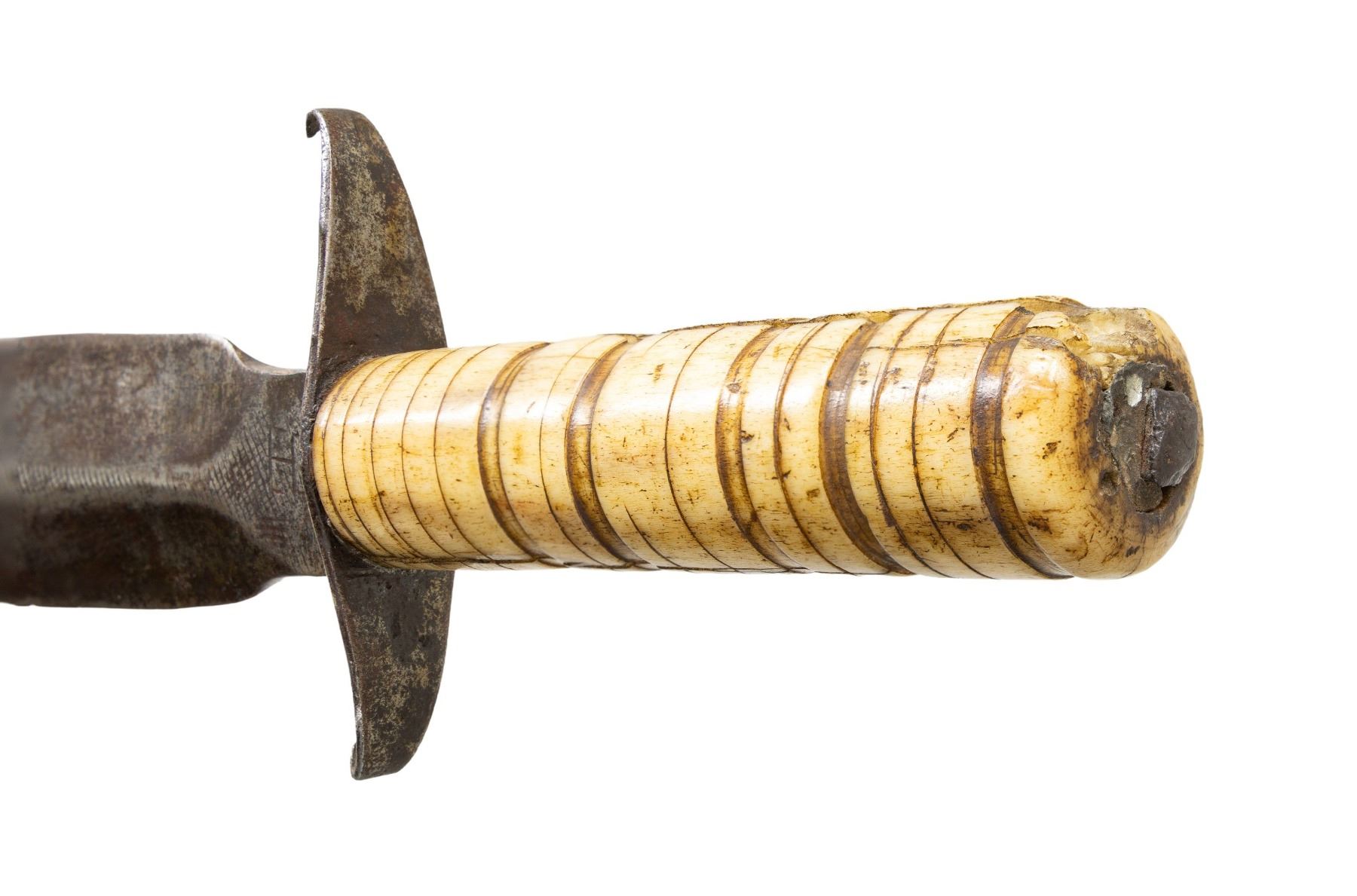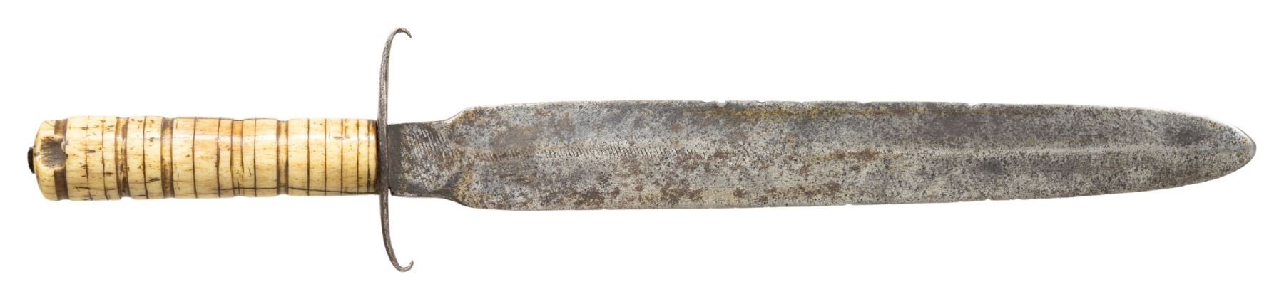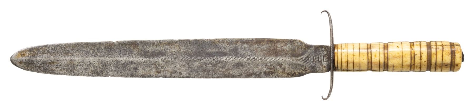 MADE FROM FILE. 15.5" overall, 11" double edged blade .30" thick ricasso, carved turned bone handle, 3" forged cross guard with turned down quillons, lead around peened tang. Pictured on page 147 of James Johnston's "ACCOUTREMENTS II". Interesting early American knife that maker signed "JH" on ricasso. CONDITION: very good overall, "as found", blade well worn, rounded point, still sharp with nicks in cutting edge, large age crack through handle. PROVENANCE: James R. Johnston collection. (02-26007/JS). NON-GUN. $800-1,200.