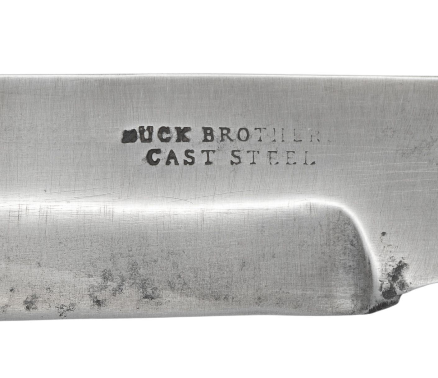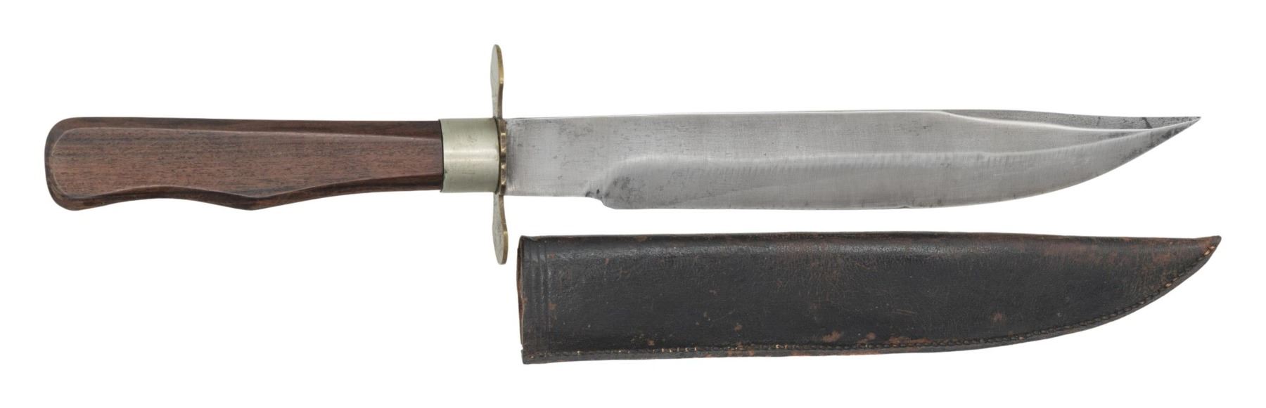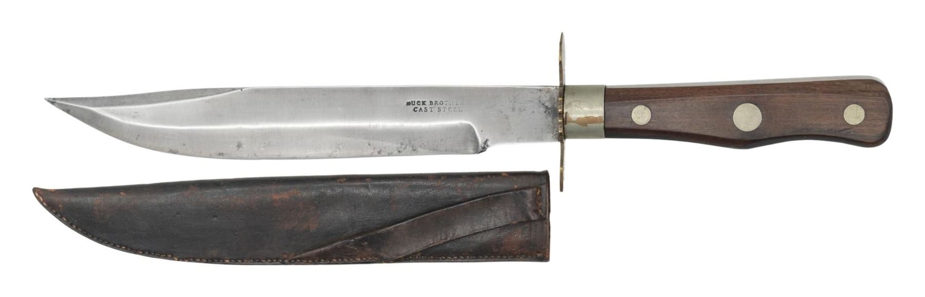 This rare and desirable knife measures 13 3/4" overall with an 8 1/2" blade with a 3 1/2" false edge. John, Charles, and Richard Buck were born and trained in knifesmithing in the famous British city of Sheffield. They established themselves in the town of Worcester, Massachusetts around 1850 and produced some of the finest side knives carried by Union soldiers in the American Civil War. This example is stamped on the blade horizontally "BUCK BROTHERS CAST STEEL". There is a double lobe crossguard that appears brass but was likely plated at one time. The ferrule and rivets also appear to be plated brass. The 1-piece grip appears to be tightly grain walnut and the sheath is leather with a diagonal belt loop. UNATTACHED ACCESSORIES: information about Buck Brothers knives. CONDITION: blade shows light wear with a very tiny chip to the edge. Hilt shows light wear except for a small splinter missing that extends from the top for about 1". Sheath is quite strong and shows very light wear. (02-25888/BF). NON-GUN. $3,000-4,000.