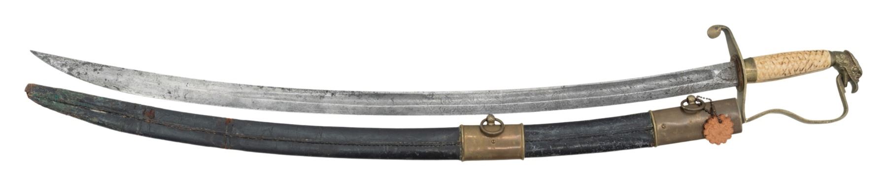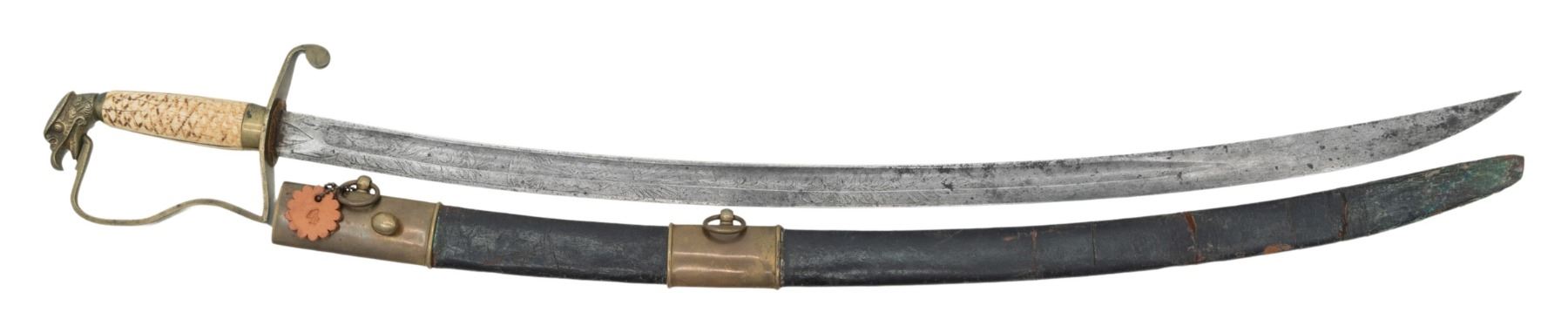 A good example of a late Federal period eagle head militia officer's sword measuring 33" overall with a 27 3/4" etched single fullered blade. The etching includes mostly foliate motifs with a large American eagle and a stand of American flags. Brass hilt with a simple unadorned guard and a drop quillon. Crude eagle head pommel with a cross hatched bone grip. Brass mounted leather scabbard with both ring and frog stud mountings. CONDITION: blade has a spotty light gray patina with light etching. The hilt is a bit misshaped and is somewhat loose. Grip is generally solid with a few tight age cracks. Scabbard is fairly solid with a flex point 8" up from the tip. The bottom mount/drag is missing. PROVENANCE: Estate Collection of Nicholas Apergis. (02-24697/BF). $500-750.