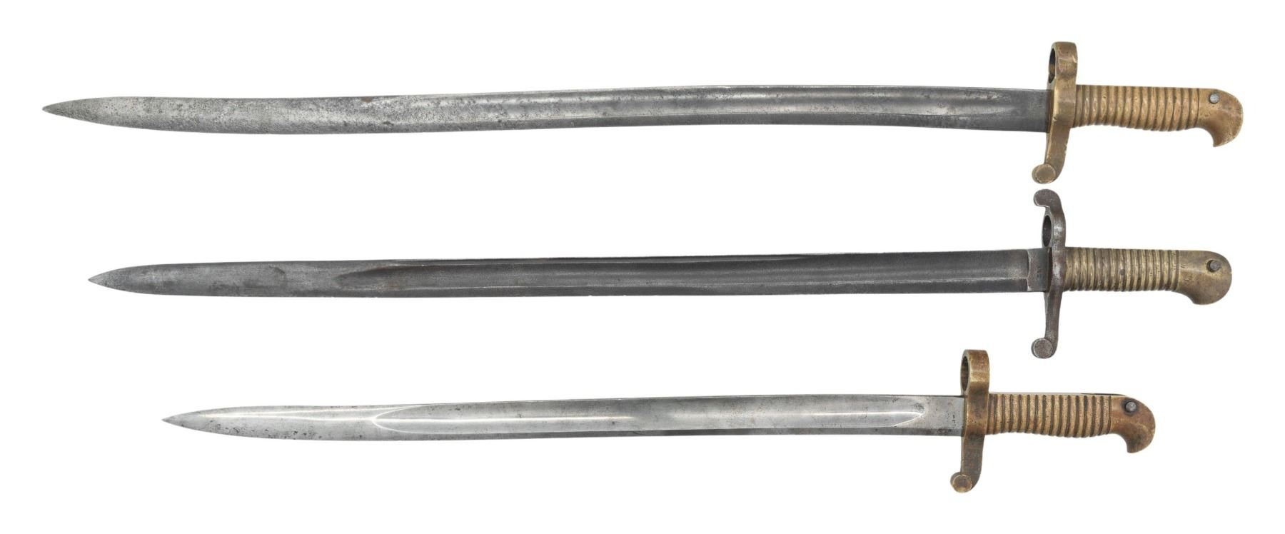 1) A Colt revolving military rifle and artillery carbine bayonet. Overall length 28 3/4". Blade length 24 1/8". Plain blade marked at the ricasso "S&K". Iron crossguard. 2) American saber bayonet. Overall length 25". Blade length 20". Brass hilt stamped on the flat "B.H.". 3) American saber bayonet. Overall length 30 1/2". Blade length 25 3/8". Blade is stamped on ricasso "1861". Brass hilt with flat marked "C 5400". CONDITION: bayonets generally have gray blades with a deep rich patina on the hilts. No scabbards. (02-26076/BF). NON-GUN. $600-900.