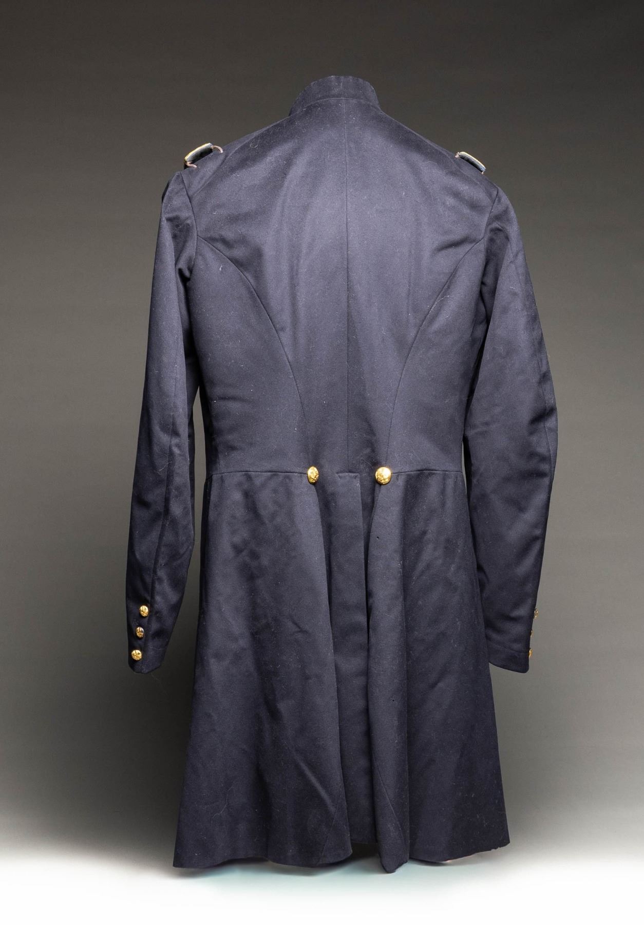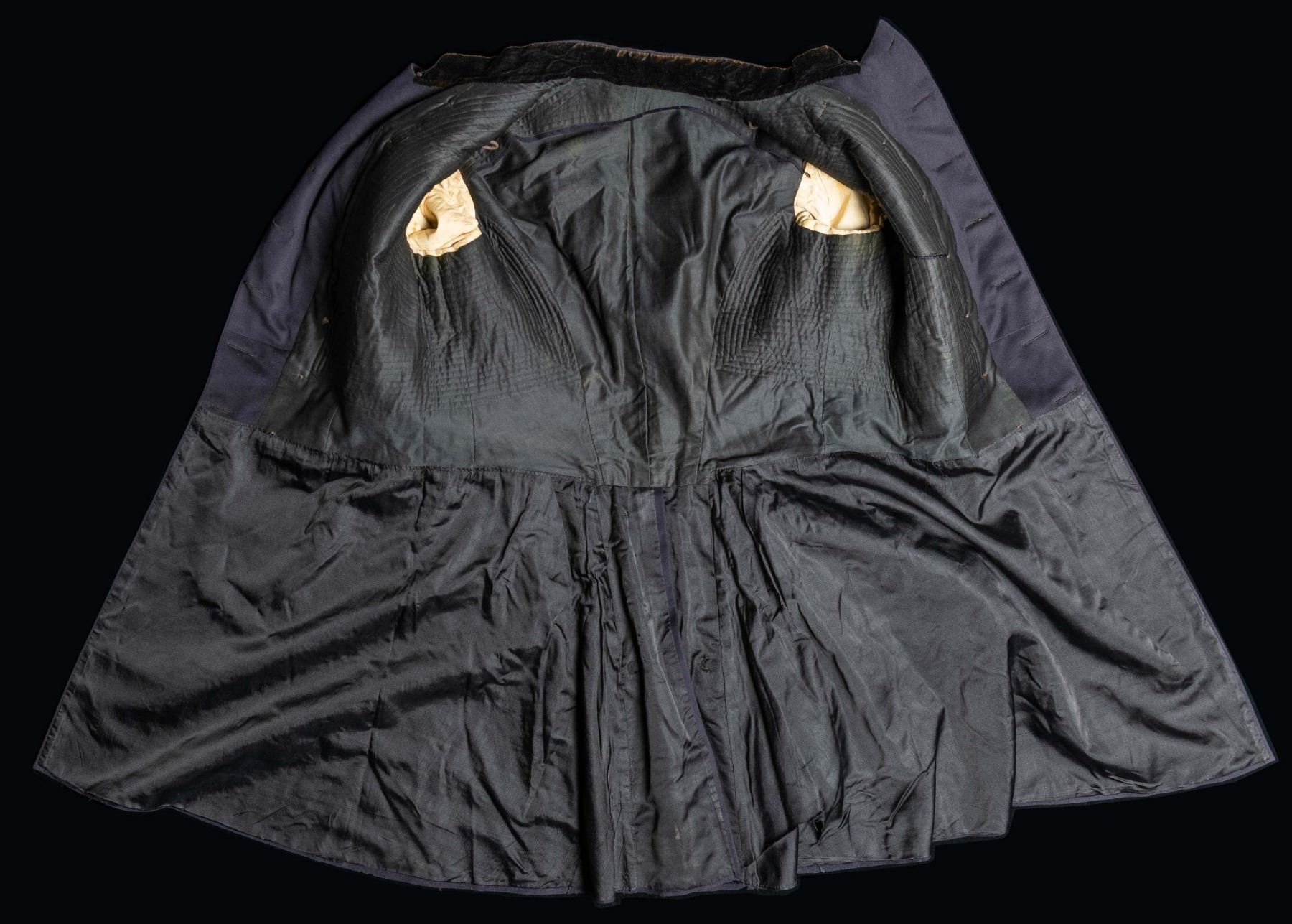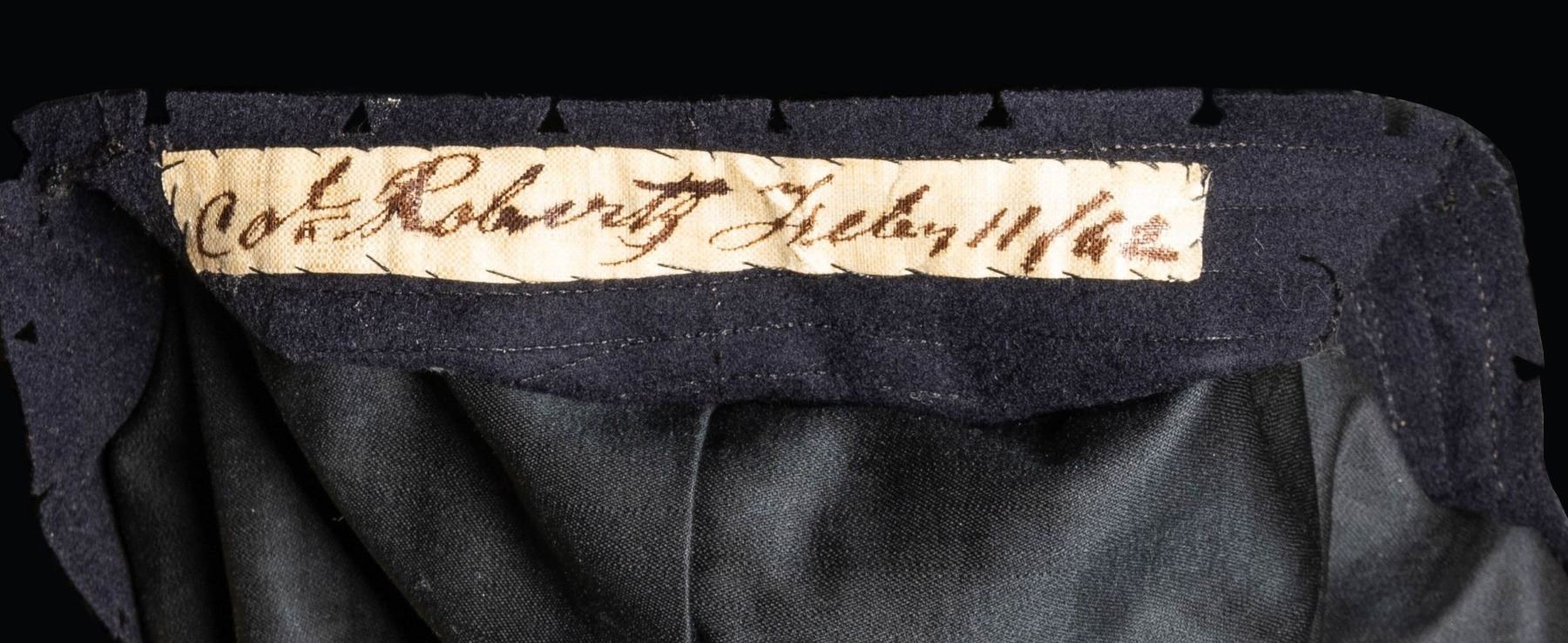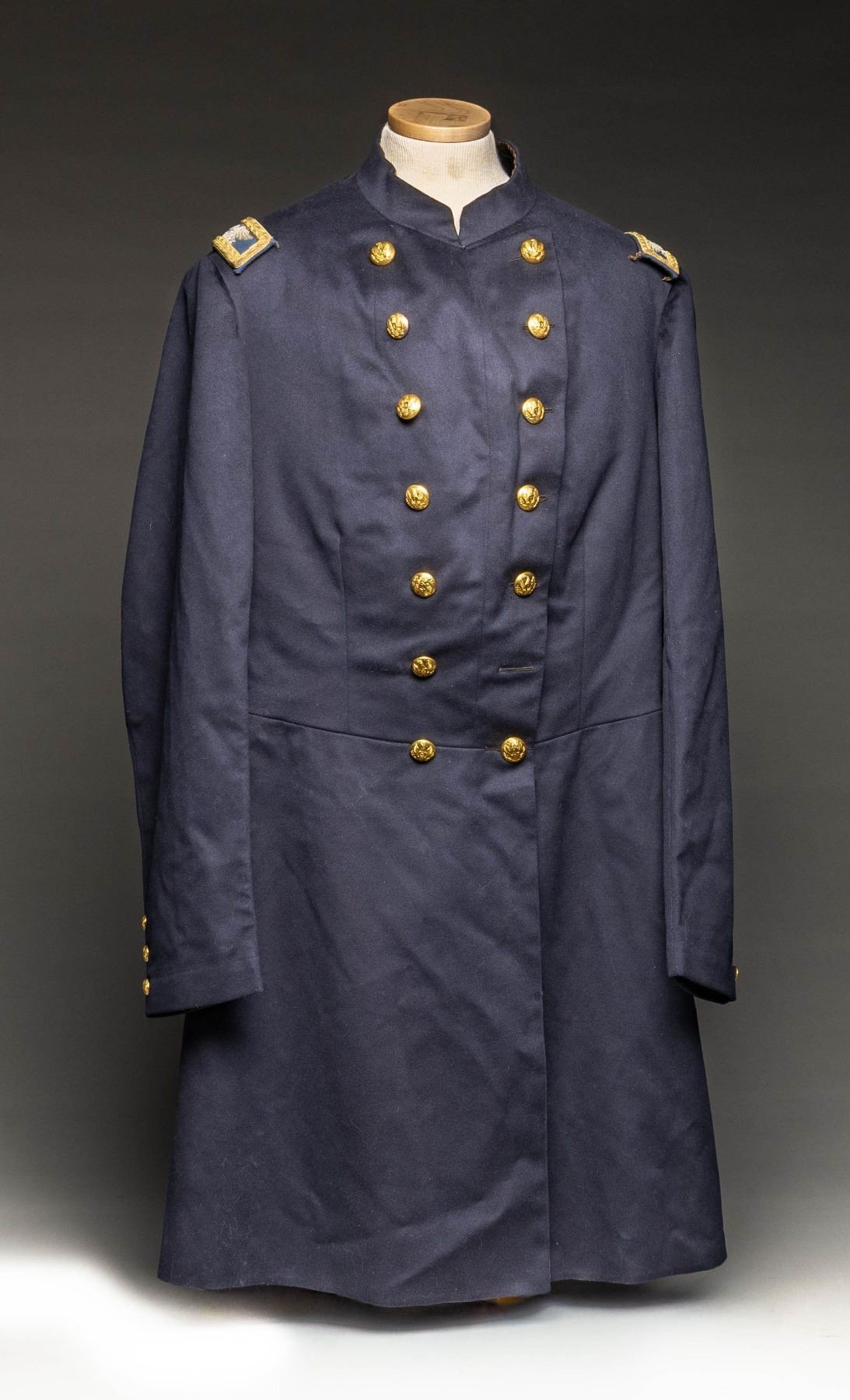 G. W. ROBERTS FROCK COAT, KIA MURFREESBORO, DEC. 31, 1862. George Washington Roberts (October 2, 1833 – December 31, 1862) from a prominent Pennsylvania family, was Yale graduate, and prominent Chicago attorney who helped raise the 42nd Illinois Infantry where he served as Lt. Col till December 1861, when he became colonel. His regulation double-breasted frock coat has his name nicely inked under collar and dated Feb. 11, 1862.On the night of April 1, 1862, Roberts fought in the Battle of Island Number Ten, in which he distinguished himself by leading fifty troops under cover of darkness to raid a Confederate shore battery and spike its guns. Roberts fought in Mississippi and Tennessee till autumn when General Rosecrans put him in command of Philip Sheridan's 3rd Brigade, 3rd Division, 20th Army Corps commanding the 22nd Illinois, 27th Illinois, 42nd Illinois, and 51st Illinois Regiments.At the Battle of Stones River, Sheridan's division caught the brunt of the Confederate army's opening assault on the morning of December 31, 1862 in area named "hell's half-acre". As the Confederates pushed back the Union army, Roberts, on horseback, personally led a bayonet charge that stabilized the line, giving Sheridan time to regroup. As Roberts' brigade conducted a fighting retreat, repulsing charge after charge from the rebels, the colonel was shot three times. Roberts died moments after ordering that he be tied onto his horse to lead yet another counterattack. He was the last of Sheridan's three brigade commanders to die at Stones River—Colonel Frederick Schaefer and Brigadier General Joshua W. Sill had been killed earlier that day. Roberts' brigade suffered 566 casualties, but the Army of the Cumberland held the field.The Confederate Army of Tennessee interred Roberts' body with military honors on the field where he fell. A large stone with a rough-hewn inscription was placed atop his hastily dug grave. Roberts' remains were later disinterred and returned home for burial.General Sheridan wrote in his memoirs that Roberts "was an ideal soldier both in mind and body. He was young, tall, handsome, brave, and dashing and possessed a balanced wheel of such good judgment that, in his sphere of action, no occasion could arise, from which he would not reap the best results."His regulation double-breasted general's frock coat retains all but one of its original buttons and original tie-down colonel straps are excellent. This well-tailored frock made in Nashville has fine velvet lined collar, fully padded interior lining, heavy gilded eagle "I" buttons. UNATTACHED ACCESSORIES: vintage engraving of Col. Roberts. CONDITION: frock coat is fine, tight seams and complete other than one missing button, superior to vast majority of surviving Civil War frock coats. (02-24203/JS). NON-GUN. $12,000-18,000.