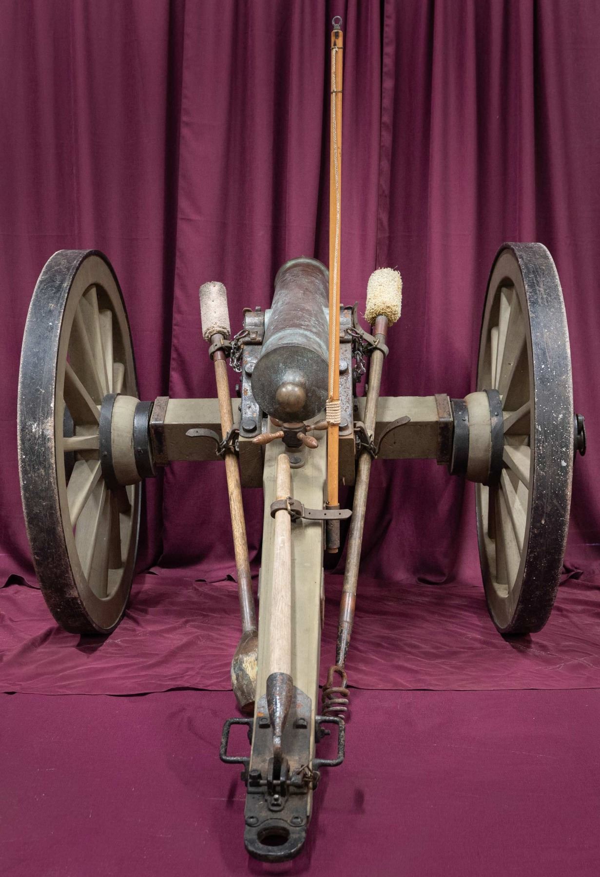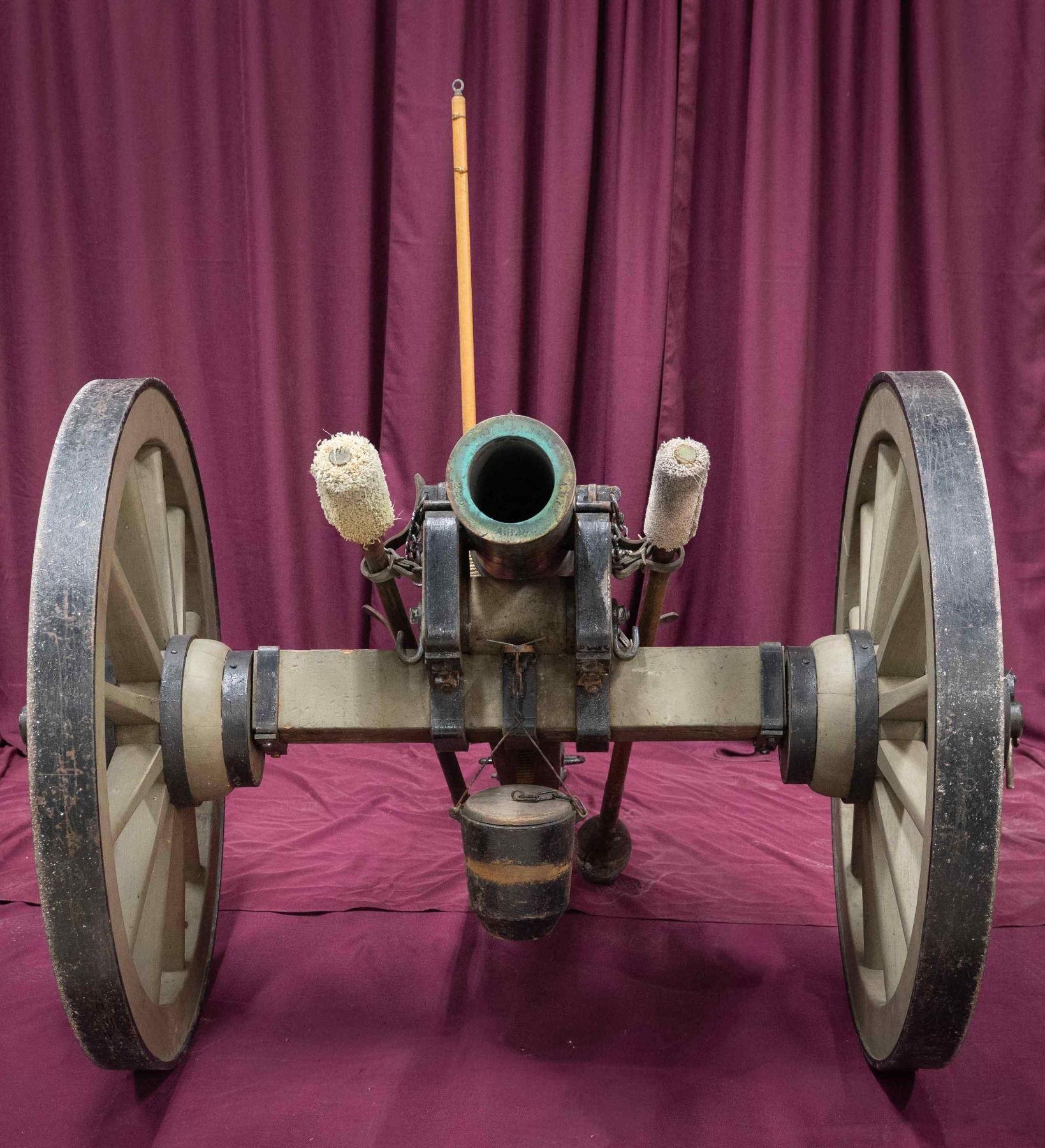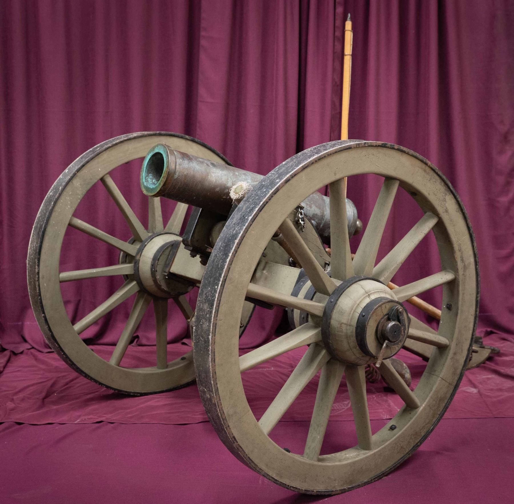 Registry # 31 Cal. 4.27” (12 pounder). Model 1835 US mountain howitzer bronze gun mounted on good restored prairie carriage. These "petite" cannon are among the few Civil War cannon that are small enough to be displayed in gun room. 38” overall, muzzle face marked “AMCo” (Ames Manufacturing Company, Chicopee, Mass); “1863” date of manufacture “No. 31” (31st Mtn. Howitzer made at Ames in 1863), “225” (225 pounds); “ABD” (inspector-Alexander B. Dyer). Rimbase number “21”. This gun was proofed February 17, 1863 and is one of about 40 documented, most in museums. These small guns were used in many engagements in the civil war, especially in mountainous terrain. These guns were designed to fire anti-personnel ammunition, explosive shell with case shot, or canister. Total weight on carriage is about 500 pounds. CONDITION: very good overall, tube has smooth mixed bronze patina, carriage is very good restoration with some small metal parts being new production. PROVENANCE: Ford Museum, Dearborn, MI. From the Buckstix Collection. (02-26020/JS). $40,000-60,000.