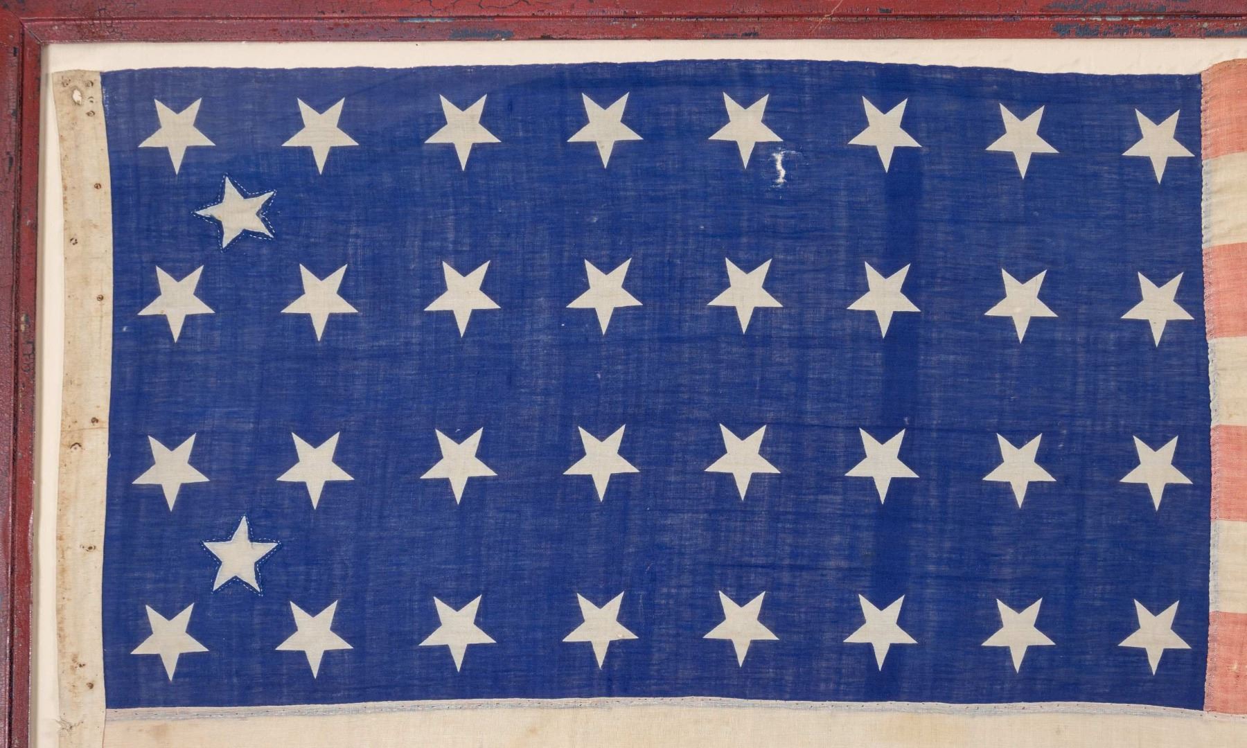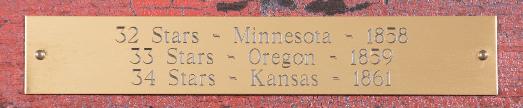 SEWN ONTO THE CANTON.This grand 32 star flag measures approximately 81" x 42" and is archivally housed in a folksy red painted wooden frame that measures 88 1/2" x 49". This attractive and significant piece of mid-western history was created in 1858 to acknowledge the State of Minnesota joining the Union. The flag has a printed canton and 2 sections of printed stripes. The canton is hand sewn to the stripes and the stripes have a hand sewn seam running the entire length of the fly at the base of the canton. The white cotton hoist, as well as the opposite end of the flag, are both hand sewn. Between the first and second row of stars, the 33rd star, that is visible from both sides of the flag, was added by hand sewing. Between the third and fourth row of stars, the 34th star was added in the same manner. The 33rd star was for the state of Oregon, and the 34th star was for the tumultuous State of Kansas. Kansas' violent internal conflict over the question of slavery known as "Bleeding Kansas", contributed quite significantly to regional animosity that eventually, with additional factors, led to the American Civil War. It is quite possible that this American banner bore witness to untold violence and suffering relating to the Kansas-Nebraska Act with its ensuing questions of popular sovereignty and slavery. CONDITION: flag presents superbly in its dark red craquelured frame. The body of the flag has a few minor tears and holes that do not detract from the impactful nature of this historic American standard. Colors remain reasonably bright with very minor staining. (02-25069/BF). NON-GUN. $2,500-3,500.