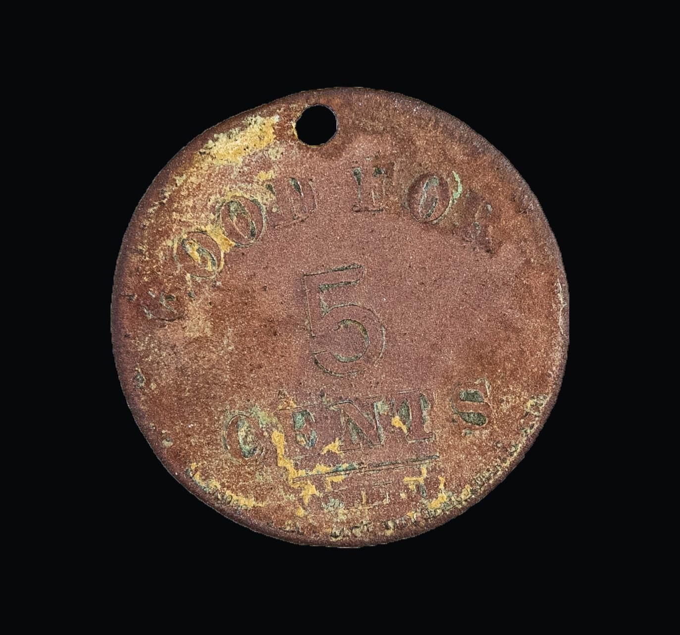 BATTERY.A very rare excavated sutler's token from the 6th Maine battery of the Civil War found at Charlestown, West Virginia. The obverse of the token features a central " 5 " surrounded by the words " GOOD FOR CENTS " surrounding the 5. The name " KOEHLER " appears at the base, likely the die sinker that made the token. The reverse reads " C. W. BANGS. 6TH. ME . BATTERY (star). Only a handful of these rare tokens are known to survive with non-excavated examples valued at between $5000 and $8000. CONDITION: holed and excavated with a dark patina. (02-25381/BF). NON-GUN. $500-800.
