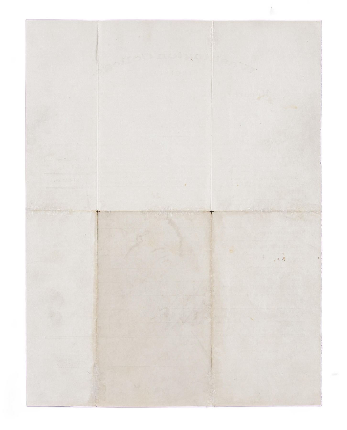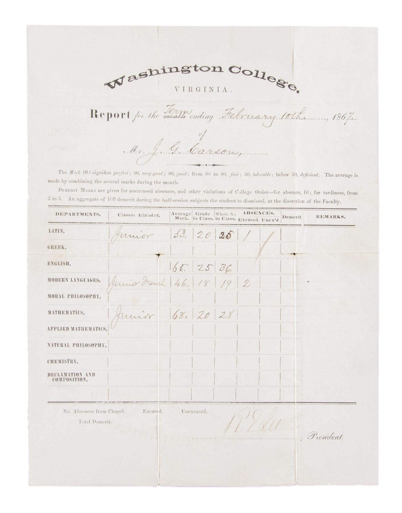 "REPORT CARD" 1867. February 1867 1 page "report card" of student JG Carson, signed as president Washington College. CONDITION: good overall. PROVENANCE: Butterfield & Butterfield Auction lot 744, Sept. 1996. (02-25025-58/JS). NON-GUN. $2,000-4,000.