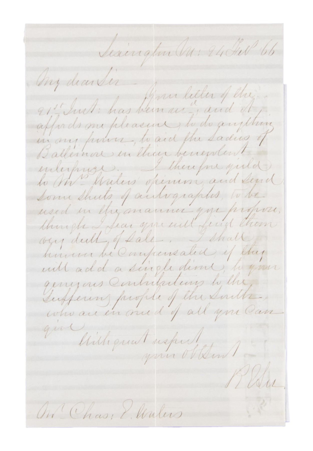 1 page ALS, Lexington, Va February 24, 1866 to Charles E. Waters. Lee writes: "It affords me Pleasure to do anything in my power to aid the ladies of Baltimore in their benevolent enterprise" Lee encloses sheet of his autographs. "I shall however be compensated if they will add a single dime to your generous contributions to the suffering people of the South who are in need of all you can give.". A letter written Feb. 21 to Lee describes how the ladies of Baltimore are organizing a fair to raise funds for the relief of southerners affected by the Civil War. He requests, at the suggestion of his wife, that Lee send a set of his autographs to be sold at the fair to raise money for their cause. The letter to Lee is archived at Washington & Lee University. CONDITION: fine with exception of 2-sided tape adhered to verso with dealer description and price, adhesive is bleeding through which can be greatly improved with archival removal of tape. (02-25025-73/JS). NON-GUN. $2,000-4,000.