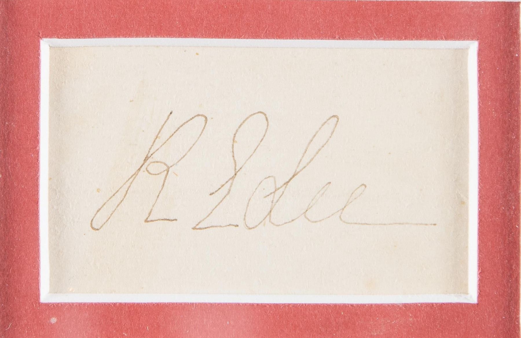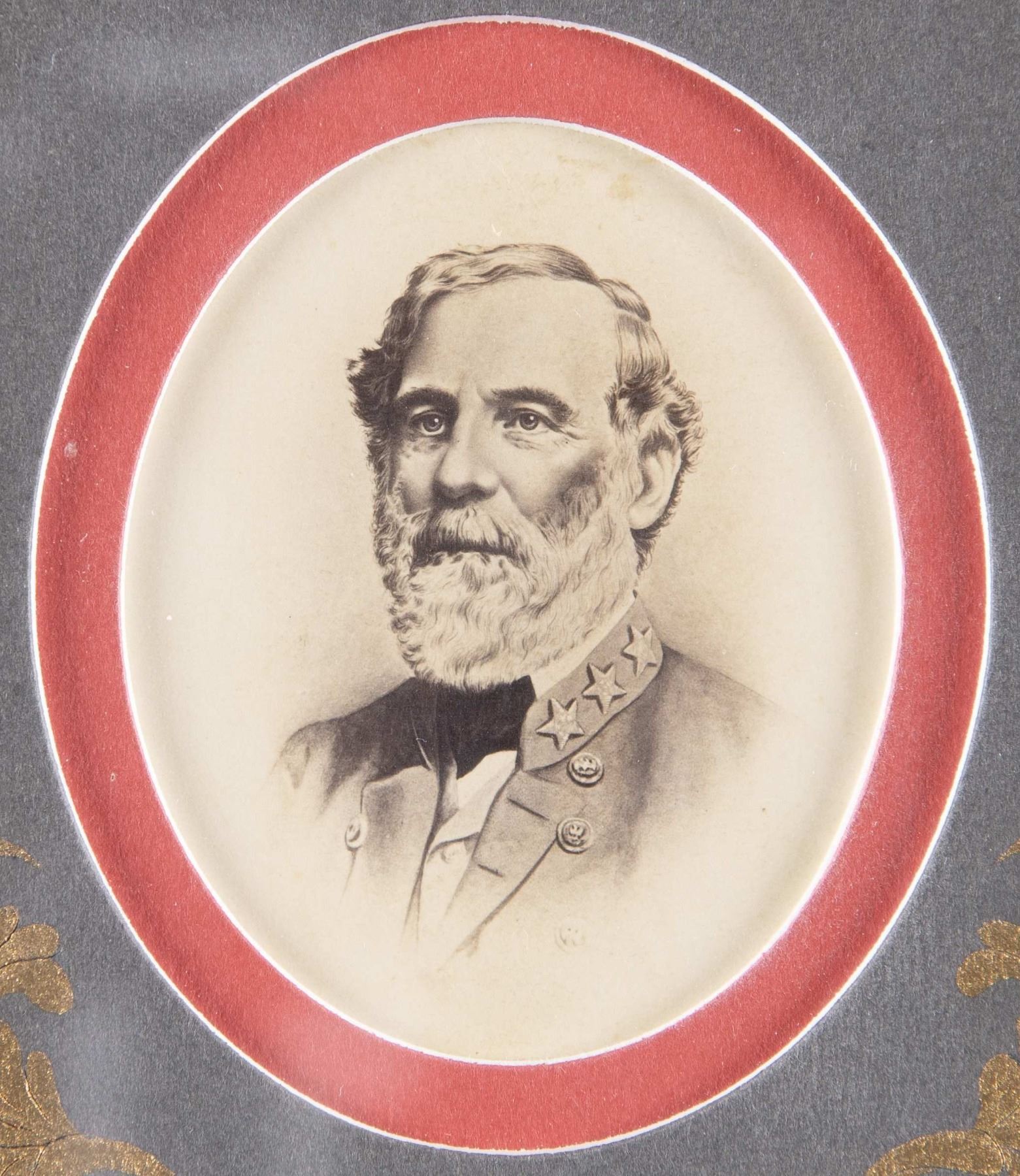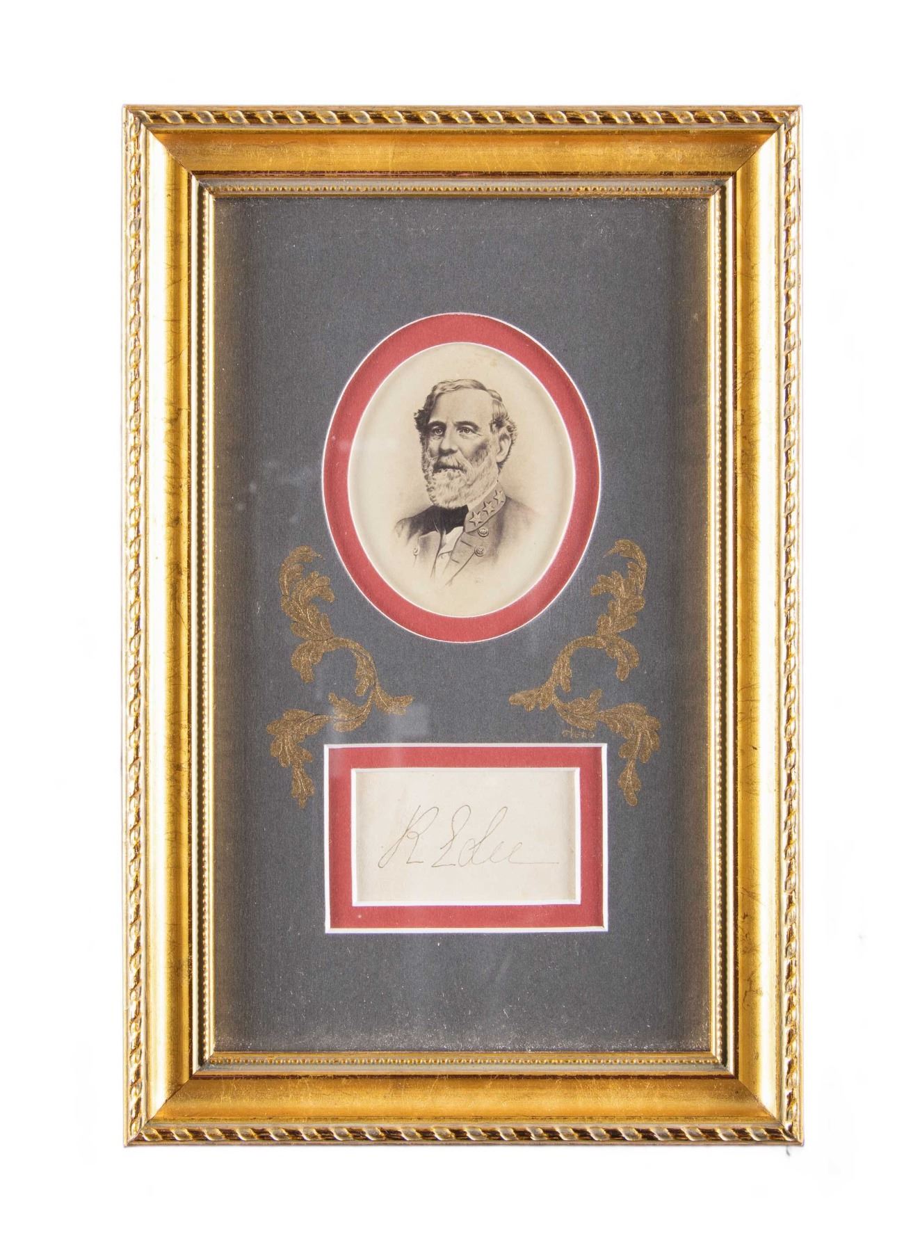 Beautifully mounted, 6" x 9.5" Gilded frame with large matted RE Lee signature and matted image of Lee in uniform. CONDITION: appears fine overall, crisp thin signature, not removed from frame with Gettysburg label on reverse. (02-25025-21/JS). NON-GUN. $800-1,200.