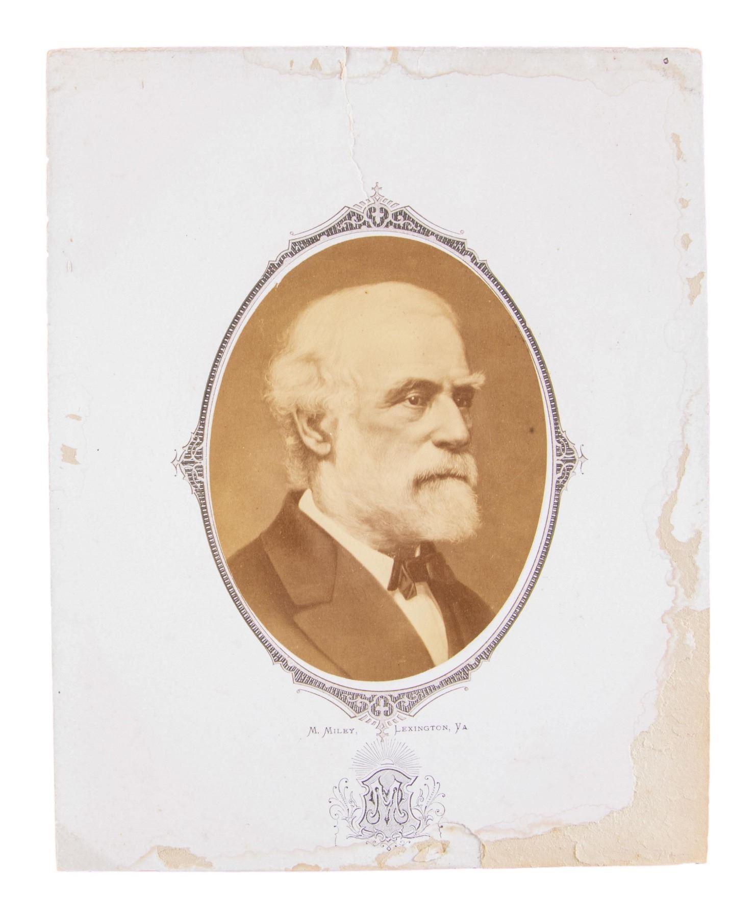 MILEY. Rare large format 5.5" x 4.25" oval albumin photo mounted on 10" x 8" M. Miley Lexington, Va" imprinted board.This rare large format image was taken in Lexington while Lee was president of Washington College, 1870. It is considered Lee's last photograph and this mount appears to be memorial. UNATTACHED ACCESSORIES: Alexander Autograph typed description. CONDITION: image is fine, mounting board with 2 cracks, water stain top edge, white polished surface scuffed off on lower right corner. PROVENANCE: Alexander Autographs. (02-25025-82/JS). NON-GUN. $600-800.