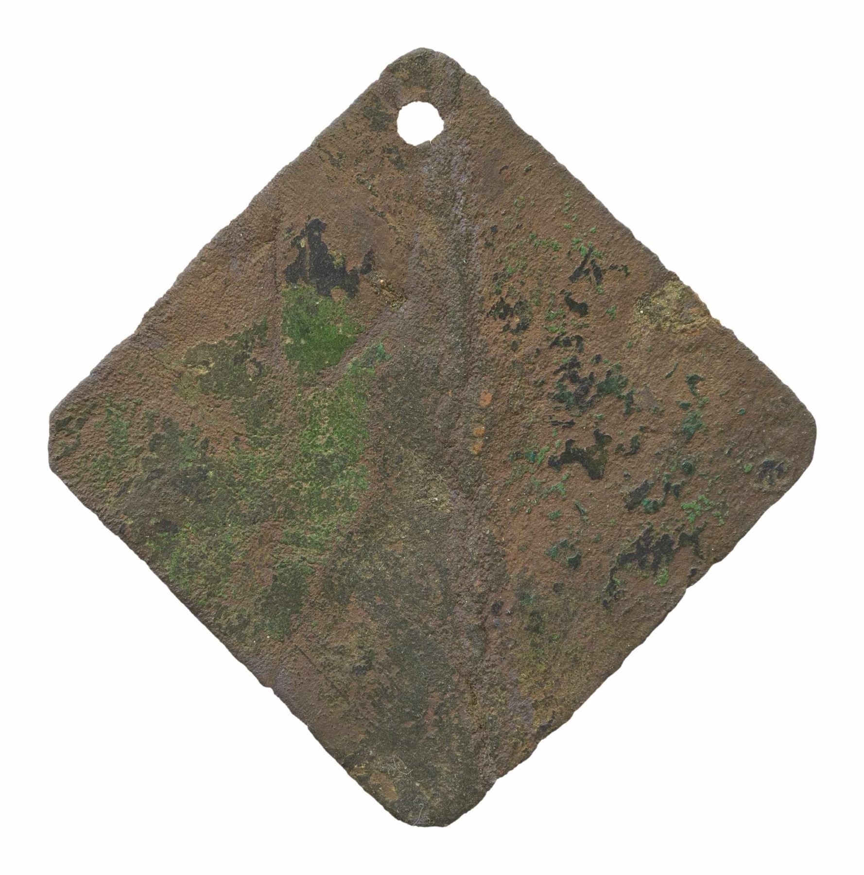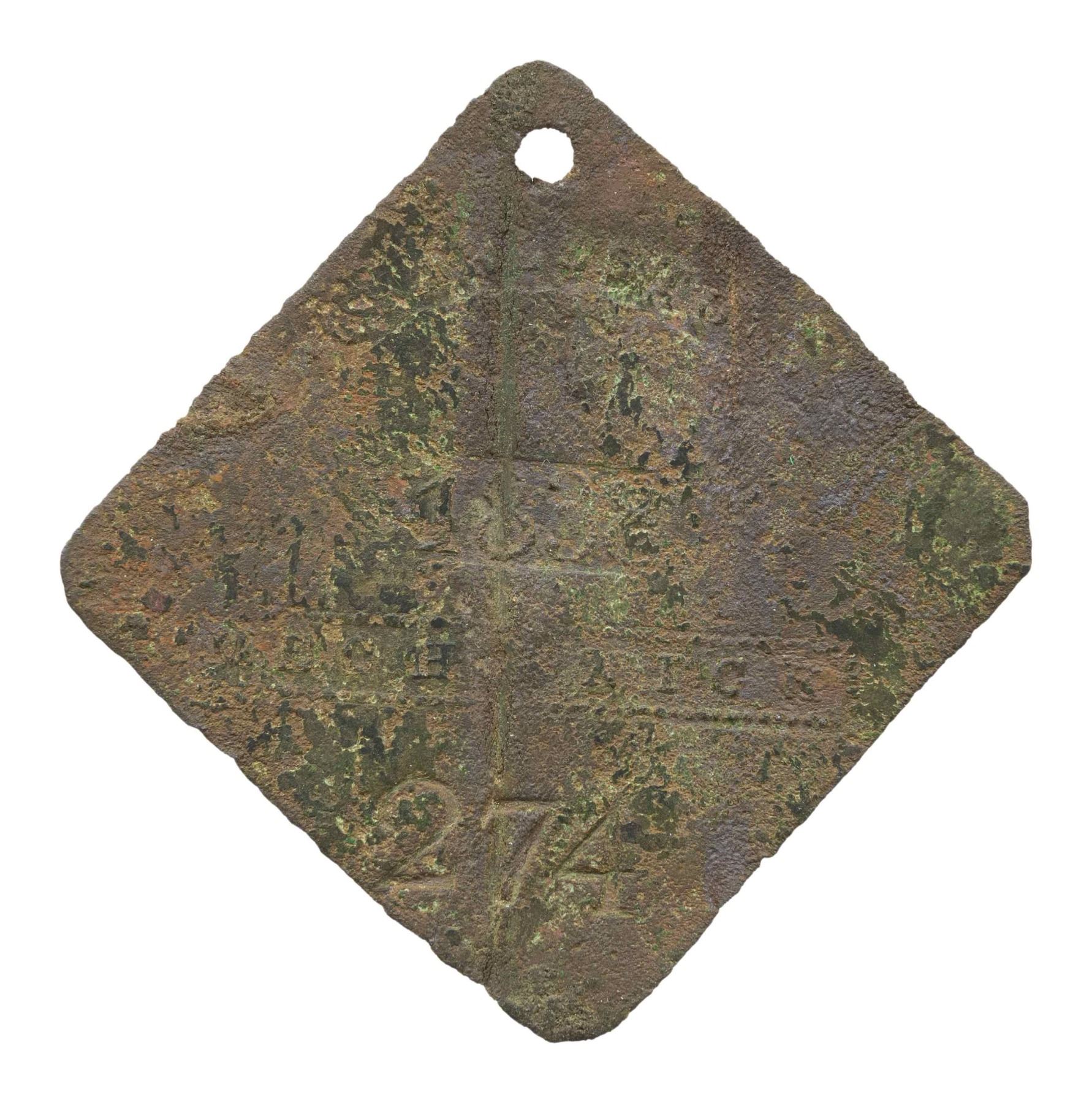 45mm, large diamond shape with clipped corners, number 274. CONDITION: crack restored, weak details, excavated patina. (02-25497-39/JS). NON-GUN. $1,000-2,000.