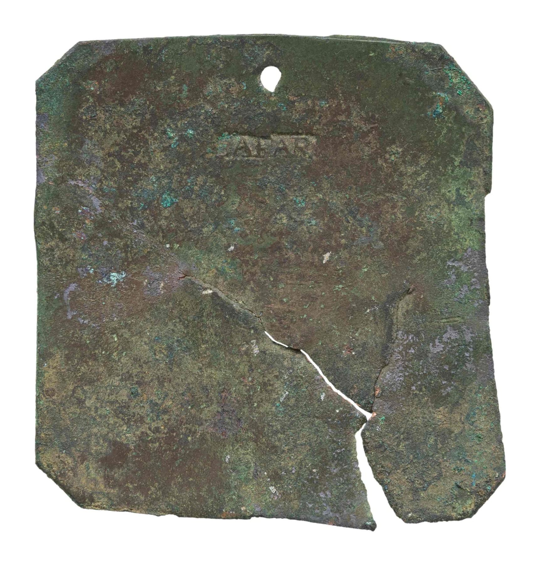 51mm, square shape for 1818, maker marked "LAFAR" on reverse, number 129. CONDITION: good detail, 2 large cracks, still sound, excavated patina. (02-25497-8/JS). NON-GUN. $2,000-4,000.