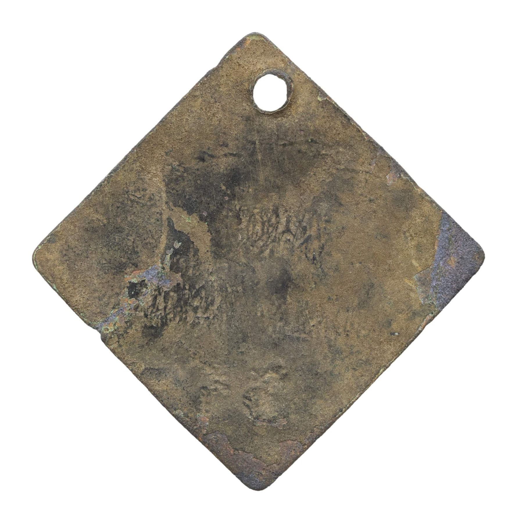39mm, diamond shape, number 35. CONDITION: very good, small crack repair to right edge, excavated patina. (02-25497-22/JS). NON-GUN. $2,000-4,000.