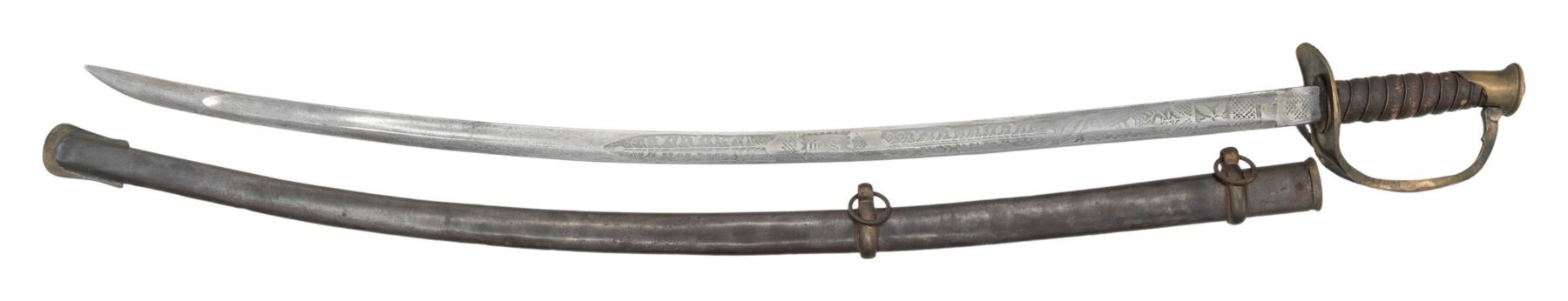 Branched decorated hilt with 32.5" etched blade with "CS". Classic Confederate style brass mounted etched scabbard, leather & wire wrapped grip. Originally made in small run during centennial by Atlanta Cutlery company. CONDITION: very good overall, blade worn but etching discernible. (02-26058/JS). NON-GUN. $400-600.