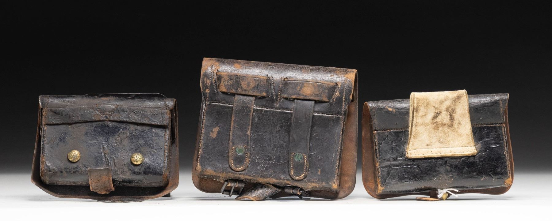1) Militia cartridge box with a "PMB" script plate on the front. An attached tag identifies this as the Portland Mechanic Blues of Portland, Maine. Interior has a wooden block with 16 drilled holes. Reverse has a white buff leather belt loop. Securing strap is present, but separated on one side. 2) US M1864 cartridge box with an embossed "US" in oval on the front. Box is complete with its original tin liners. Securing strap is intact as well as the two iron buckles at the base. 3) Militia cartridge box with a brass script "NG" for National Guard plate on the front. Interior has a four compartment tin liner. Reverse has two Civil War cuff size eagle "A" buttons to facilitate use with a cloth over the shoulder strap. Strap guide is present, but detached on the ends. Securing strap is present. CONDITION: all boxes show ample wear, but are generally complete and solid except as noted above. (02-26079/BF). NON-GUN. $400-700.
