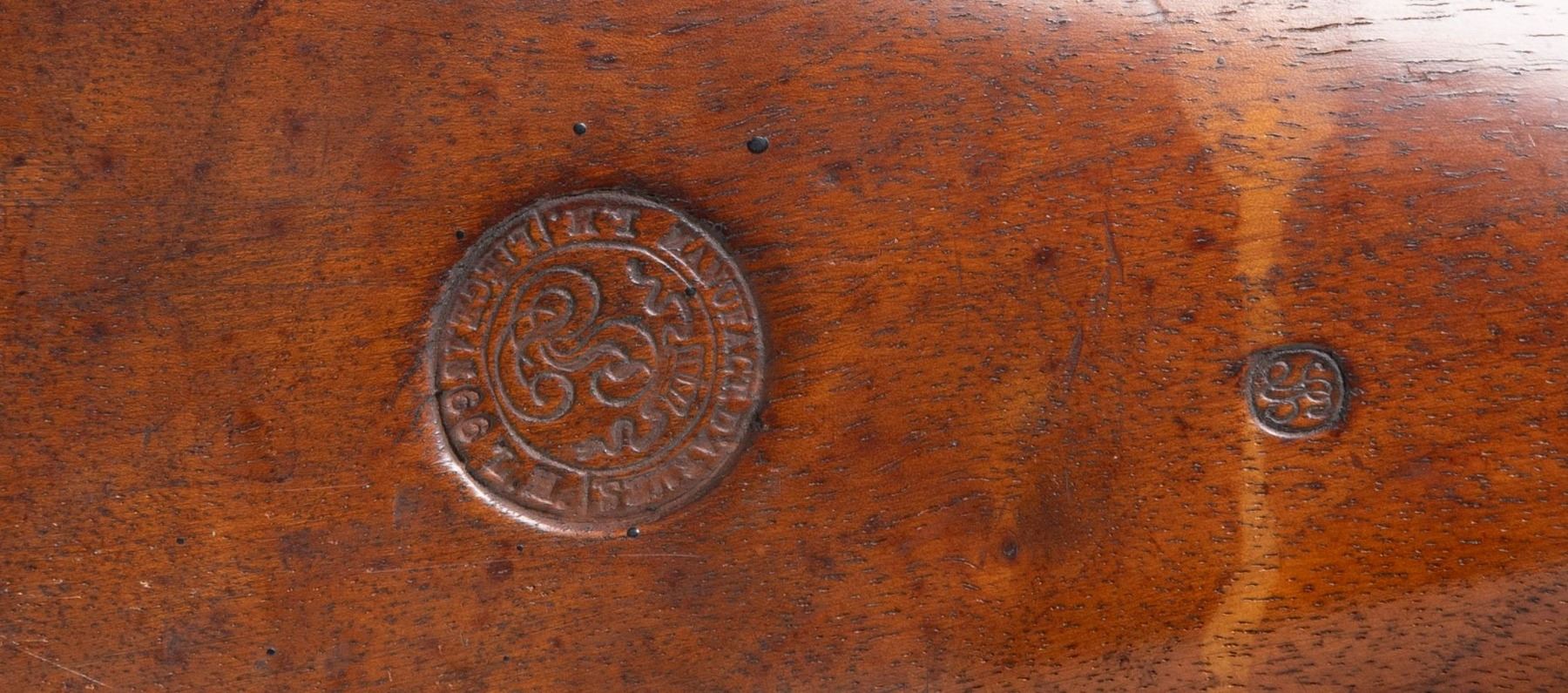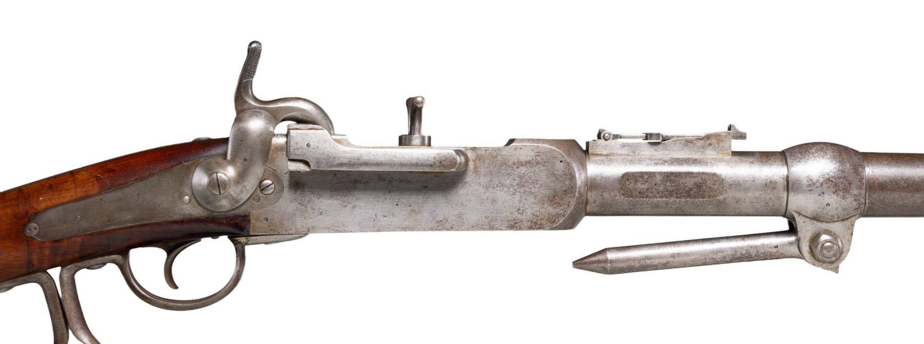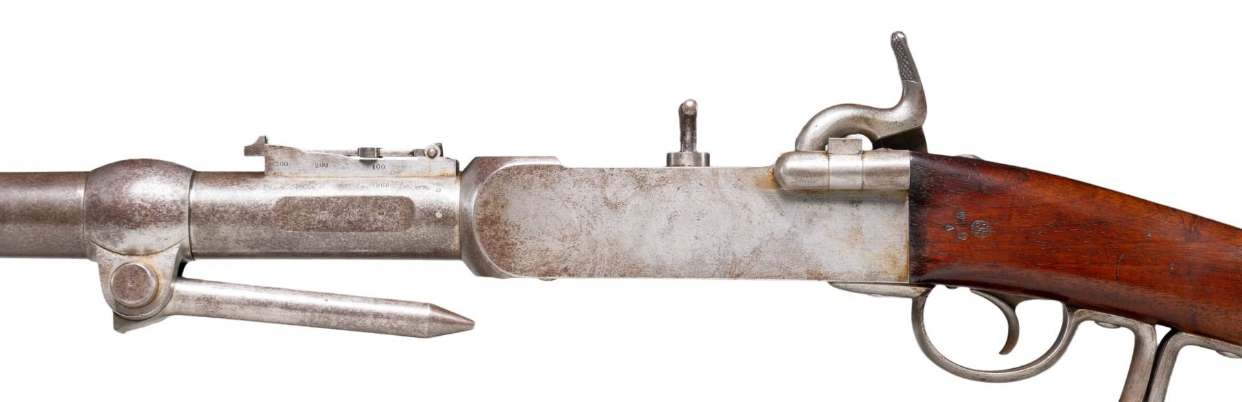 MADE IN LIEGE 1866. Cal. 70. S# NSN. This large breech loading percussion rifle has 39" tapered round barrel with eight groove Whitworth type rifling. Barrel is mounted with military type tangent rear sight with sliding ladder with ranges to 1300 meters. Barrel also has sleeved on front sight and clamped on rotating and pivoting spike for mounting in wall, gunwall or other support. Rear of barrel is dated 1866 on left side. Very large iron action is fitted with removable chamber block with percussion nipple. Top has ears installed to facilitate removal. Block slides forward with collar to make gas seal in rear of barrel. Block is held in battery by pivoting bolt at rear with spring loaded folding handle on right. Back spring percussion lock has large well shaped hammer. Stock of dense European walnut is iron mounted with large buttplate with rounded top tang and trigger guard with loop at rear forming grip. Nearly every part is stamped with an assembly mark of "M" in a circle. Lock is stamped "CC" "66" in a circle. "GV" in an oval is on barrel. Right side of stock is deeply stamped with circular cartouche embossed "MANFACT. D' ARMES" "L.M. LIEGE 1866 L.H.". Another cartouche appears to be an intertwined "LH". Gun is accompanied by a walnut display rack with label reading "Wall Gun" "MFG: Pierre Joseph Malherbe Liege, Belgium 1866". "Whitworth 15 Bore (.70 Caliber)". One of the more interesting features about this rifle that makes this so desirable is that it was actually designed to fire explosive rounds. UNATTACHED ACCESSORIES: display stand and photocopies of images and information (18 pages). CONDITION: fine. Metal retaining remnants of original polish finish considerably stained to a speckled brown. Stock retains most of its original oil finish with some marks and stains. Bore is bright and shiny throughout. This big gun appears unfired. Lock is crisp; mechanically fine. (01-27832/MGM). ANTIQUE. $8,500-9,500.