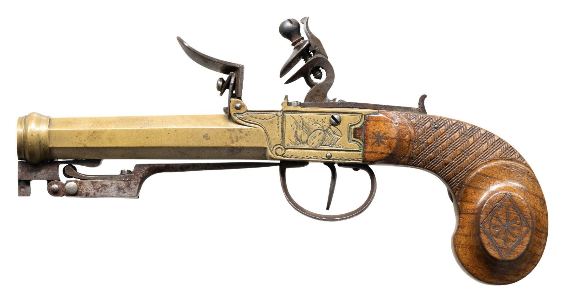 BAYONET. Cal. 58. NSN. Bbl. 4". Brass flintlock pistol of apparent English origin. Pistol is devoid of a mfg. mark and identifying proofs. Sides of the 1-piece brass receiver/bbl. are engraved with English pattern panoplies of arms. Underside of the iron trigger guard bow is engraved with a starburst motif. Octagonal bbl. terminates in a cannon style muzzle, and features an iron spring loaded folding bayonet, retained/released by the trigger guard. Sides of the 1-piece crosshatched wood stock features a raised oval section inlaid with a wire starburst inside of an oval, inside of a diamond, with small wire starburst patterns inlaid towards the receiver. CONDITION: brass frame/bbl. has acquired a dull mellow patina, showing some scattered spots of verdigris. Iron parts have faded to a gray patina. Sound lock. Grip shows some superficial handling marks and small impressions, but otherwise remains very good overall. (01-26957/MLW). ANTIQUE. $600-900.