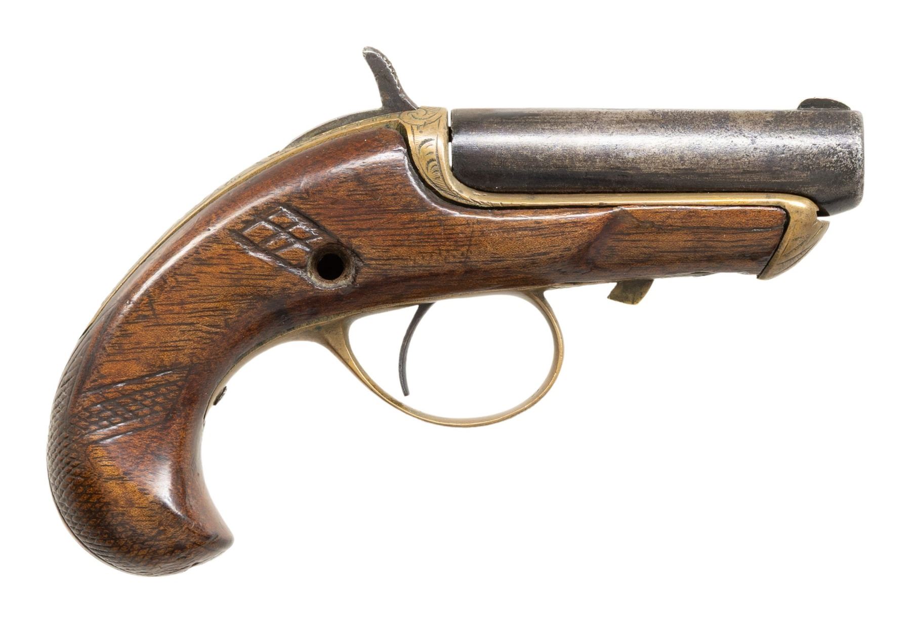 DERRINGER PISTOL WITH CASE. Cal. 41 RF. S# 6133. Bbl. 2 1/2". Single shot sliding bbl. derringer designed by David Williamson and produced by either Moore Patent Firearms Company or by National Arms Company. The flat top of the bbl. is engraved with a feathered arrow, with the S# marked on the underside. Bbl. rail is marked "GOOCH/ WINONA/ MISS", with consignor research indicating this to be Pvt. Henry Gooch Hammond of Company B, George's Regiment, 5th Mississippi Cavalry. Brass frame and trigger guard feature panels of scroll and decorative engraving. Sanded and refinished stock features a checkered wrist and butt, with additional hand carving present on either side. Right side of stock exhibits an unusual apparent extra screw hole. German silver blade front sight with hammer notched rear sight. Matching numbers are present on the frame (below bbl.) and bbl. UNATTACHED ACCESSORIES: custom wood display case featuring a red felt lined interior and a wood 5-rd. cartridge block. This example is additionally accompanied by scans of Private Henry Gooch Hammond's information on findagrave.com. CONDITION: bbl. has faded to a dark mottled gray patina, exhibiting scattered spots/areas of light to mild pitting. Brass frame and trigger guard exhibit a pleasing mellow patina. Bore exhibits consistent moderate pitting, while retaining fair rifling throughout. Action is notably loose, but functions properly when cycled by hand. Stock is good as refinished, exhibiting a large crack on the right side and a small crack on the left, both stemming from the brass frame/forend cap, with a couple of small chips present on the butt. Case exhibits scattered superficial marks from handling and storage, but otherwise remains sound. (01-27891/MLW). ANTIQUE. $1,200-1,800.