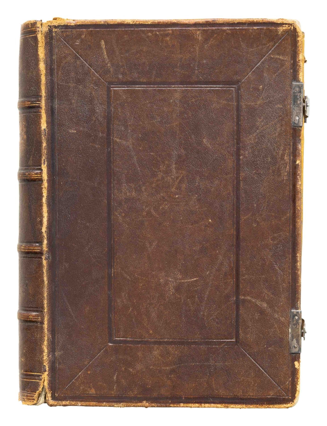 CASE DISGUISED AS A BOOK. Cal. 45 (both). S# NSN (both). This pair of pistols, probably continental, measure 7-1/4" overall and have 2-1/4" screw off cannon turned barrels. Boxlock type flint lock actions feature reinforced cocks, frizzens with external springs and sliding safetys that lock frizzens in place. Actions are engraved with floral motifs. Skip line checkered European walnut grips have raised carved decorations on side panels and silver pin accents to checkering. UNATTACHED ACCESSORIES: pistols are housed in leather bound book with hinged silver clasps that is lined in mauve velvet. Bottom compartment is semi-French fitted for both pistols. CONDITION: good to fine. Metal parts cleaned to bright silver on actions. Barrels with most of a re-brown. Stocks are good, lightly worn. Book is good with considerable wear to edges of spine. Interior cloth is good to fine with light compressions. PROVENANCE: Estate Collection of Nicholas Apergis. (01-27504/MGM). ANTIQUE. $1,500-2,250.