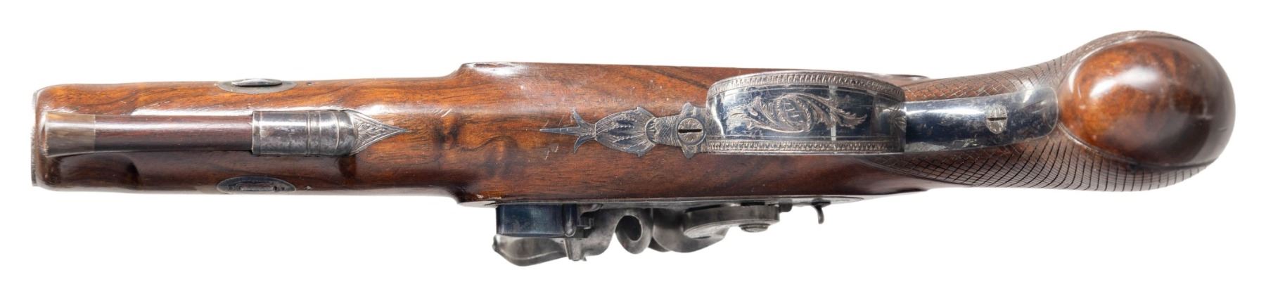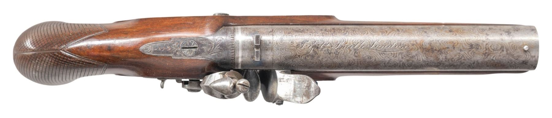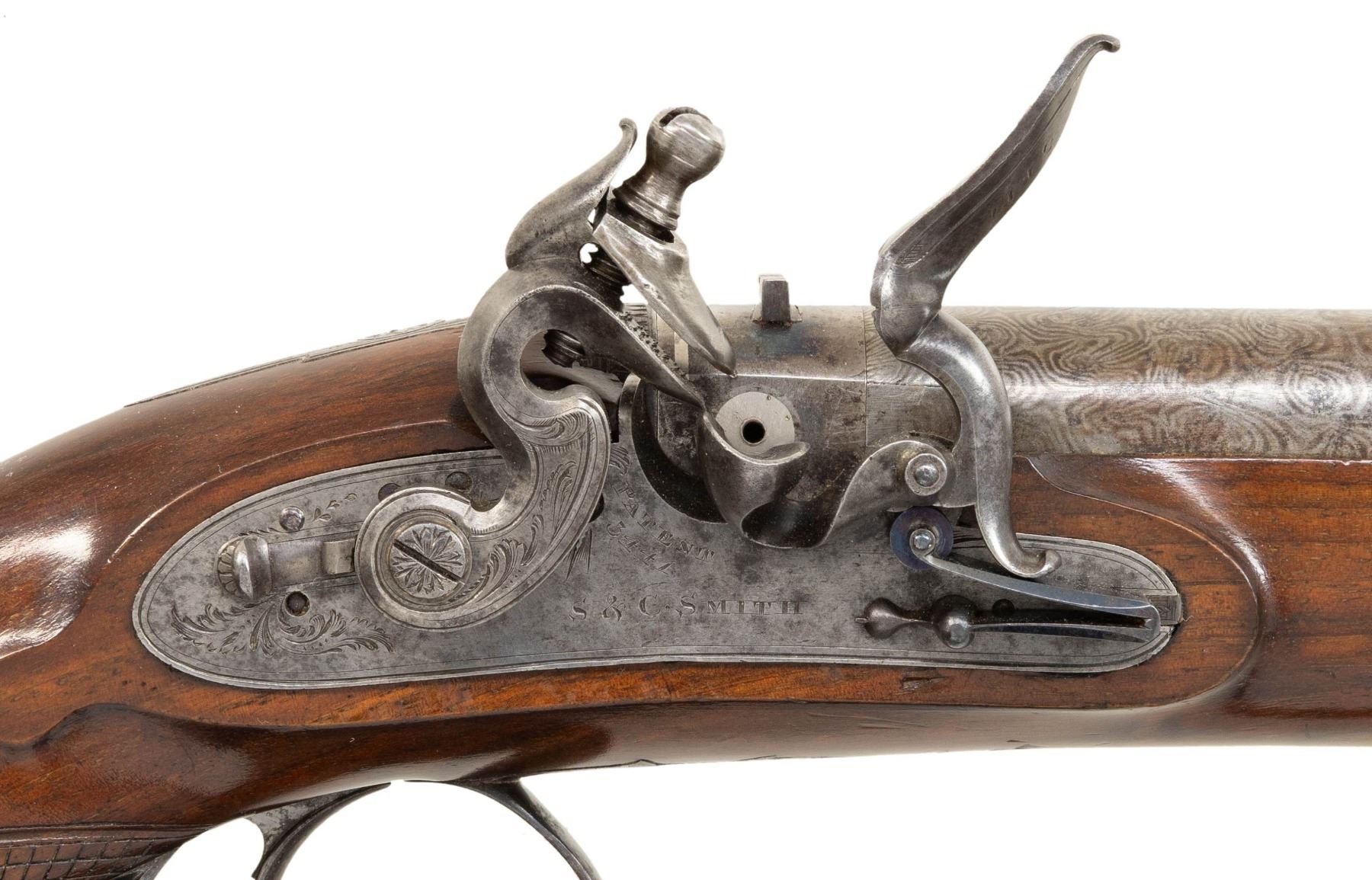 PISTOL BY S&C SMITH OF LONDON. Cal. 58. S# 3441 (on trigger guard bow). This fine pistol measures 11-1/4" overall and has 6" round damascus barrel engraved "S&C Smith London" (working ca 1790-1831) on top. A "U" notch rear sight is dovetailed through patent breech with platinum touch hole and band at rear. Case hardened breech iron is scroll engraved. Lock with flat plate is fitted with high breasted serpentine cock with back sliding safety, beautifully sculpted full waterproof pan, bridled roller frizzen with roller on feather spring that has bulbous finial with teat. Lock is engraved with maker's name at center and some scroll. "Patent" "3441" (use #) is in front of cock. Plain European walnut stock with checkered bag grip extends to muzzle and attaches to barrel with captive side bolt through oval silver escutcheons. Bright blue trigger guard with pineapple finial is engraved wth S# (3441) on bow flanked by some scroll. Original greenheart ramrod with horn tip mounts into beaded steel thimble. UNATTACHED ACCESSORIES: photocopy of auction listing for this item at Amoskeag Auction dated 11/30/13. CONDITION: very fine. Barrel retaining most of its damascus pattern with some cleaned patches of rust. A good amount of original light case hardening color remains on lock and breech iron. Nearly all temper blue remains on feather spring and about 80% original bright blue remains on furniture. Stock retains nearly all of its original finish with a few minor marks. Bore is bright and shiny. Lock is crisp. (01-26951/MGM). ANTIQUE. $1,200-1,800.
