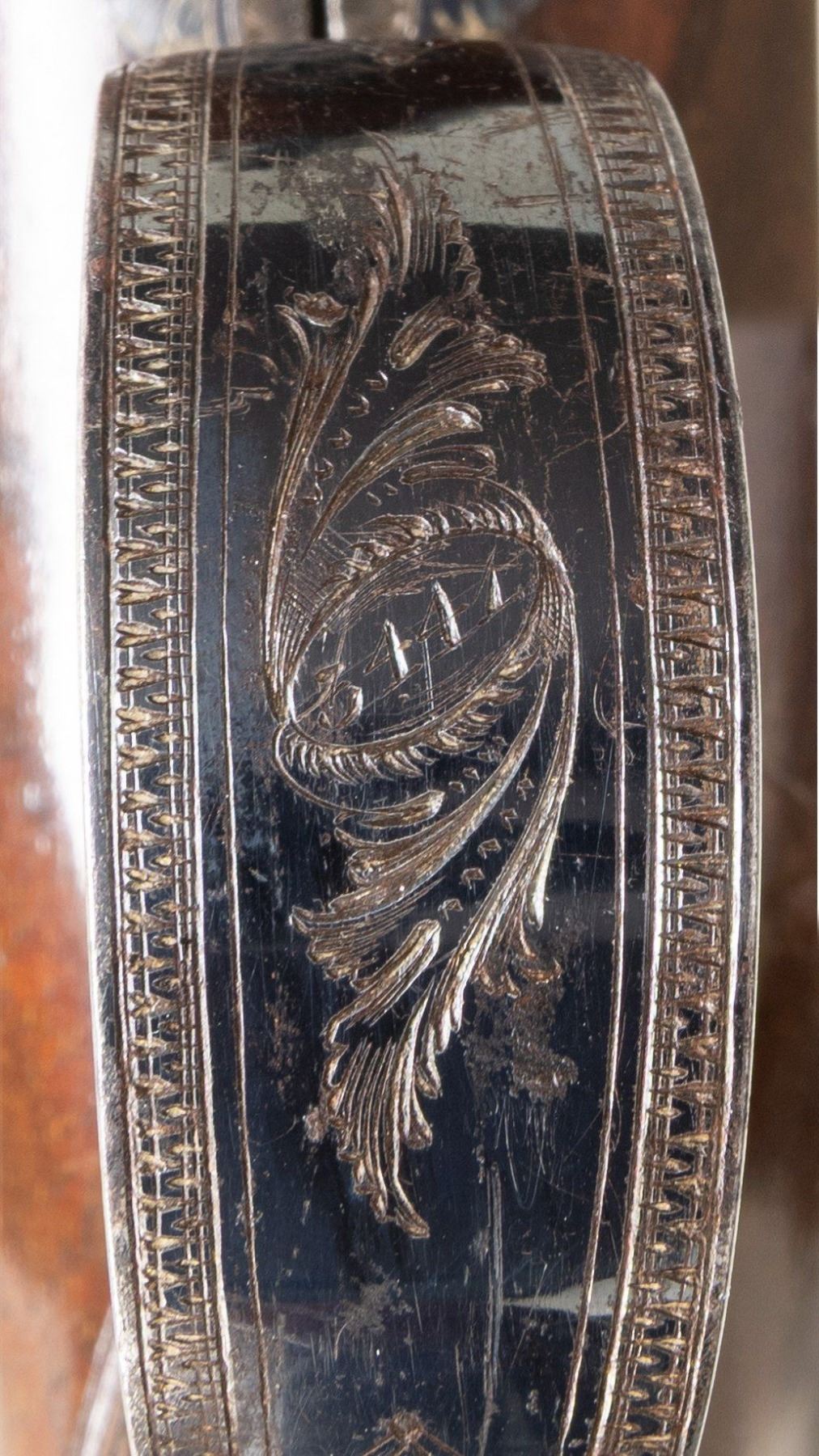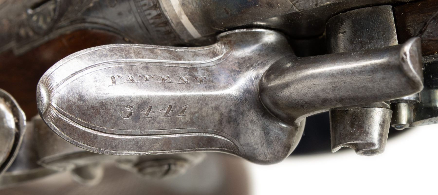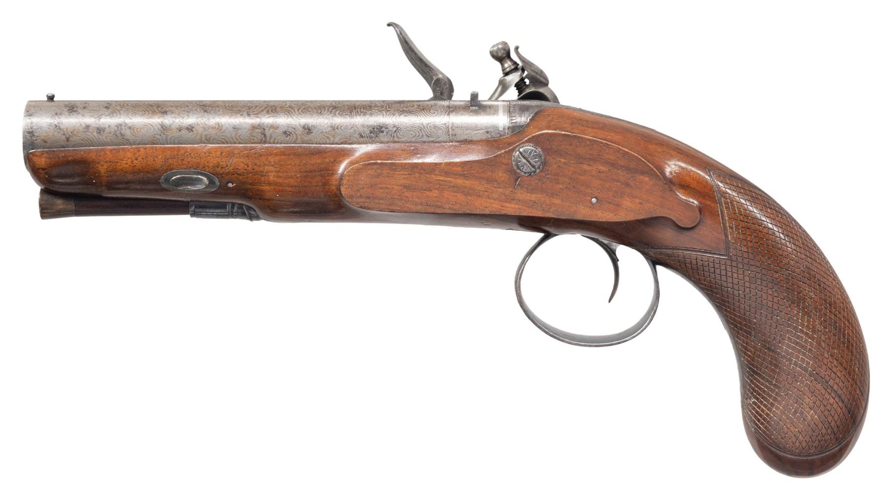 PISTOL BY S&C SMITH OF LONDON. Cal. 58. S# 3441 (on trigger guard bow). This fine pistol measures 11-1/4" overall and has 6" round damascus barrel engraved "S&C Smith London" (working ca 1790-1831) on top. A "U" notch rear sight is dovetailed through patent breech with platinum touch hole and band at rear. Case hardened breech iron is scroll engraved. Lock with flat plate is fitted with high breasted serpentine cock with back sliding safety, beautifully sculpted full waterproof pan, bridled roller frizzen with roller on feather spring that has bulbous finial with teat. Lock is engraved with maker's name at center and some scroll. "Patent" "3441" (use #) is in front of cock. Plain European walnut stock with checkered bag grip extends to muzzle and attaches to barrel with captive side bolt through oval silver escutcheons. Bright blue trigger guard with pineapple finial is engraved wth S# (3441) on bow flanked by some scroll. Original greenheart ramrod with horn tip mounts into beaded steel thimble. UNATTACHED ACCESSORIES: photocopy of auction listing for this item at Amoskeag Auction dated 11/30/13. CONDITION: very fine. Barrel retaining most of its damascus pattern with some cleaned patches of rust. A good amount of original light case hardening color remains on lock and breech iron. Nearly all temper blue remains on feather spring and about 80% original bright blue remains on furniture. Stock retains nearly all of its original finish with a few minor marks. Bore is bright and shiny. Lock is crisp. (01-26951/MGM). ANTIQUE. $1,200-1,800.