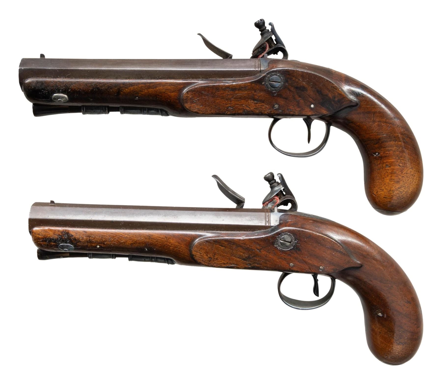 PISTOLS BY CLARKE. Cal. 65 (both). S# NSN (both). Nicholas Clarke worked in Dublin between 1788-1811 and is undoubtedly ably the maker of these pistols. The 6" swamped octagon barrels are engraved "CLARKE DUBLIN" on top flats. Locks with flat plates are fitted with serpentine cocks with back sliding safetys, semi-waterproof pans, bridled roller frizzens with rollers on feather springs. Lock plates are engraved with feather borders around "CLARKE DUBLIN". Walnut stocks with uncheckered bag grips extend to muzzles. They attach to barrels with sidebolts without escutcheons. Trigger guards are unengraved and have pineapple finials. Small silver caps on butts are engraved "JRP" (?). Rosewood ramrods with horn tips mount through beaded steel pipes and matching thimbles. CONDITION: very good as refinished. Iron and steel parts with re-browned barrels, torch colored locks and furniture are smooth and without pitting. Stocks have old oil refinish over scattered marks and dings and are sound. Bores are good; lightly pitted. Locks are good, with working safetys. PROVENANCE: Estate Collection of Nicholas Apergis. (01-27544/MGM). ANTIQUE. $1,500-2,500.