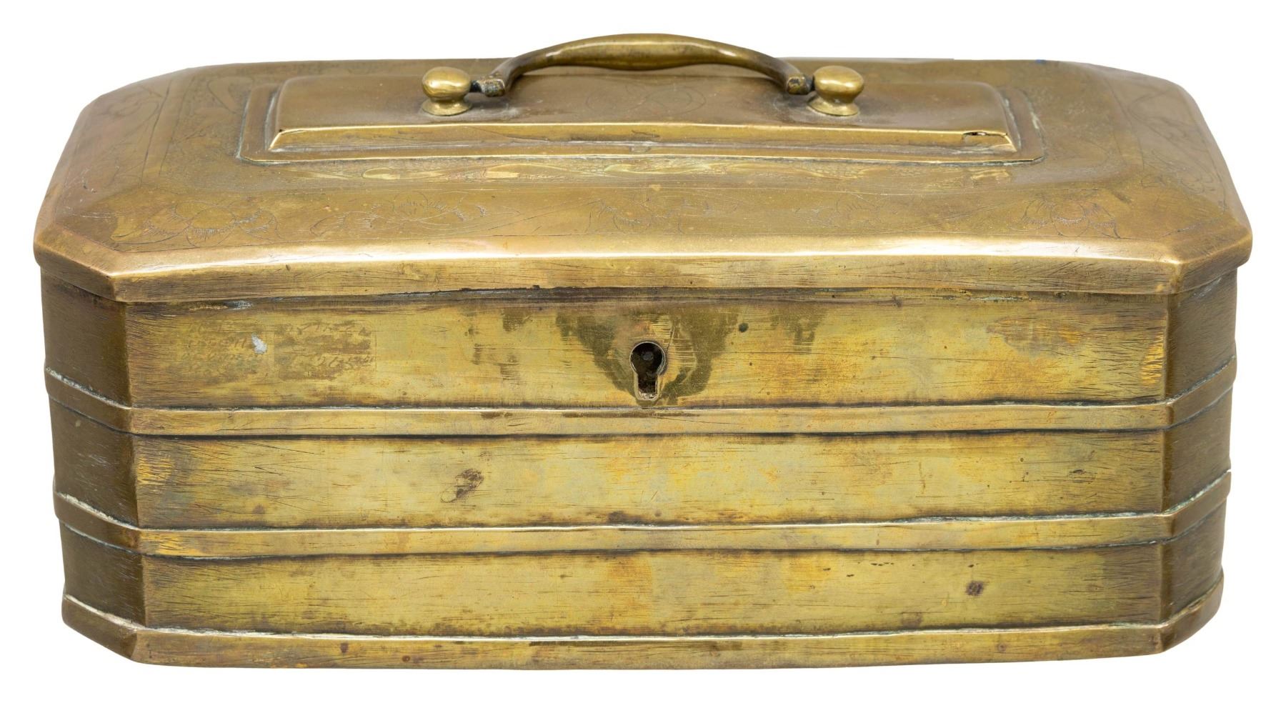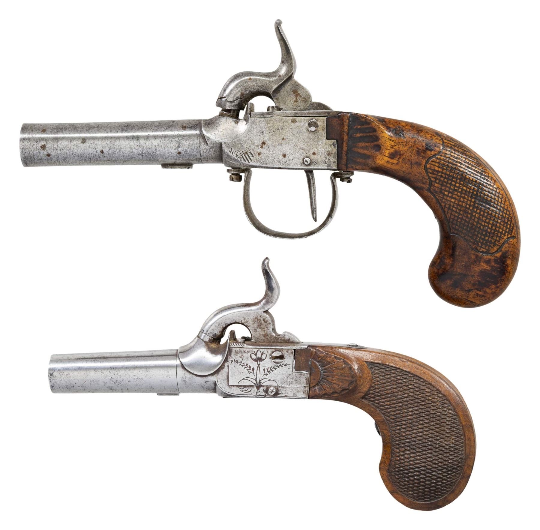 CASE. 1) BELGIAN TWIST BARREL FLINTLOCK PISTOL. Cal. 43 Smoothbore. NSN. Bbl. 1 15/16". Screw bbl. percussion pistol produced in Belgium by an unknown mfg. Sides of frame exhibit light foliate engraving, which extends to the underside and bottom flat of the trigger. Underside of frame exhibits a Belgian "E/ LG/ *" proof within an oval. 1-piece checkered wood rnd. butt stock with relief carved foliate pattern on ears. Center hammer action with folding trigger. CONDITION: metal components have been cleaned and polished, exhibiting a bright exterior with scattered spots of light pitting and age related discoloration. Proper manual mechanics. Stock shows some superficial handling marks, but otherwise remains sound. 2) UNMARKED TWIST BARREL PERCUSSION PISTOL. Cal. 45. NSN. Bbl. 2 11/16". Unmarked and unproofed twist bbl. percussion pistol, possibly of Belgian origin.1-piece checkered wood stock. Center hammer action. UNATTACHED ACCESSORIES: brass case featuring floral engraving on lid, containing a brass powder flask and medallion that appears to read "LBLAUT/ OMSWART". CONDITION: metal components have been cleaned and polished, exhibiting scattered spots of light to mild pitting and age related discoloration. Action does not function. Percussion nipple is flattened, with the hammer exhibiting a notable crack around the cone and a crack along the right side of the body. Stock has been refinished, exhibiting scattered handling marks, with a crack stemming from the upper frame tang. Case and powder flask exhibit a pleasing mellow patina. PROVENANCE: Estate Collection of Nicholas Apergis. (01-27444/MLW). BOTH ANTIQUE. $800-1,400.