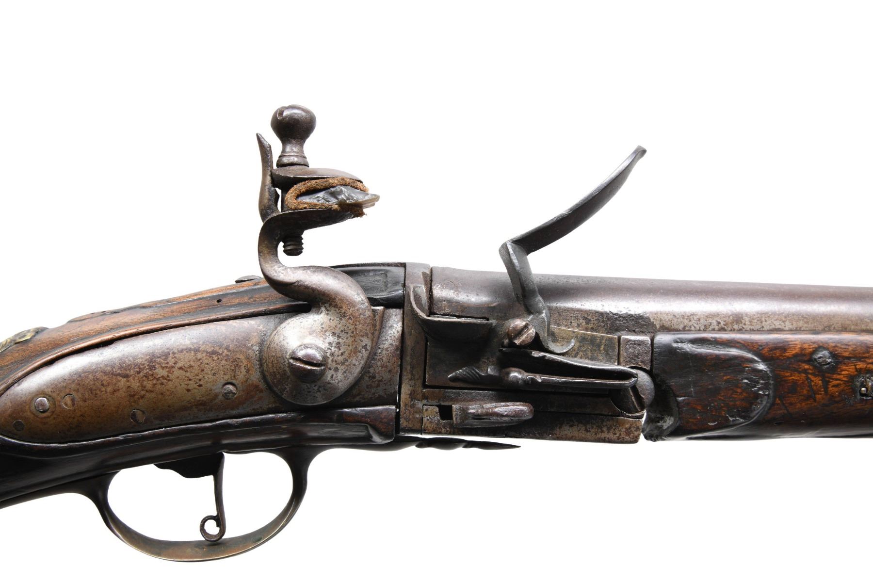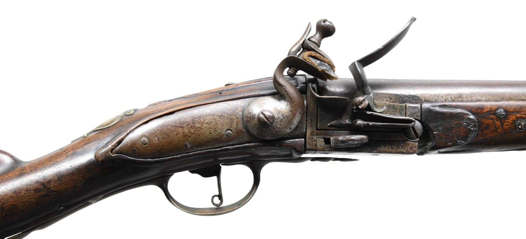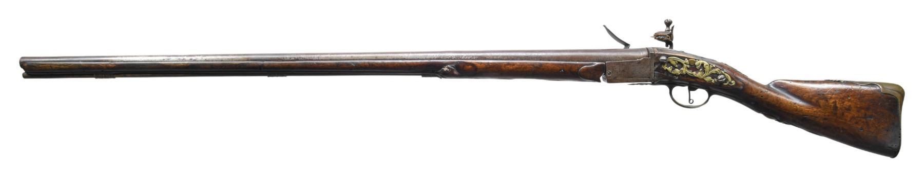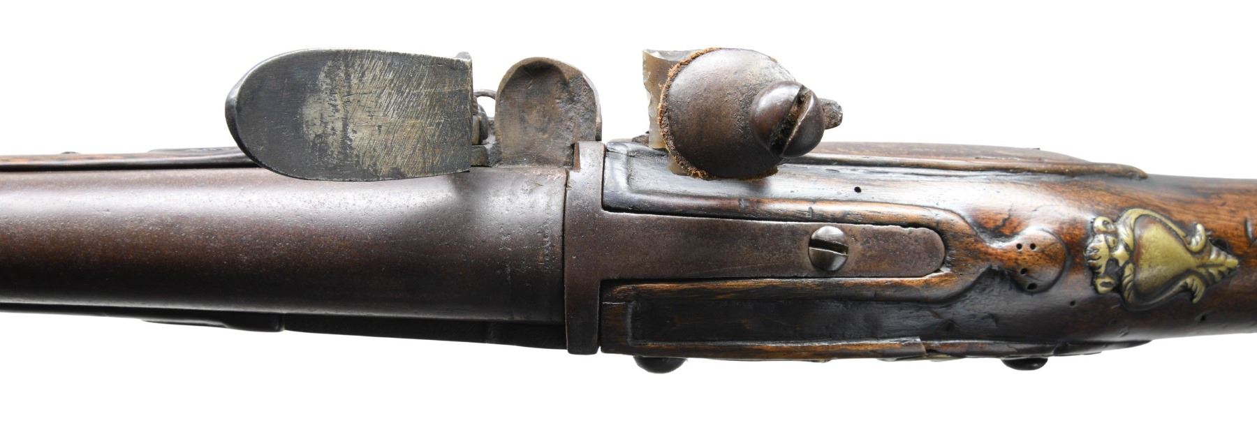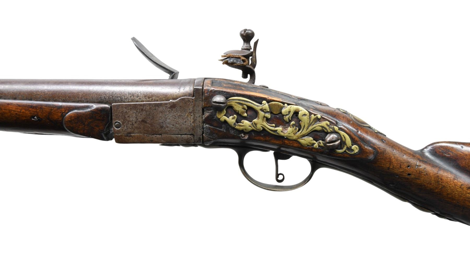 REMOVABLE CHAMBER POSSIBLY DUTCH. Cal. 68. S# NSN. This interesting early breech loader is not maker marked and has 36" military style tapered round barrel. Hinged action fitted with thumb operated locking lever on right side tilts open to allow removal of chamber which is fitted with integral pan, unbridled frizzen and file decorated feather spring. Action is fitted with back spring flint lock with serpentine cock. Swan neck buttstock exhibits Germanic styling with handrail comb, mouldings around barrel tang and trigger guard. Brass mounts include early style buttplate with foliate finial, pierced sideplate and heavy cast trigger guard. A crest plate at top of grip has monkeys face at top. Matching forend extends to muzzle and is pinned to barrel. A hickory ramrod is in multi-turned brass pipes and thimble. CONDITION: good. All metal with old cleaning to gray brown with considerable pitting. Wood with old oil refinish has details rounded. Brass is presently toned to mustard brown, but shows rubbing. Bore is dark. Top of removable chamber is cracked; otherwise mechanically good. Lock works, but is soft. Wood shows repairs on left side by action tang and front 14" of barrel channel repaired or replaced. A very interesting early gun. PROVENANCE: Ex-Richard Littlefield Private Collection. (01-27831/MGM). ANTIQUE. $3,500-4,500.