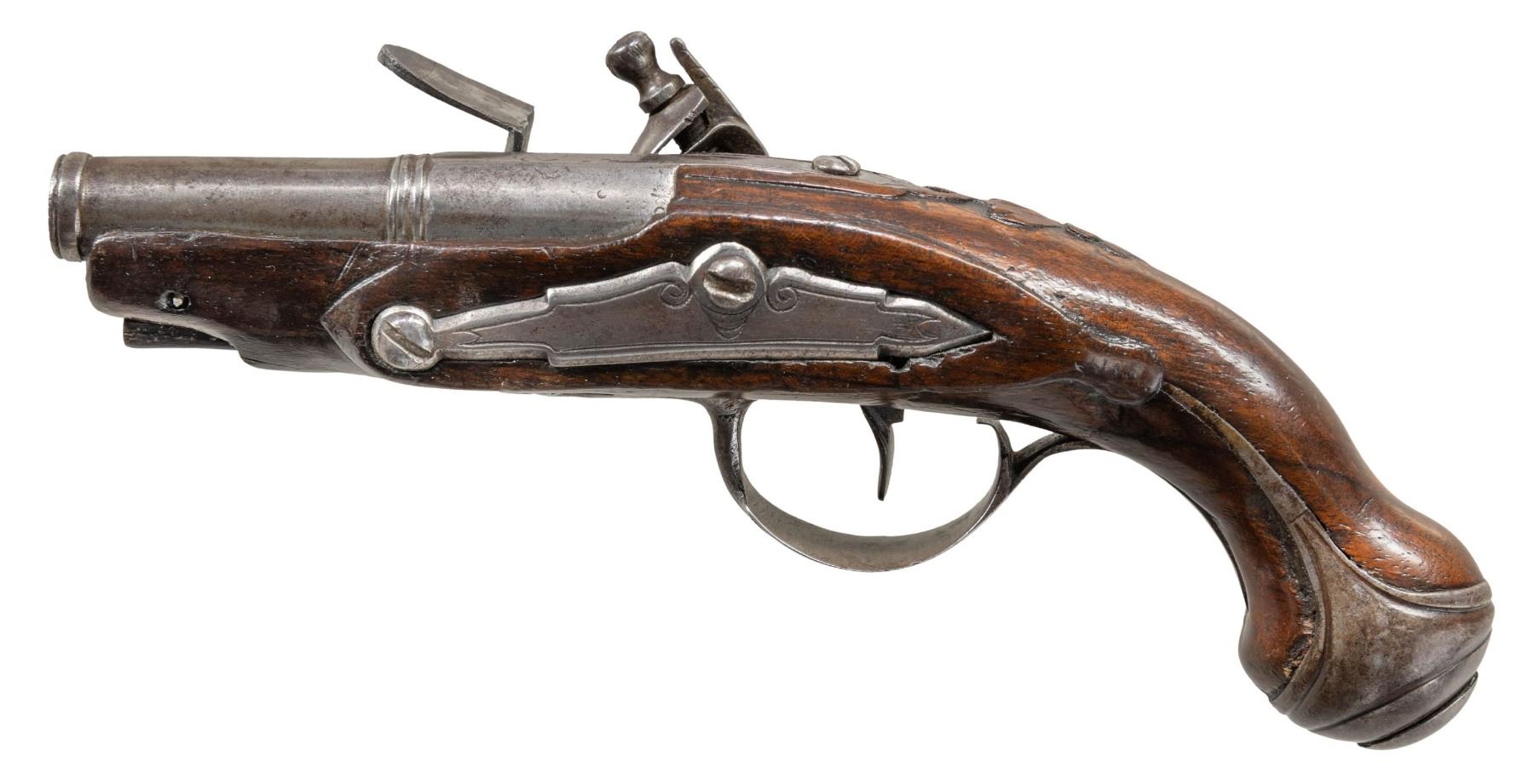 Cal. 45 Smoothbore. NSN. Bbl. 3 1/4". Unmarked flintlock pistol of European origin. Lockplate, breech flats, and sideplate exhibit light decorative engraving. Bbl. features a faceted breech, followed by a grooved band at the center that transitions to a rnd. contour and an additional grooved band at the muzzle. 1-piece plain wood stock, with relief carved foliate motifs on rear of wrist. Iron sideplate, pommel cap (with stirrups), and trigger guard. Complete with plain wood ramrod. CONDITION: metal components have acquired a gray patina, showing scattered spots of pitting and age related discoloration. Pommel cap has acquired a dark mottled gray patina. Proper manual mechanics, although the hammer drops when the trigger is pulled at half cock. Stock shows scattered marks and small impressions, with chipping present along edges. (01-27961/MLW). ANTIQUE. $800-1,200.