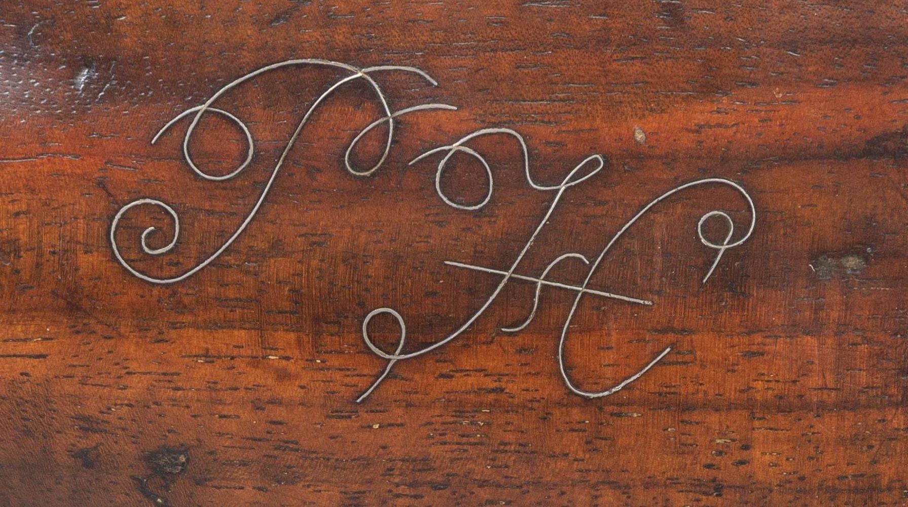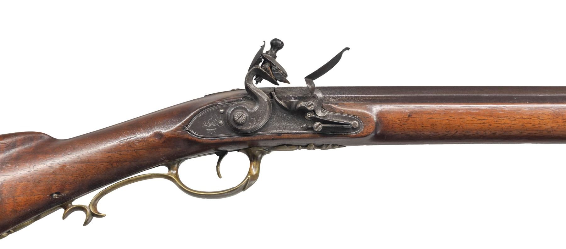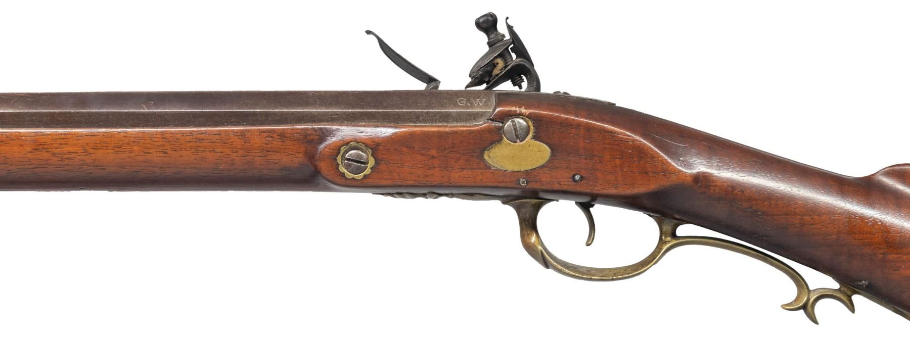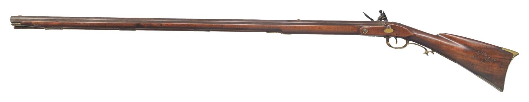 RIFLE. Cal. 45. NSN. Bbl. 42 1/2" with a rifled bore measures 7/8" across the flats at the muzzle. Dovetail mounted brass sights. The front sight has a fine fixed blade. The unusual rear sight has 1 standing and 1 folding leaf. The left bbl. flat is stamped "G.W" that may be the bbl. makers signature. The iron trade lock & hammer have simple scroll engraving with single line borders. The partially legible name appears to be "Ca___ / & Co.". Plain brass trigger. Pin fastened full length stock with a slight Roman nose shows good curl with dimples behind the lock & sideplate flats. The left side has silver wire inlay that may be the owners initials "PFC". Right side features a daisy finial rectangular lid patch box with buttplate mounted release button. Other brass furniture includes a crescent buttplate, toe plate, floral finial finger curl trigger guard, sideplate escutcheons & nose cap. The hardwood ramrod is held by a faceted octagon brass thimble & 3 pipes. Consignor supplied information identifies the rifle as being Virginia made of the James River School. Weight: 11lbs, 3.2oz. CONDITION: the bbl. & iron fittings show an even brown patina with pitting around the flash hole and adjacent lock area. Brass furniture is reacquiring a mild patina The stock shows evidence of a light refinishing over some remaining marks. There are small chips around the lock with a small crack forward of the rear lock screw escutcheon. The ramrod has a tubular brass repair 1"-2 1/2" from the tip. Sound lock & trigger. Lightly pitted bore retains strong rifling. PROVENANCE: Estate Collection of Nicholas Apergis(01-27565/DS). ANTIQUE. $3,500-5,000.