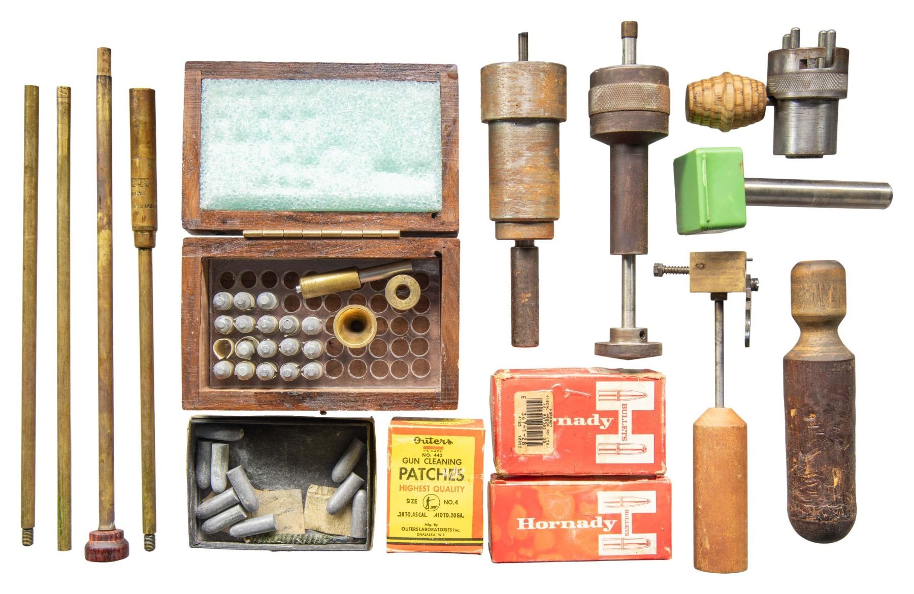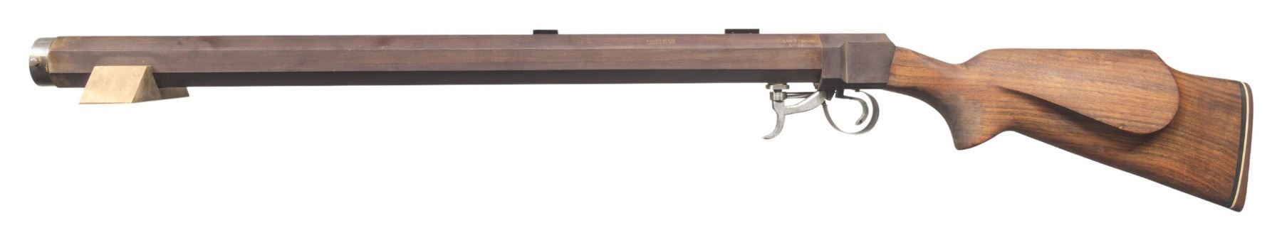 GUN. Cal. .4450 with 1/10 twist. NSN. Bbl. 27 1/2" octagon measuring 1 7/8" across flats. Muzzle is cut for a ball starter. Top flat has bases for a target scope. Left flat is marked "H. LLOYD RESOR / UNION CITY IND." followed by bore and twist markings. Underhammer action, main spring forms the trigger guard. Monte Carlo cheekpiece walnut stock with a Savage thin brown rifle pad. Forward portion of barrel is held by a 5" by 1 3/4" brass block with tapered sides with the builder's name and address. is also marked "RE-CUT 1982". UNATTACHED ACCESSORIES: wooden box holding 17 paper-patched bullets along with brass seating dies and a small brass funnel. A small cardboard box contains 10 additional lead bullets. False muzzle, bullet starters, brass cleaning rod, a partial box of Hornady .416 caliber 400 grain round nose bullets and a box of Outer's No.4 patches are also included. CONDITION: barrel retains 80% of a browned finish. Functioning lock and trigger. Stock has a dark oiled appearance. Very good bright bore. Weight is approximately 26.5 lbs. PROVENANCE: From the Buckstix Collection. (01-28643/DS). ANTIQUE. $1,500-2,500.