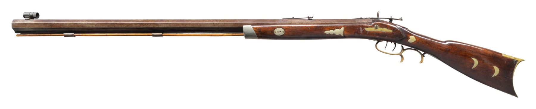 RIFLE. Cal. 38. NSN. Per "American Gunsmiths" by Frank Sellers, David Hudson operated in Napolean, Ohio 1875-1896. Oct. 35" barrel measuring 1.19" across flats. Modern globe front sight (missing post), semi buckhorn rear sight, & additional 5" long staff originally for tang sight welded into a large notch. Percussion lock has "R.B." in scroll & brass shield around nipple. Wedge fastened walnut half stock w/ hardwood ramrod & pewter nose cap. Brass furniture includes finger curl triggerguard, toeplate, crescent buttplate & pierced & segmented patchbox. German silver ornamentation includes wedge escutcheons, spear tips, hearts, half moons & sideplate. CONDITION: barrel & lock has brown patina appearance with pitting around nipple, marks & pinprick corrosion. Stock has heavy varnish with spots of peeling & numerous dings & marks. Good bore with strong rifling. Appears mechanically fine. PROVENANCE: The Esteemed Norm Greenberg Collection. (01-27749/MD). ANTIQUE. $700-1,100.