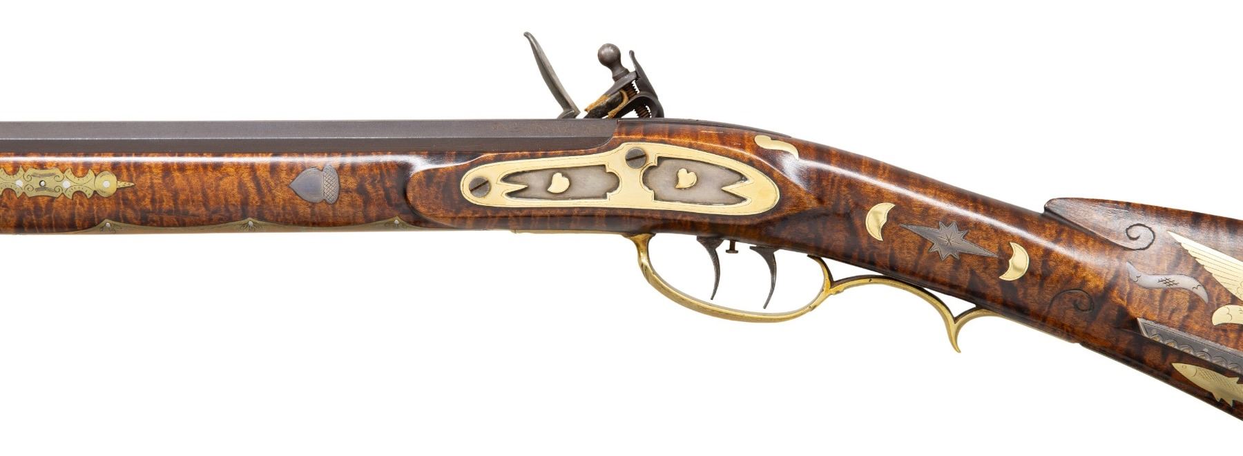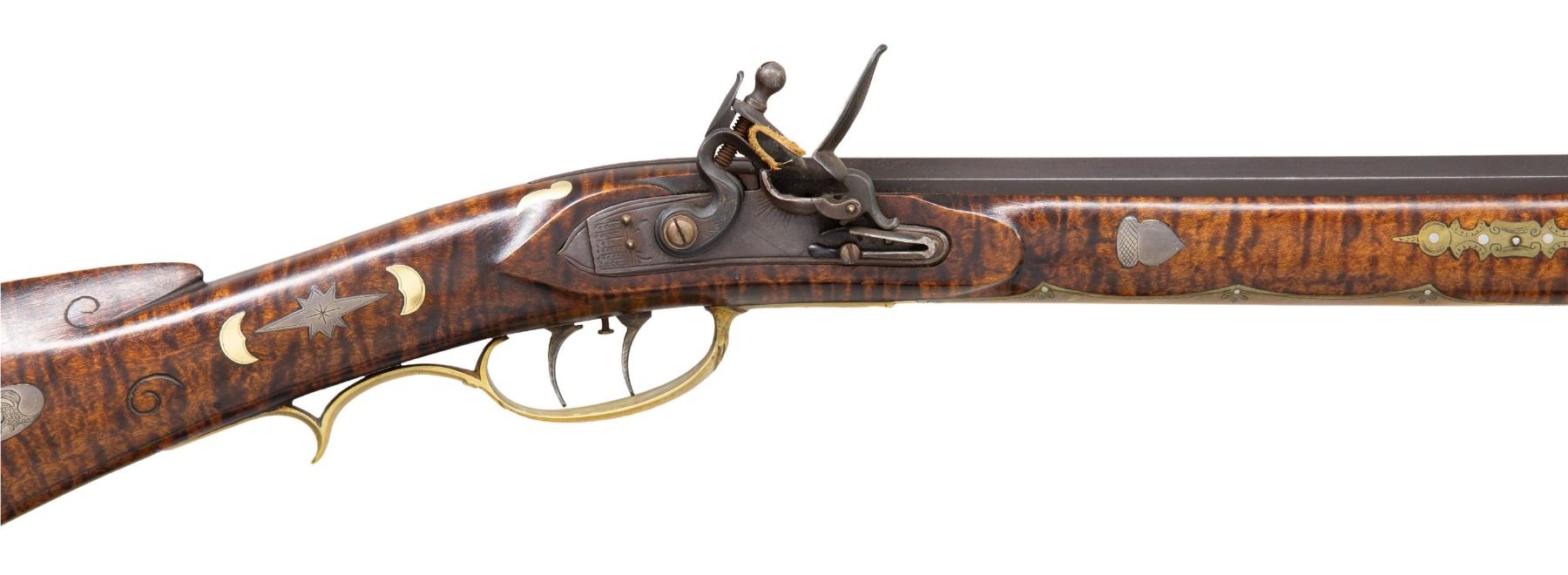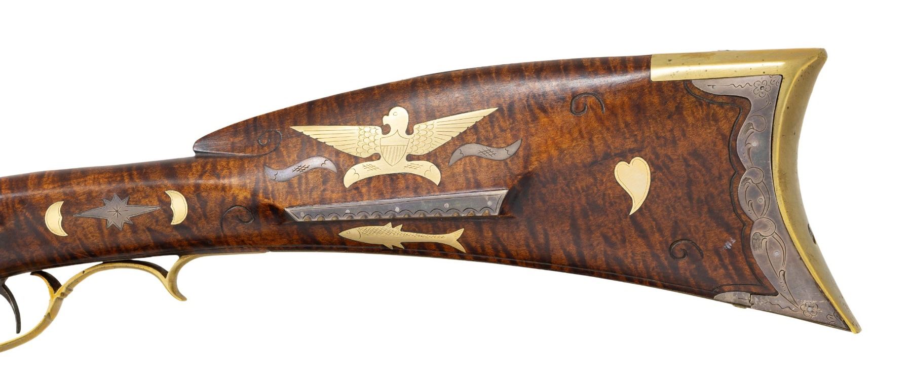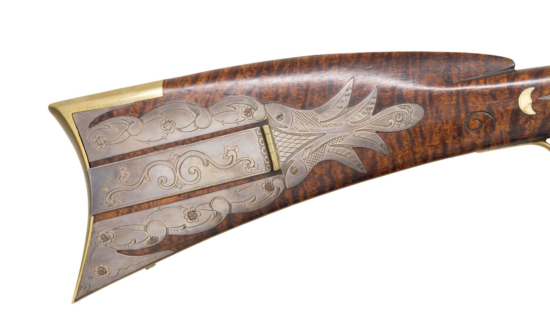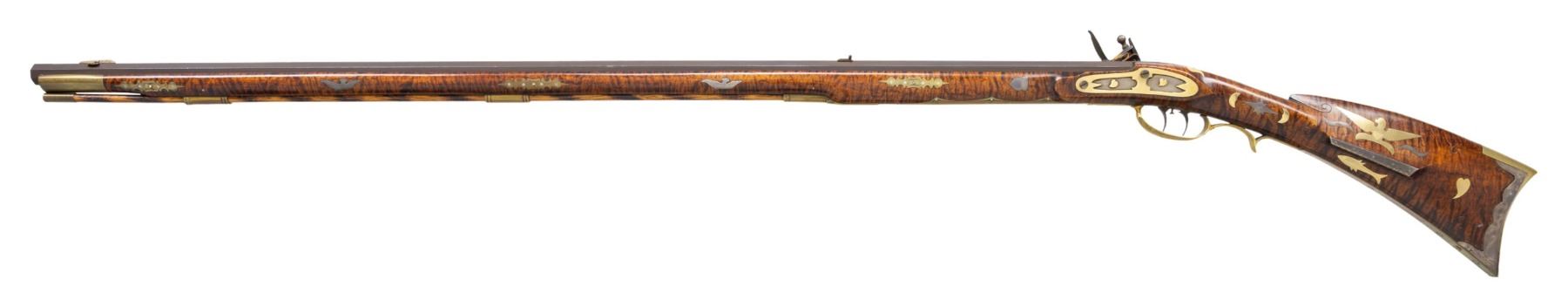 FLINTLOCK RIFLE. Cal. 45. S# 1670. Bbl. 42" octagon measuring 3/4" across the flats. Top flat is hand stamped "C. KEMPER" followed by S# "1670". Cornell Kemper (1952-2003) was a builder of late flintlock period long rifles. Breech end of bbl. and tang are lightly ornamented with scroll engraving. Silver blade front sight on a dovetailed winged base with fixed V notch rear sight. Engraved trade style lock. Double set triggers. Full length Roman nose cheekpiece pin fastened stock of fine curly maple. Right side has a segmented rectangular lid silver patchbox with pineapple style finial having extensive floral and geometric pattern engraving. Additional engraved silver inlay includes cheekpiece plate, 2 curved cheekpiece ornaments, left side heel plate, 8-point stars on either side of the wrist, and an oval plate at top of wrist. Roman nose has a pointed non-engraved silver inlay extending from the buttplate peak. Silver inlays on both sides of forearm consist of acorns forward of the action with flying pigeons between the faceted brass thimble and 2 faceted pipes. Forearm also has ornate engraved brass escutcheons on both sides of all 3 stock pins. Artificially striped brass tipped hardwood ramrod. Brass furniture consists of crescent buttplate, engraved finger curl trigger guard, engraved pierced sideplate, engraved pierced toe plate, and engraved forearm plate. Engraved gold plated inlays include an open wing eagle on the cheekpiece, with a fish below the cheekpiece, heart behind cheekpiece, 2 half moons on both sides of the wrist, and sideplate. Additional non-engraved gold plated ornaments are found on both sides of the tang. Both sides of top tang have small pointed brass ornamentation. Toeline along with butt and comb areas of stock have highlights of incise carving. UNATTACHED ACCESSORIES: a handwritten letter dated November 2, 1988 from C.J. Kemper, custom builder of Kentucky rifles from Ferdinand, IN. stating that he built this rifle in the fall of 1968. Also included is other letters, photos, and inventory information. CONDITION: fine. Bbl. and lock retain most of their original brown finish showing slight edge and carry wear. Original wood finish shows a few small marks. Silver inlays are beginning to acquire a pleasing mild tarnish. Toe of silver heel plate is broken thru the nail hole. Sound lock. Very good bright bore. (01-27947/DS). ANTIQUE. $5,000-8,000.