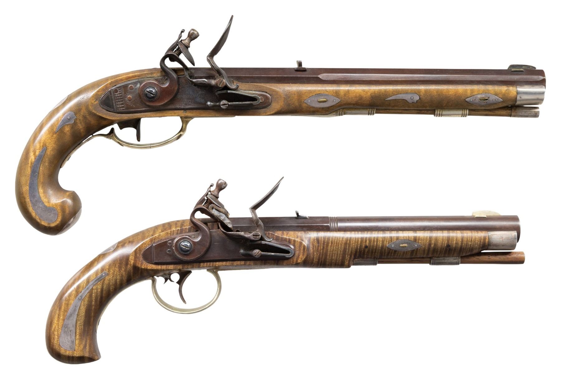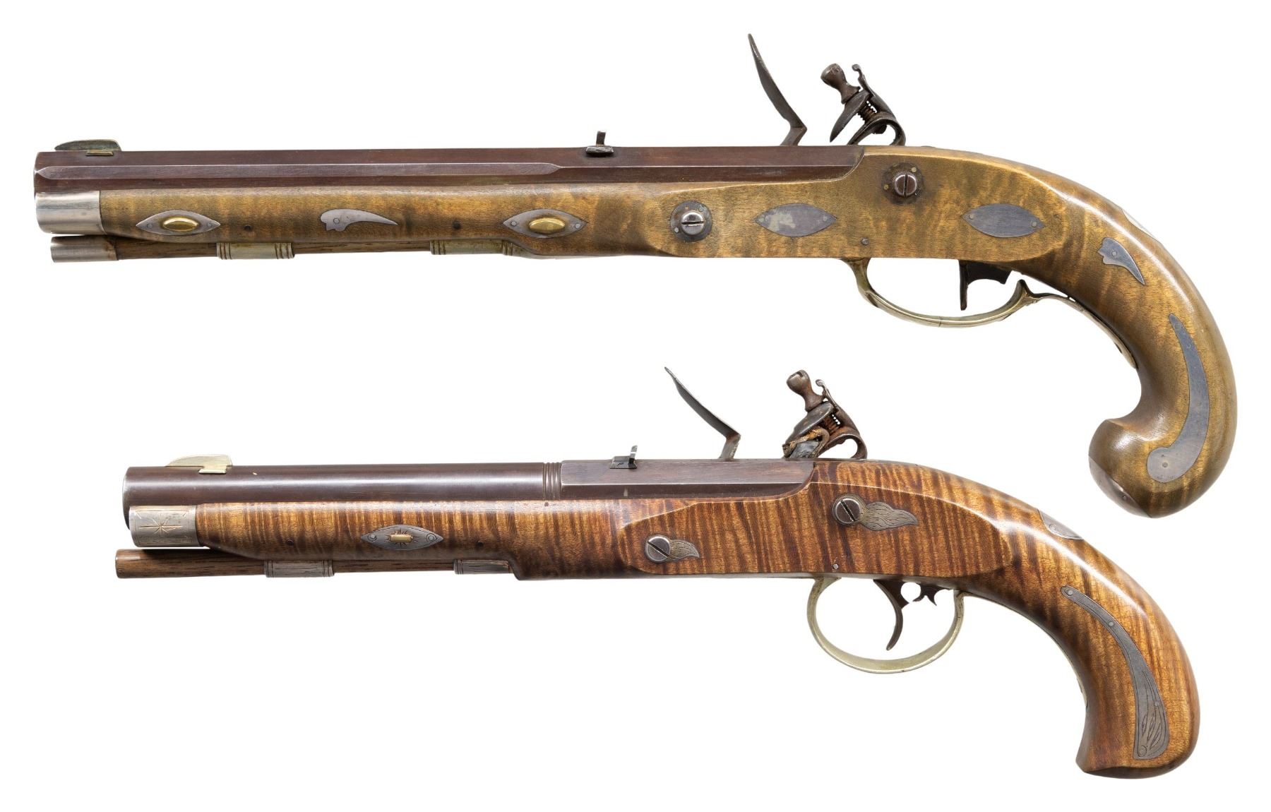 PISTOLS. Both: Cal. 45. NSN. Art Holly was an early builder of contemporary flintlock rifles and pistols who worked first in California and later Michigan. Research suggests that he passed away in the late 1960s. 1) Bbl. 10" with a 3 5/8" octagon shank transitioning to a fluted forward portion and returning to octagon configuration at the muzzle. Bbl. measures 13/16" across the flats. Dovetail mounted brass blade front sight with fixed V-notch rear sight. Top flat is engraved "A Holly". Trade style lock is apparently antique with partially visible markings that read "H.W. DE????/ & Co.". Plain trigger. Wedge fastened maple stock with forward sweeping rnd. butt. German silver fittings include oval shaped key wedges with oval shaped wedges in sideplate area, arrowhead shaped wrist plate, along with small decorative wedges on both sides of forearm and wrist, with larger decorative plates along the curved portion of the butt. Silver finished nose cap, thimble, and single pipe holding a iron tipped hardwood ramrod. Brass trigger guard. CONDITION: bbl. and lock retain over 70% browned finish showing areas of remaining pitting on lockplate with a crack through the pan area. Stock has good finish. Functioning lock. Bore shows spots of light pitting retaining strong rifling. 2) Bbl. 8 3/8" octagon to rnd. with a faceted transition. Top flat is engraved "A Holly". Dovetail mounted brass blade front sight with fixed U-notch rear sight. Unmarked trade style lock. Wedge fastened rnd. butt stock of fancy curly maple. Engraved brass trigger guard has an acorn finial. Engraved silver finished fittings include pierced back strap and butt cap plate, wrist plates, sideplate escutcheons,oval wedge escutcheons, and nose cap. Hardwood ramrod is held by an engraved acorn finial thimble and single pipe. CONDITION: bbl. and lock retain over 70% lightly faded browned finish. Stock finish shows small marks. Functioning lock. Bore shows small spots of pitting and retains strong rifling. UNATTACHED ACCESSORIES: 19 1/4" x 11 3/4" x 4 7/8" converted ornate mahogany silverware case with added green felt lined fitted interior. Case contains small pewter powder flask, glass oil bottle, small brass funnel, a horn handled patch knife, rattle snake carved powder measure, fourteen 50 caliber rnd. balls, and 2 spare flints. (01-27916/DS). ANTIQUE. $2,250-3,500.