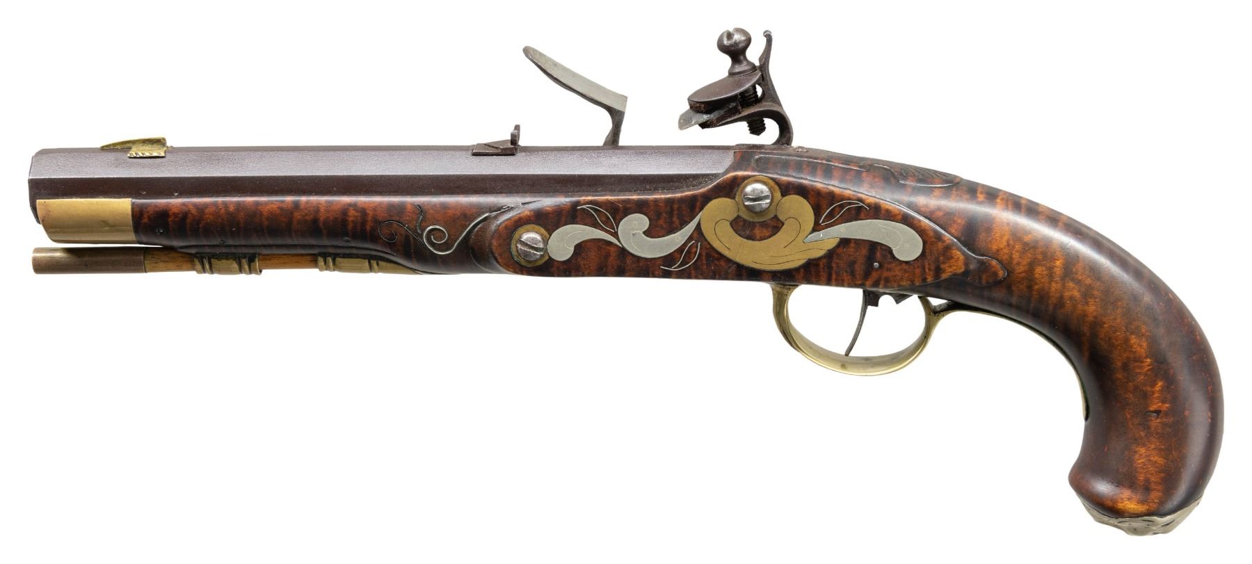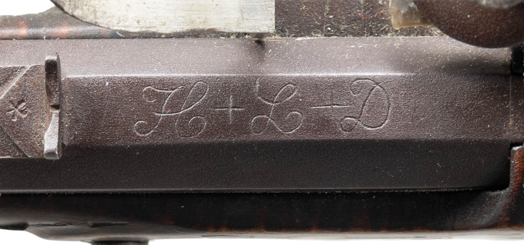 Cal. 40. NSN. Bbl. 7 5/8" octagon measuring 3/4" across the flats. Top flat is engraved "H + L + D". Guns built by Homer that were not finished had the "H+L+D" markings. His finished guns were marked "H+L+Dangler". Dovetail mounted brass blade front sight with fixed U-notch rear sight. Unmarked trade lock. Lock and bbl. have a browned finish. Pin fastened rnd. butt stock of curly maple. Silver finished fittings include a grotesque mask butt cap, woman's portrait on bottom of forearm, with curled ornaments fore and aft of the brass sideplate as well as bottom of stock in forearm areas had some silver wire inlay. Stock has an area of relief carving behind the tang with drop points extending from the lock and sideplate areas. Brass fittings consist of the trigger guard, nose cap, thimble, and single pipe. Brass tipped hardwood ramrod. UNATTACHED ACCESSORIES: non-related letter and photos from Dangler regarding one of his rifles. CONDITION: bbl. retains most browned finish. Stock shows light wear and handling marks with areas of missing wire inlay along bottom and forearm sides. Sound lock. Bore has a lightly frosted appearance retaining strong rifling. (01-27957/DS). ANTIQUE. $1,400-2,200.