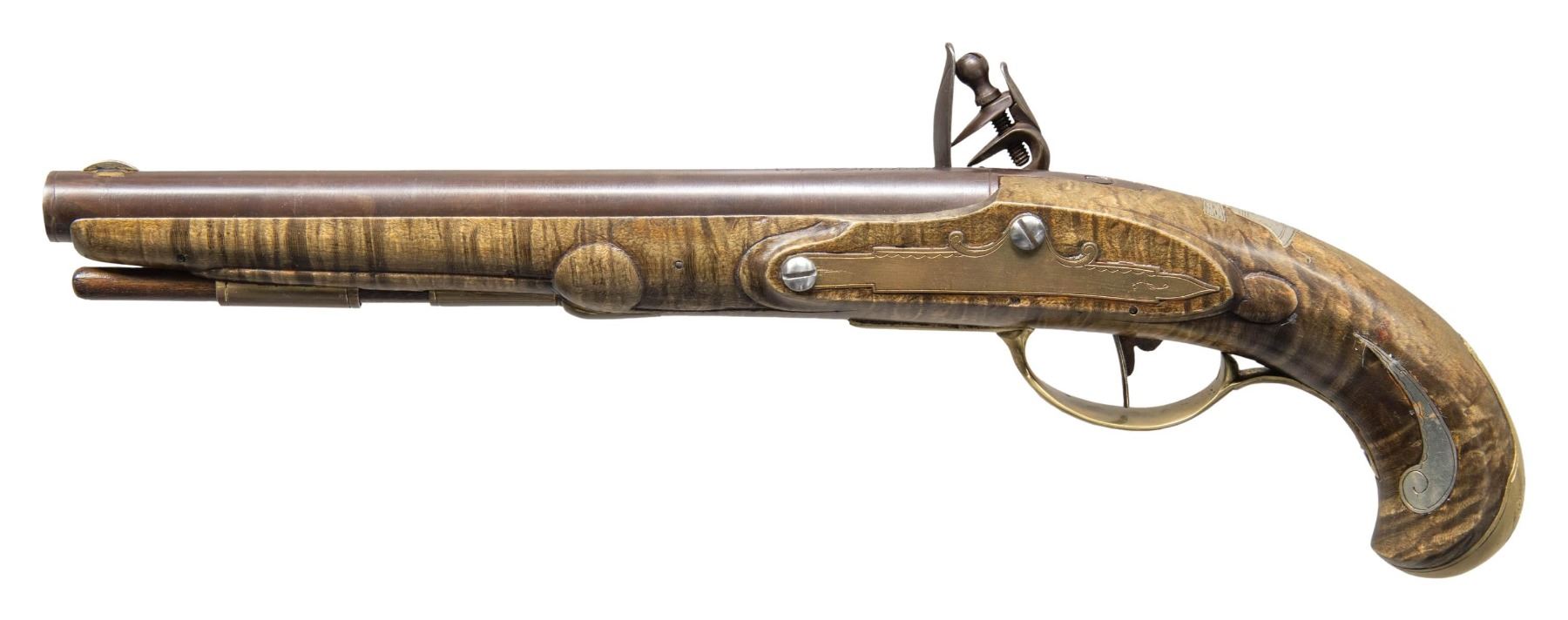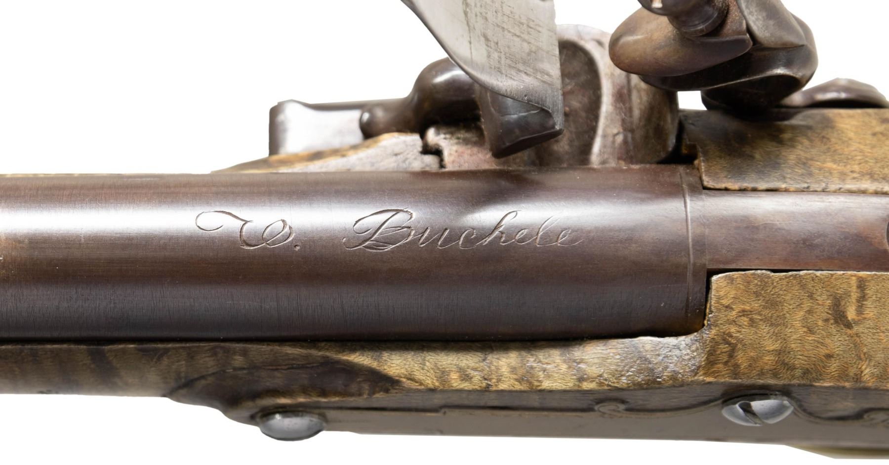 Cal. 45. NSN. Bbl. 9 1/2" tapered round with German silver blade font sight is engraved "W. Buchele". William Buchele, 1895-1977, was a renowned builder of contemporary flintlock and percussion rifles and pistols. He is known as a a co-author of the book "Recreating the American Long Rifle". with George Shumway and Peter Alexander. The engraved trade lock is marked "MASLIN / WARRANTED". Plain trigger. Pin fastened curly maple stock has relief carving around the lock, sideplate, thimble and ramrod channel areas. Engraved German silver ornamentation consists of a Liberty Bell on the wrist and sharply pointed curled ornamental plates on both sides of the wrist. Long tang rounded brass butt cap has floral pattern engraving. Additional brass fittings include the trigger guard, engraved sideplate, thimble and single pipe holding the hardwood ramrod. CONDITON: fine. Bbl & lock retain most of their finely browned finish. Very good stock finish shows small spot of staining on left wrist. Forward leading points of the ornamental wrist plates are bent causing sharp protrusions. Sound lock. Very good bright bore. (01-27950/DS). ANTIQUE. $1,750-2,500.