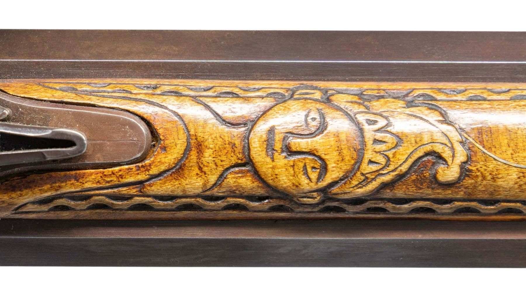 FLINTLOCK RIFLE. Cal. 45. NSN. William Buchele 1895-1977 was a renowned builder of contemporary flintlock & percussion rifles & pistols in the 1960's -1970's. He is known as a co-author of the book "Recreating the American Long Rifle" with George Shumway and Peter Alexander. Bbls. 32 1/2" octagon measuring 3/4" across the flats. Top flats are marked "W. Buchele". German silver blade front sights with fixed U notch rear sights. Breech ends have unmarked pan & frizzen plates with german silver top flat plates stamped 1 & 2. Unmarked iron lock is border line engraved. Curled plain trigger. Roman nose cheek piece stock of fine curly maple has extensive relief carving in the cheekpiece, comb & wrist areas with additional relief carved points behind the lock & sideplate. Right side has a rectangular lid brass patch box with floral finial having light coverage of floral & line engraving. Additional brass stock fitting consist of the crescent buttplate, toeplate, trigger guard & sideplate. The cheekpiece has an engraved 8 point German silver star highlighted by wire inlay simulating rays of sun. The bbl. section has full length brass tipped curly maple side panels. Right panel features a relief carved native American woman highlighted by curled wire inlay and chain carved borders. Forward portion has a faceted brass thimble and 2 faceted brass pipes holding the brass brass tipped hardwood ramrod between moldered borders. Left panel has incise carved double line borders with German silver pipe & thimble escutcheons highlighted by curled wire inlay. Weight 8 lbs. 14.4 oz. CONDITION. near excellent. Finely browned metal shows light carry & edge wear. Stocks have very good finish showing a few small marks. Sound action. Very good bores. (01-27920/DS). ANTIQUE. $3,500-5,500.