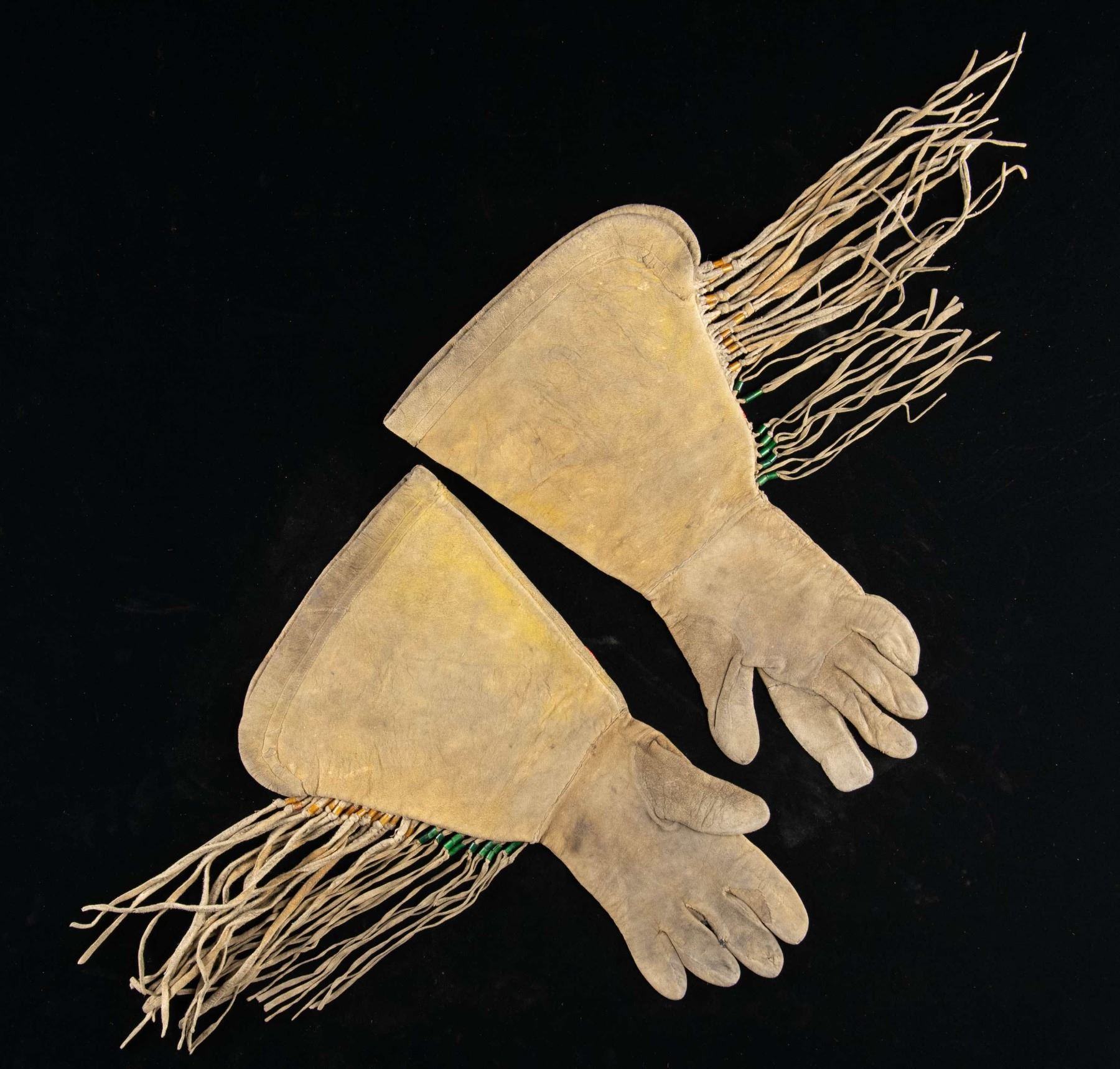 GAUNTLETS.These exceptional gauntlets likely date from the later 1800s and measure about 16" in length by about 9 1/2" at the cuffs. The fringe extends 9" from the body of the gauntlet. Both gauntlets are expertly decorated with very tightly spaced glass beads forming a spray of stylized flowers. Beading colors include light blue, orange, pink, blue, red, white, green and more. The base of the fringe has either orange or green tubular beads adding to the intense variation of color used in the decoration of these fine heavy gauntlets. They likely originated in the Northern Plains, possibly in the Dakota region. CONDITION: gauntlets are well worn, but exceptionally solid and complete. Only a very small number of beads are missing from the decoration on one of the gauntlets. (02-26085/BF). NON-GUN. $600-900.