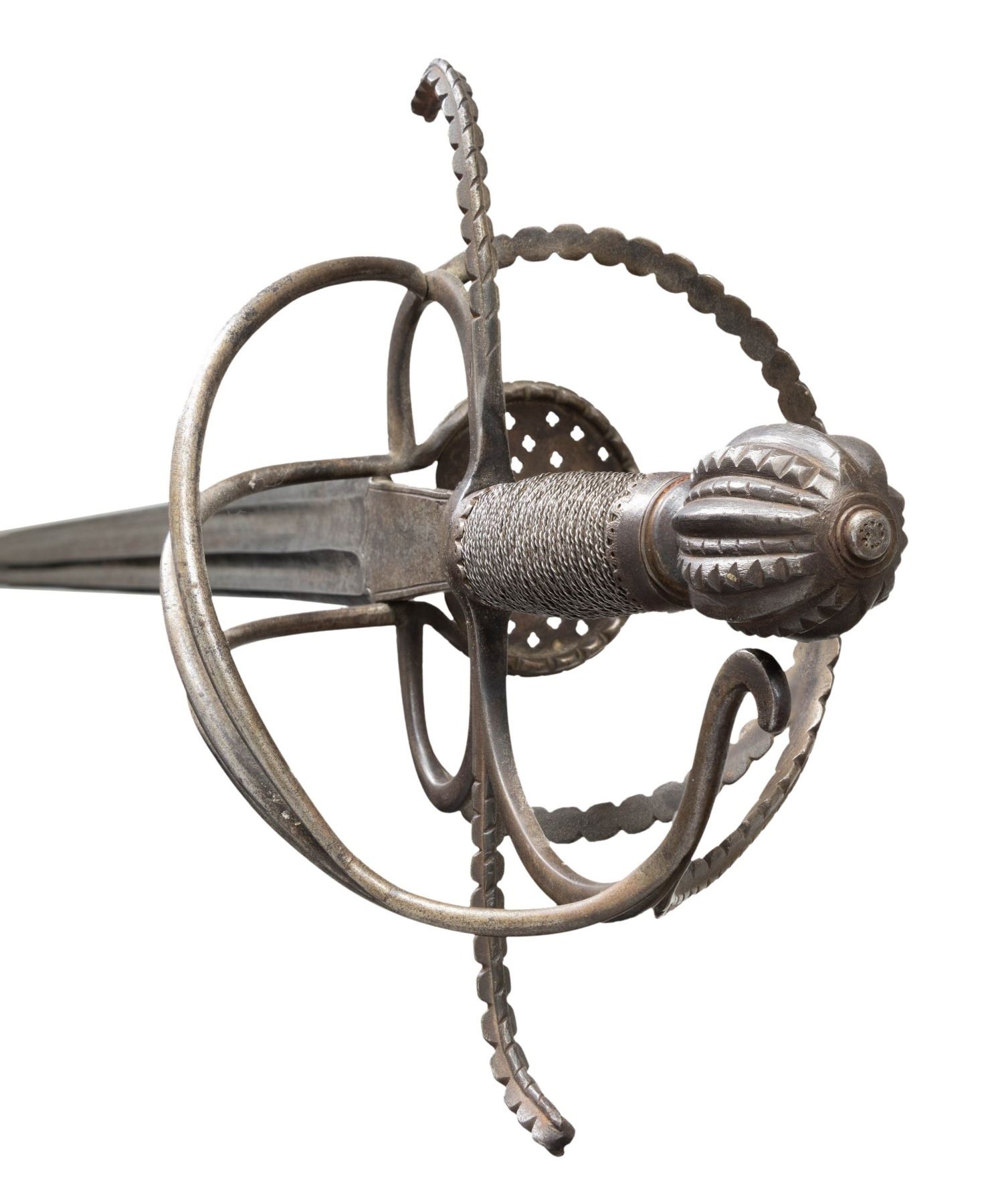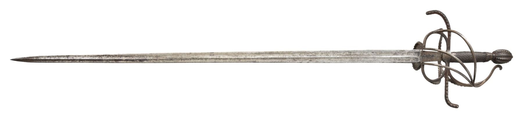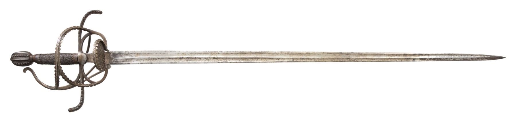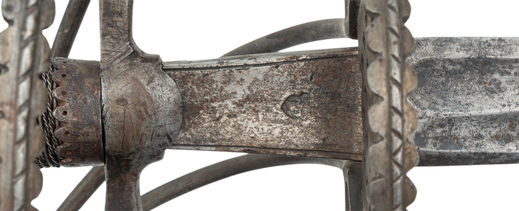 This interesting broadsword is 46" in overall length with a 37.5" double edged blade with double wide fullers and fine central ridge. The armorers mark is found on the border engraved ricasso. The guard features a single plated side ring that is pierced with small cross patterns. Double arms attach to the S shaped hilt. A serpentine knuckle bow branches into the loop guard and counterguard bars. The pommel is fluted and file decorated en suite with the loop guard, side ring & S shaped hilt. The grip is wire wrapped with stylized ferrules. CONDITION: Metal surfaces have a mottled grey patina. Blade edge is good with slightly blunted tip and a mild bend. Nicely struck armorers mark. PROVENANCE: Estate Collection of Nicholas Apergis (02-24757/ZAL) $3000-5000