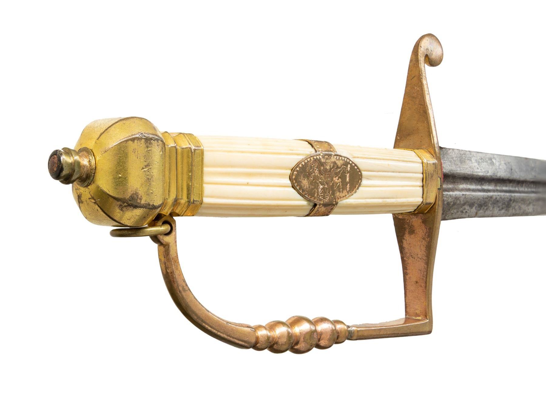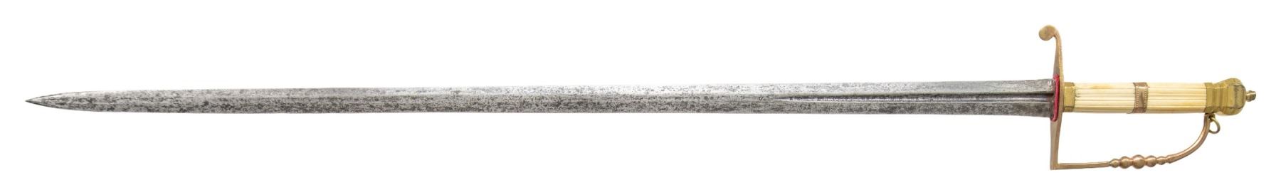 SPADROON.A seldom seen British sword of the East India Company measuring 36 1/2" overall with a 30 1/4" blade featuring a central 8 1/4" fuller that reads in the valley "XX ARNOLDT XX BRACH XX SOLINGEN XX" on one side and "XX ARNOLDT XX BRACH XX ME FECIT XX" on the other. The hilt is gilded brass with a plain crossguard and drop quillon. The knuckle bow is a five ball design with a lanyard ring at the top. A faceted pillow pommel topped the reeded bone grip. The center of the grip has a gilded brass band with an oval on the front bearing the lion of the British East India Company. It is quite likely that this is an earlier family blade utilized by an officer of the EIC as a tribute to his ancestors. No scabbard. CONDITION: blade has a mottled gray patina. The hilt retains a substantial amount of its original gilded finish. The grip has a few tight age cracks from drying. (02-26068/BF). NON-GUN. $1,000-1,500.