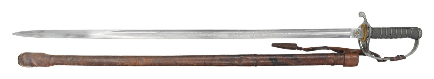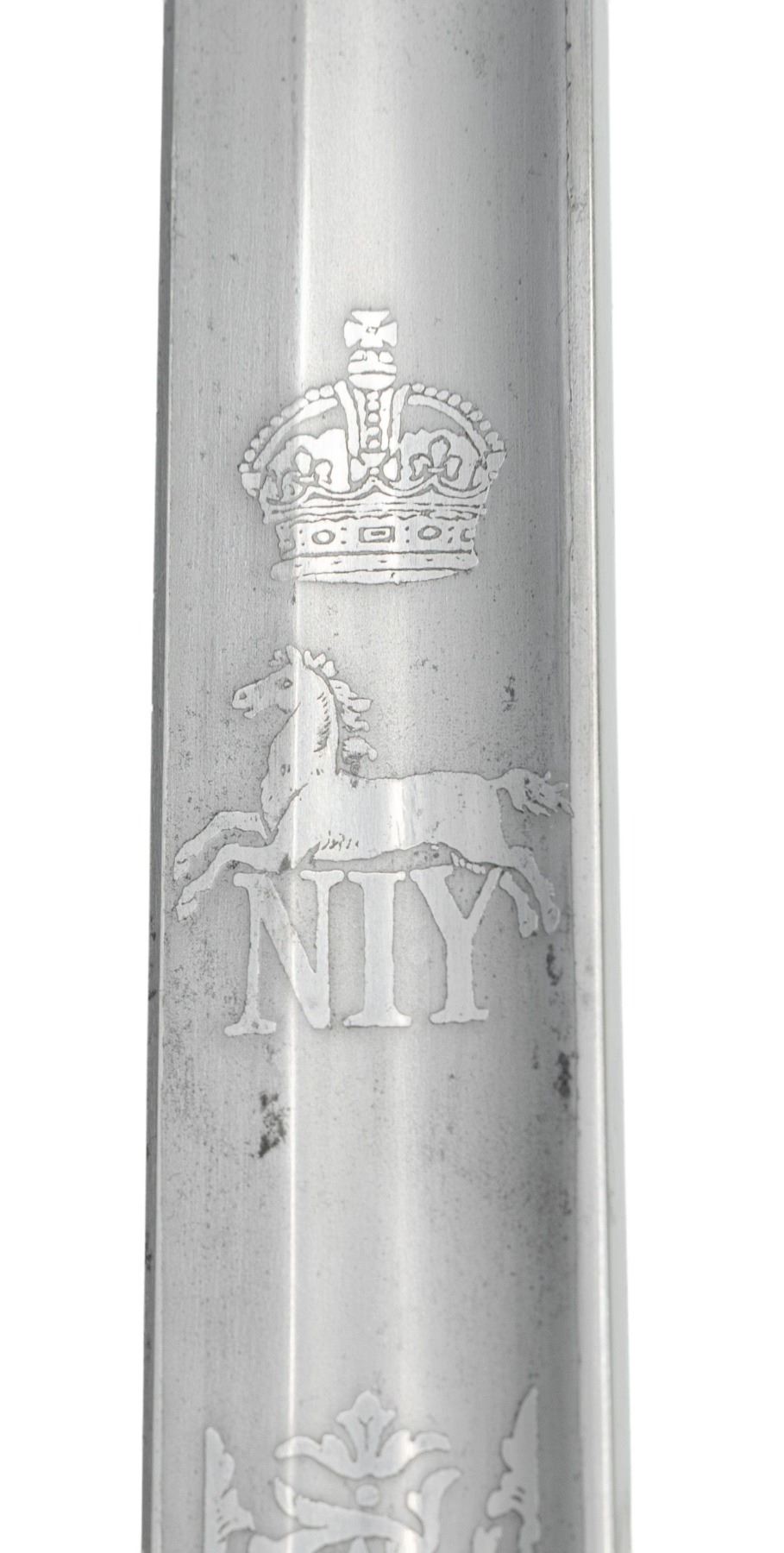 NORTHHAMPTONSHIRE IMPERIAL YEOMANRY.This saber was carried by a short lived British Cavalry unit called the Northamptonshire Imperial Yeomanry from 1902-1908. The saber's overall length is 41 1/2" and the etched blade measured 35 1/4". The etching includes a crowned horse over " NIY ", a crowned " ER VII ", along with foliate panels. The ricasso is marked " WILKINSON SWORD COY * LIMTD * LONDON " with a PROVED " medallion inside a six pointed star. Steel hilt with a two branch guard and a drop quillon. crosshatched pommel and backstrap. Wire wrapped sharkskin grip with the original leather sword knot attached. Brown leather covered iron scabbard. CONDITION: blade shows nearly all of the original factory polish with a tiny bit of staining. Hilt shows very light wear. Knot is solid. Scabbard shows wear to the leather and the two suspension rings are missing. (02-26074/BF). NON-GUN. $800-1,200.