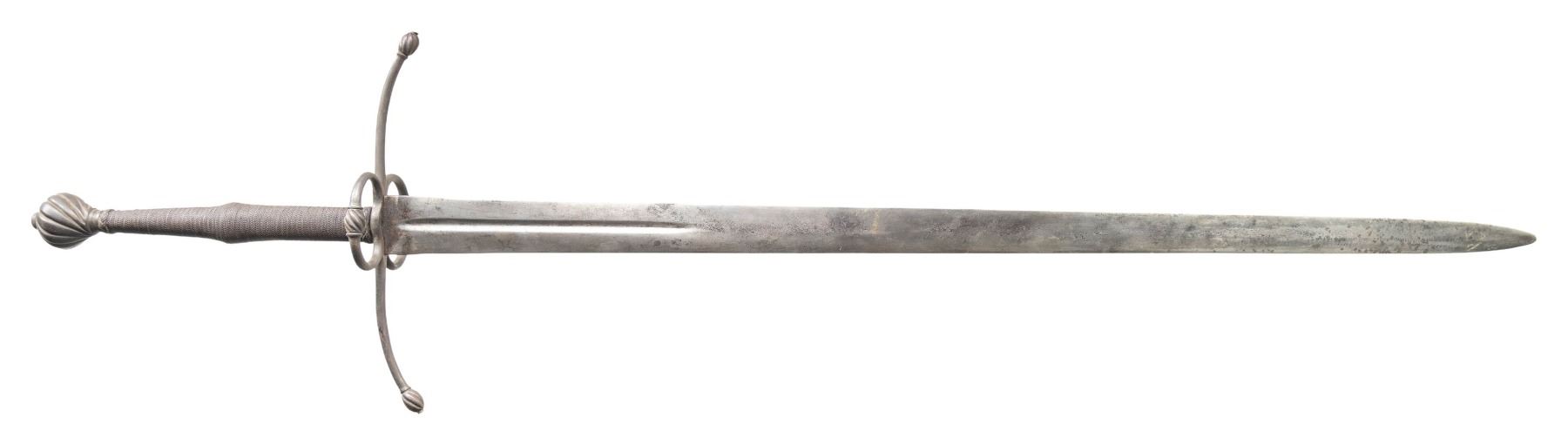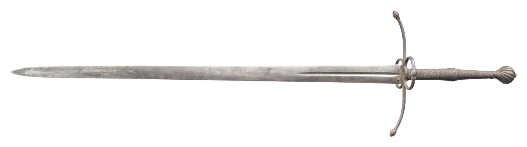 Measuring in at 50" overall with a 38.5" double edged blade that is 2" wide at the ricasso. The blade has a 10"fuller extending 1/2" from the ricasso. The upward sweeping bar crossguard terminates with spiral fluted melon quillion tip. Two side rings branch from the crossguard with central fluted melon finials. The swelled two handed grip is wire wrapped with turkish knot ferrules and terminated with a spiral fluted scent stopper pommel. CONDITION: Metal surfaces have a cleaned grey patina with a few minor knicks on the blade edge. PROVENANCE: Estate Collection of Nicholas Apergis. (02-24724/ZAL) $2000-3000