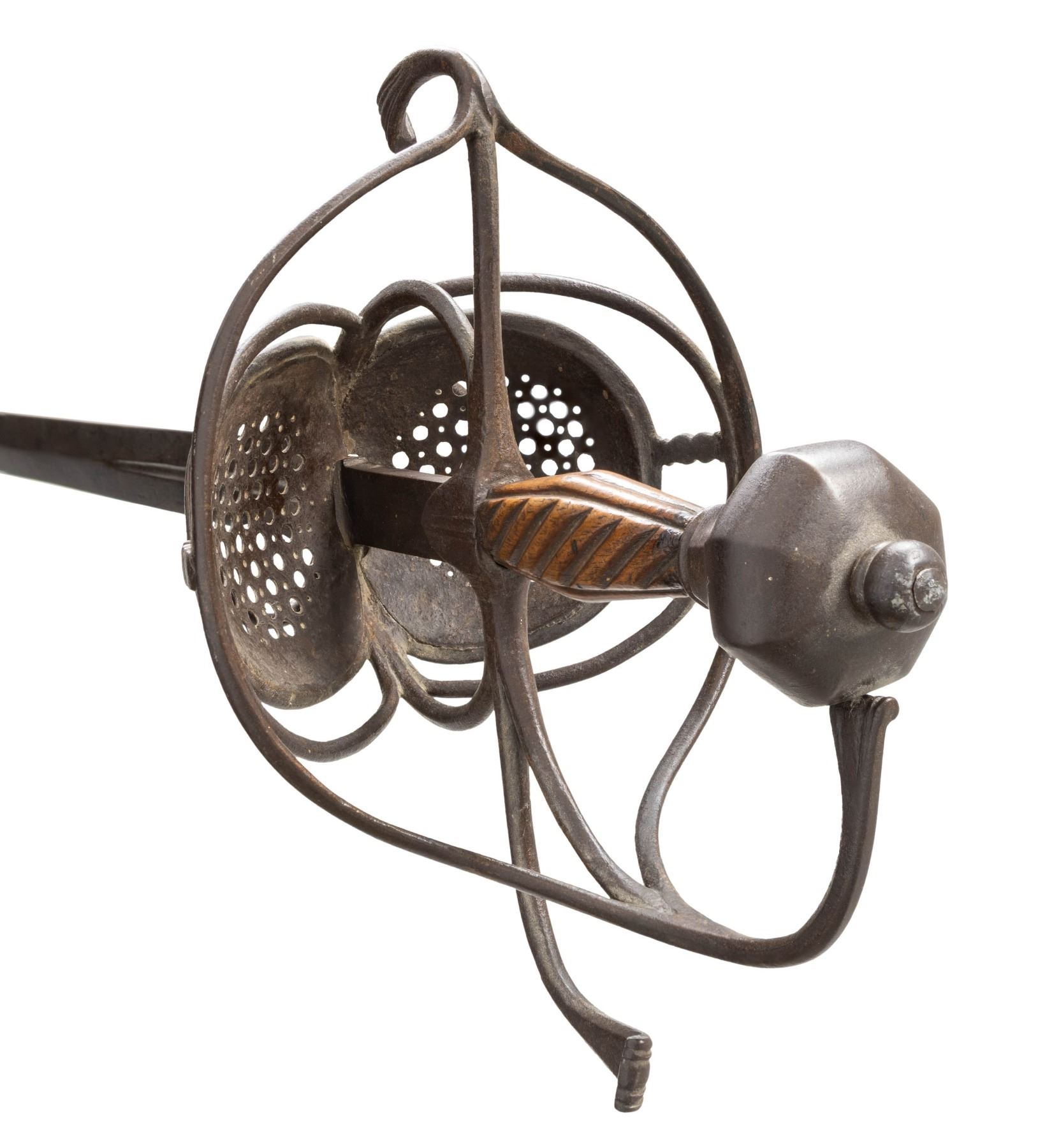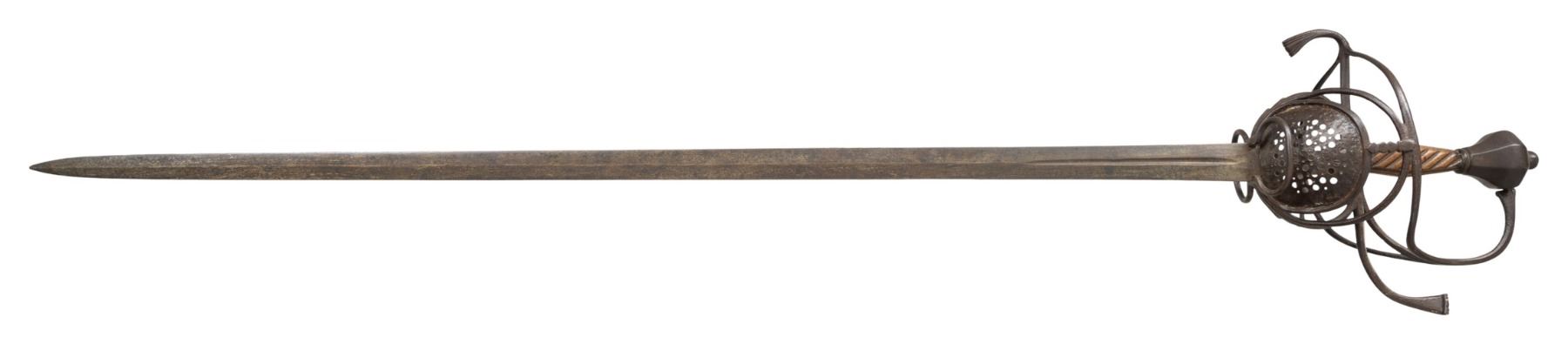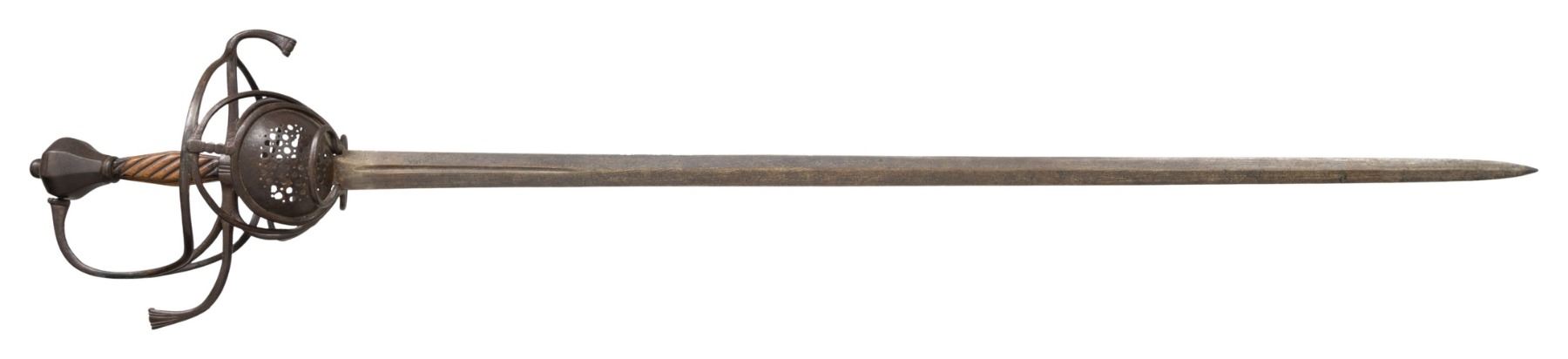 Overall length is 48" with a 38.5" diamond shaped double edge blade with a 6.75" fuller. The knuckle bow begins at the faceted pear shaped pommel and double branches with large loops into the S shaped hilt with flattened stylized quillions. Double arms extend with concentric bar loop guard branches. The forward branches of the loop guard is filled with pierced double lobe plates. The piercings are stylized with two sizes in an alternating pattern. The guard finalizes with double side rings. The swelled grip lost its wire and a carving was added to the remaining walnut grip. CONDITION: Metal surfaces have a dark patina. Blade has a good edge with a slightly rounded tip. Grips show some minor dents and scratches. PROVENANCE: Estate Collection of Nicholas Apergis (02-24752/ZAL) $3000-4000